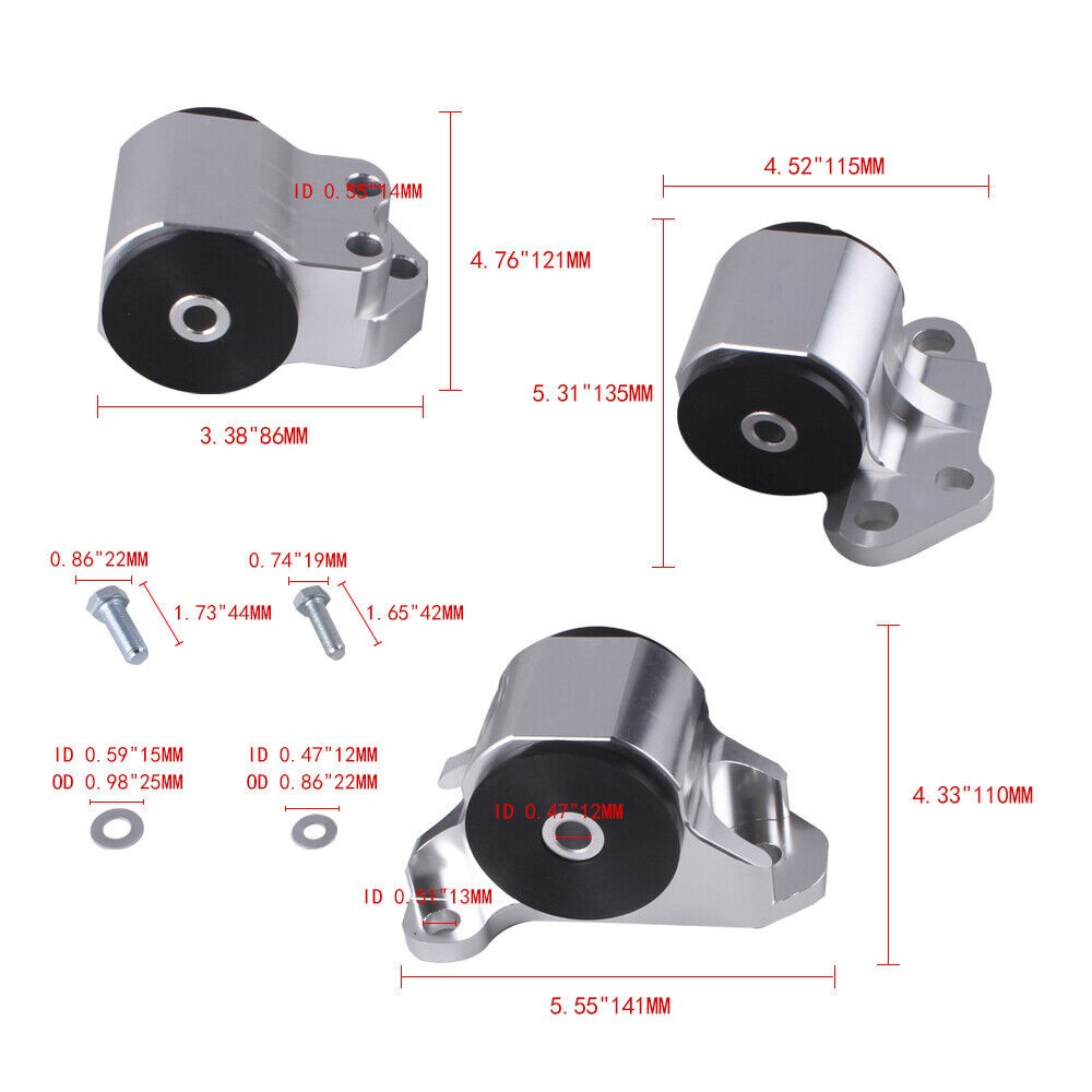 SPECIFICATIONS: Type: Engine Mount Color: Silver Material: Aluminum FEATURES: 100% Brand New and Never Used or Installed Will lessen motor & transmission movement during higher revs allowing more power out of the engine Reduces wheel hop while improving acceleration & shifting from the transmission With the stiffer mounts, can increase traction and instant torsional moment, to reduce the movement of engine. Direct replacement of current motor mounts. Includes both sides (driver & passenger side). FITMENT: Fit for Acura Integra 1.8L with B & D Series motors (3-bolt type) 1994-2001 Fit for Honda Civic 1.5L with B & D Series motors (3-bolt type) 1992-1995 PACKAGE INCLUDE: 1 x Engine Mounts Kit All accessories in the picture are included. NOTE: 1.Please confirm your address is correct 2.Please check the size measurement and the picture carefully before making payment. 3.Please allow 0.5-1 inch difference due to manual measurement. (1 inch=2.54cm) 4.Due to the difference between different monitors, the picture may not reflect the actual color of the item. Please understand, Thank you. 5.We will not accept the return if the item damaged by the buyer's operational errors. Payment Delivery details Return Policy About us Contact us Payment We will only ship to eBay confirmed shipping addresses. It is buyer responsibility to provide correct shipping address before purchasing. Buyer is responsible for any reshipping cost due to wrong or undeliverable addresses. Delivery details Items are shipped within 1-2 business days of receiving payment verification. Domestic shipping fees are applied to the lower 48 Continental States only (AK, HI, GU, PR, VI, Base Addresses, may require additional shipping cost) Please e-mail us for a shipping quote. INTERNATIONAL shipping available through eBay's global shipping. But Buyer might pay some VAT and Duties; seller is no responsible with any VAT and Duties. Deliveries are generally done within 3-5 business days nationwide and 10-20 days worldwide. Damaged item due to shipping must reported to us within 48 hours of delivery in order to place claim with shipping company. Return Policy No returns or exchanges once item has been installed, used or modified. We will exchange the item only if is defective or if customer receive the wrong parts. Returns and/or exchanges must be done within 30 days from delivery date. All returns and/or exchanges must be in brand new/uninstalled condition. About us Always Free Shipping with your Parts orders. Lowest price on brand new, in-the-box auto parts. Business time is Monday - Saturday 8:30 am to 5:30 pm HKT except all Holidays. Contact us Always Free Shipping with your Parts orders. Lowest price on brand new, in-the-box auto parts. Business time is Monday - Saturday 8:30 am to 5:30 pm HKT except all Holidays.