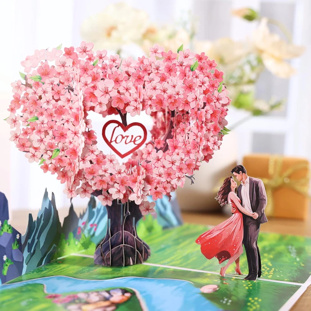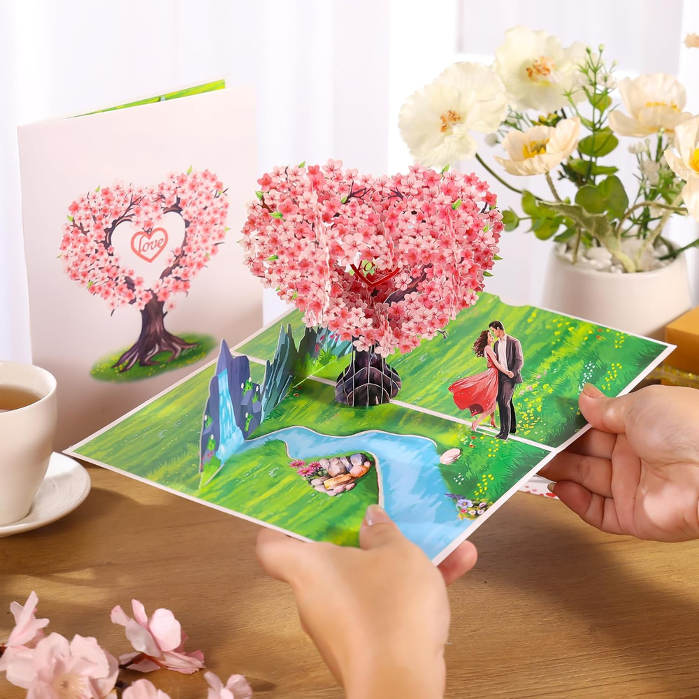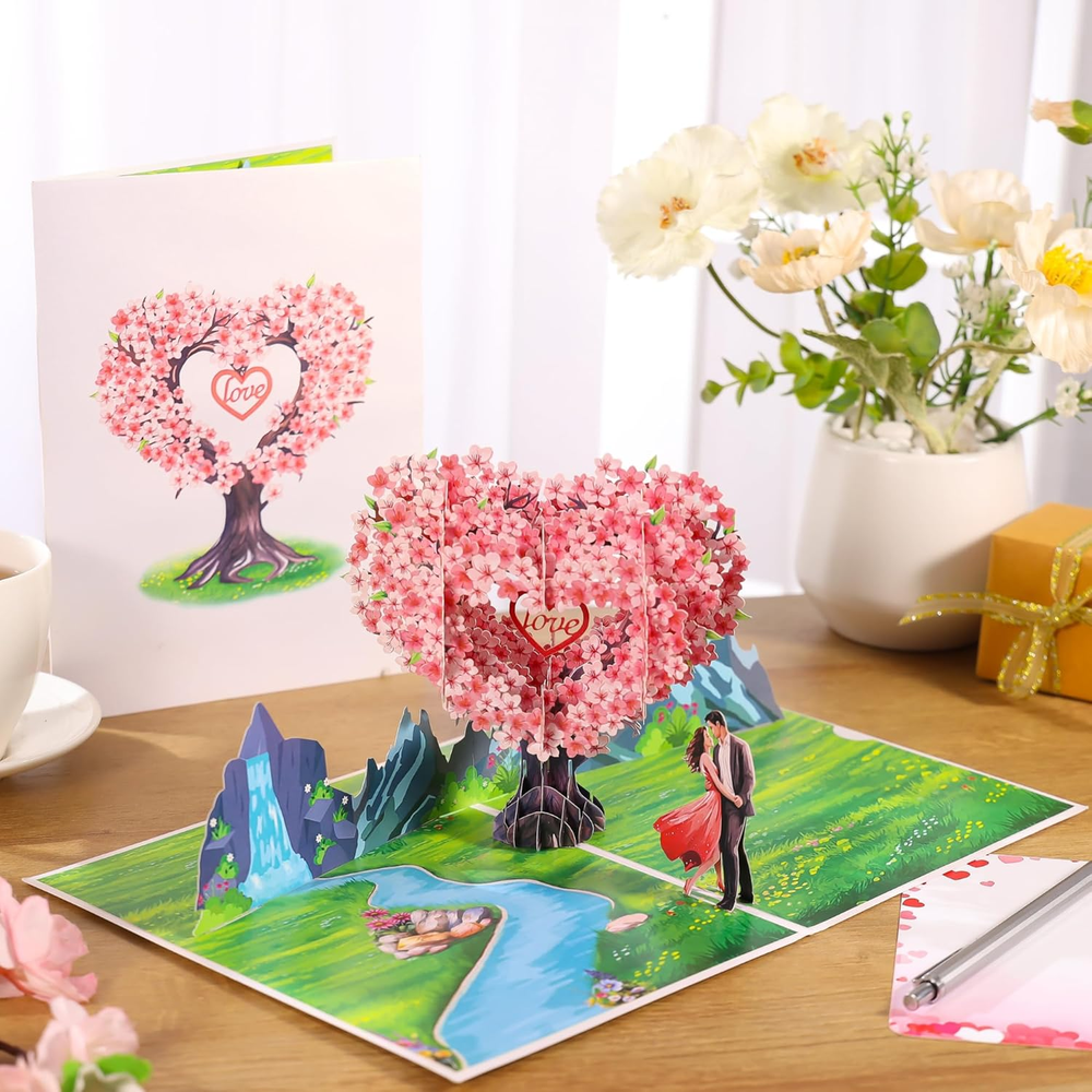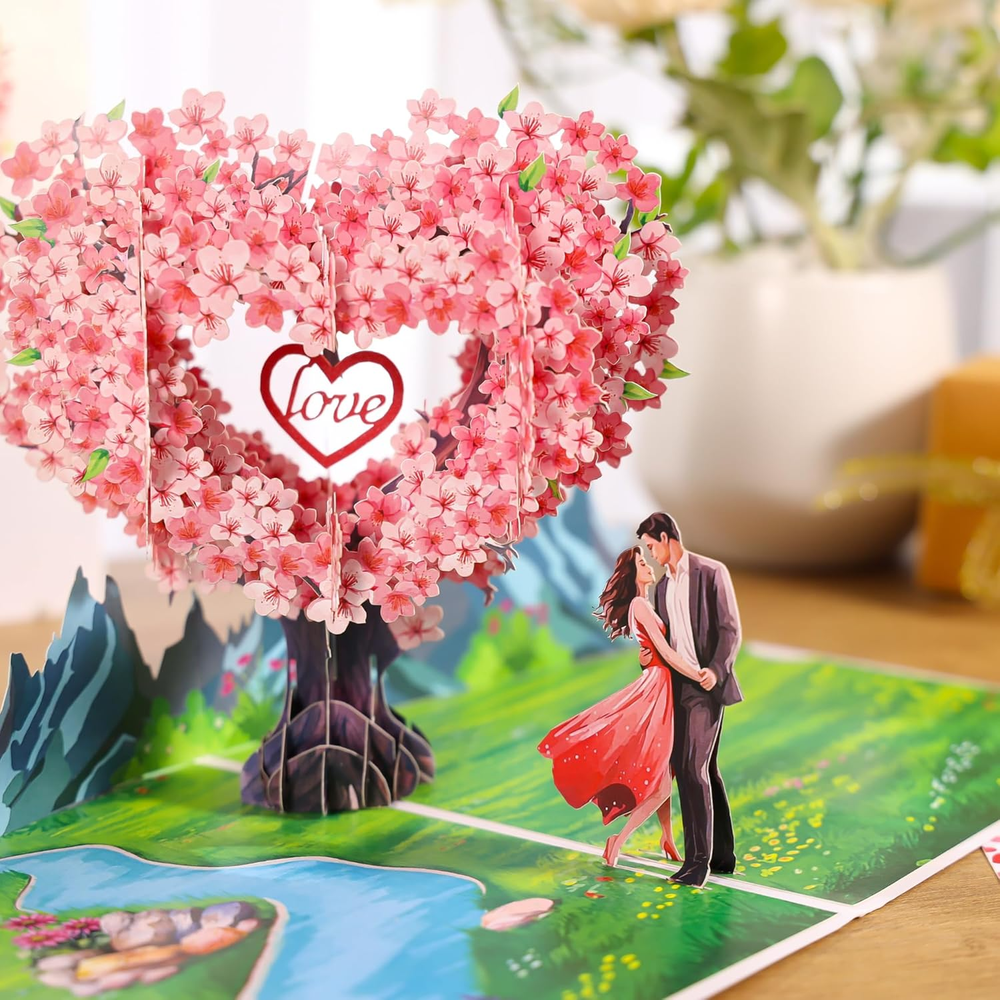 Heartfelt 3D Scene: A loving couple stands by a gentle river surrounded by nature, mountains, and cherry blossoms, creating a warm and dreamy setting that comes alive when opened. A Heartfelt Surprise: Beneath the tree, a loving couple is depicted embracing on a charming bridge, creating a picturesque and emotional scene that celebrates love. This card doubles as a keepsake display, reminding the recipient of your thoughtful gesture. Perfect Gift for Special Occasions: Ideal for Valentine’s Day, weddings, anniversaries, or couple’s birthdays. Express love to your spouse, partner, parents, or friends in a unique and touching way. Personalized Touch: Includes a slide-out note for you to pen heartfelt messages, allowing you to add a warm, personal touch to your gift. This feature ensures your love and care are expressed in a truly unique way. Love Card with Envelope and Note: Package Contents 1 Pop-up Card(6x8 inches) +1 Envelope +1 Note tag. This 3D pop-up greeting card is the perfect choice if you want a unique and memorable gift. Product description Show your love. Share your heart. Celebrate life’s most beautiful moments with this exquisite 3D pop-up card. Make Every Moment of Love Unforgettable This Romantic 3D Pop-Up Peach Blossom Card goes beyond paper and ink; it’s a celebration of love, designed to create smiles, memories, and lasting impressions. Perfect for Loved Ones An ideal choice for husbands, wives, couples, boyfriends, and girlfriends, this card is perfect for expressing your love on special occasions such as Valentine’s Day, weddings, anniversaries, or couple’s birthdays. Large Size With Slide-out Note This Romantic 3D Pop-Up Peach Blossom Card with a slide-out note for a personalized message, allowing you to convey your feelings in a heartfelt and intimate way. Versatile Use Cases This enchanting card is perfect for a variety of occasions, making it a versatile addition to your greeting card collection. Use it to celebrate a wedding anniversary, where the beautiful 3D design can symbolize the love and commitment shared between partners. It serves as an ideal Valentine’s Day gift, allowing you to express your deepest feelings in a memorable way. Additionally, it can be a wonderful birthday card for your significant other, adding a romantic touch to their special day. The card is also suitable for commemorating milestones in relationships, such as a couple's first date anniversary or engagement celebration. Furthermore, it can be gifted to friends or family members who are celebrating their love, making it a thoughtful gesture that conveys your best wishes for their happiness. With its unique design and heartfelt message, this card is sure to leave a lasting impression on anyone who receives it.
