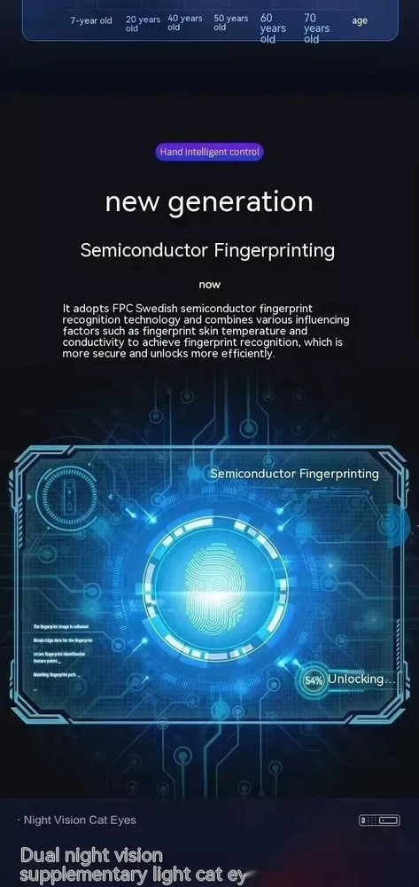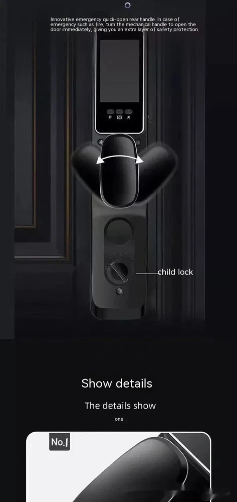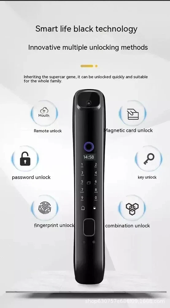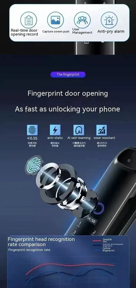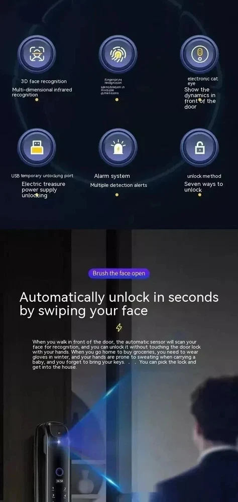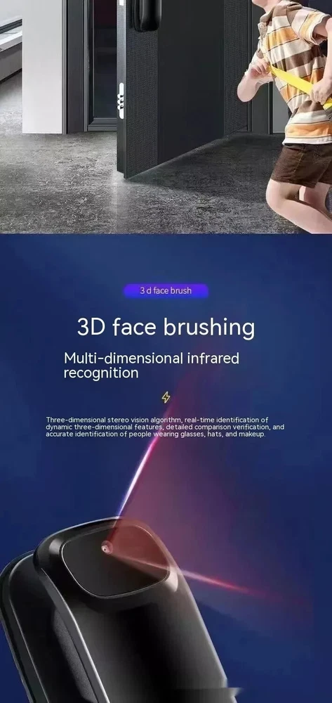 Power supply: 4200 milliampere lithium battery Face capacity: 100 Emergency power supply: USB power supply Password capacity: 100 Lock cylinder level: C-level lock cylinder Fingerprint capacity: 100 Panel material: zinc alloy Alarm support: door lock anti prying/multiple password input errors/low battery reminder Unlock method: face/password/remote/magnetic card/key/fingerprint Style: 3D facial recognition model Packing list: Fingerprint Door Lock 1 x pc Product Image: