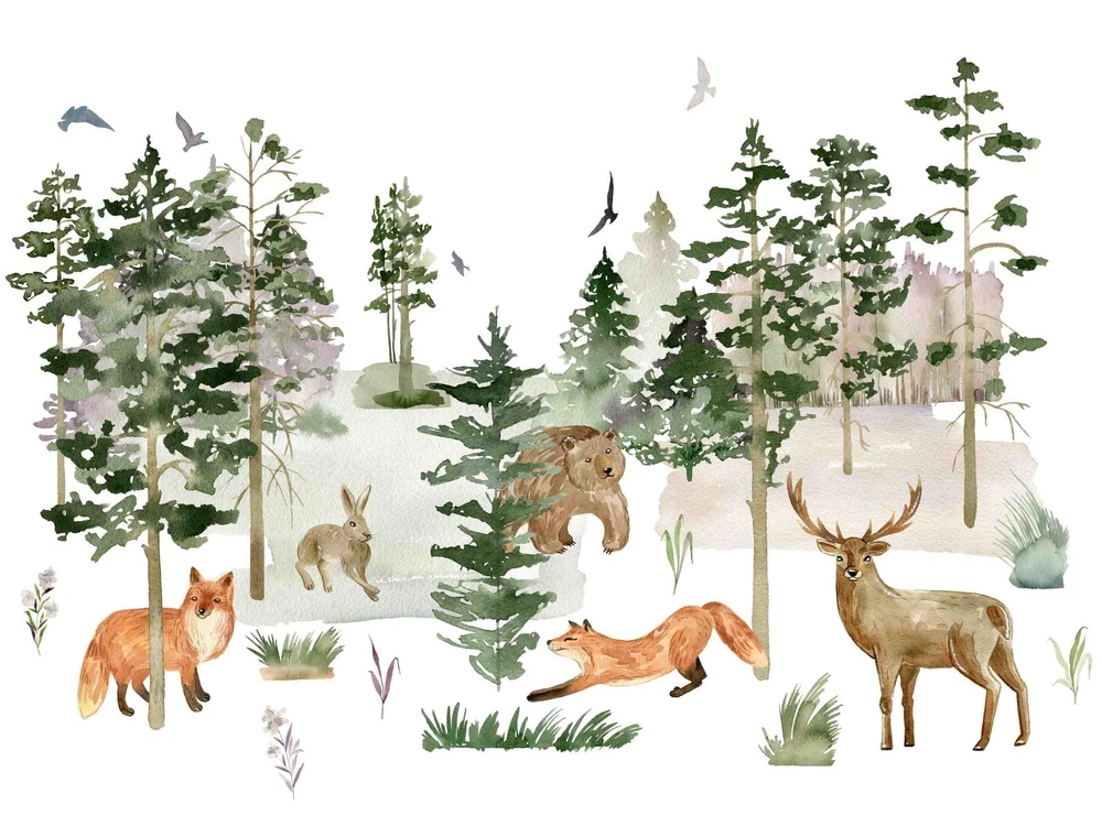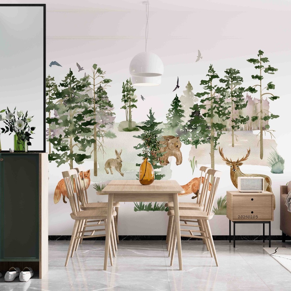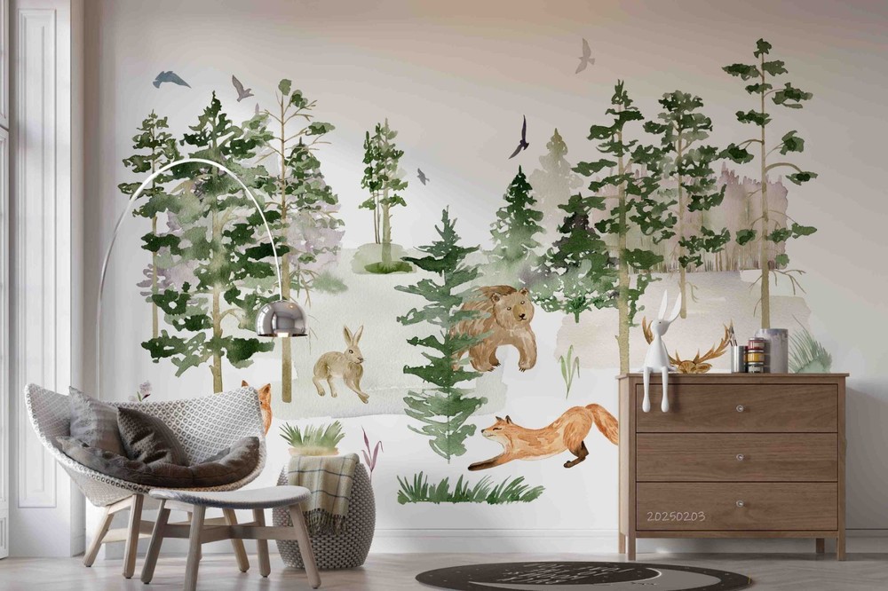 3D Forest Deer Fox Watercolor Pattern Wall Murals Wallpaper Murals Wall Sticker