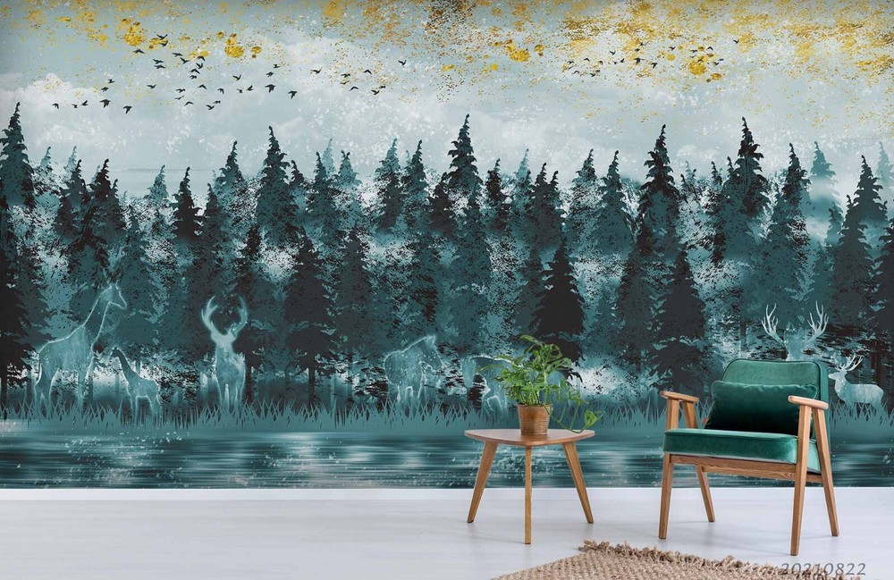 3D Green Forest Animal Hand-Drawn Wallpaper Murals and Stickers for Walls