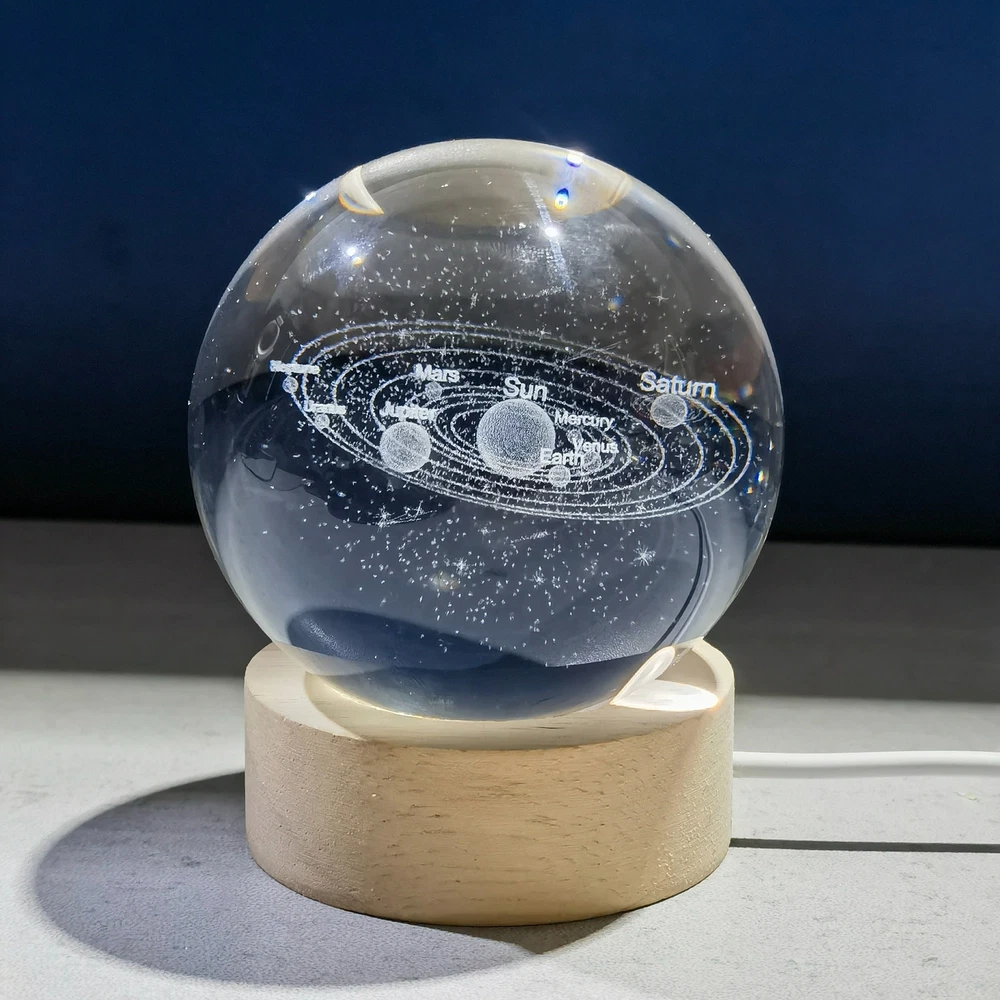 Illuminate Your Space with a Touch of Cosmic Beauty! Transform any room into a mesmerizing galaxy with this 3D Laser Engraved K9 Crystal Ball Lamp. Perfect for adding a mystical glow to your home, this stunning lamp features a beautifully detailed, laser-engraved solar system inside a high-quality K9 crystal ball. Choose from 16 vibrant colors and 4 lighting modes, easily controlled with a remote, to match any mood or decor. Whether you're looking for a relaxing night light, a statement piece for your living room, or a unique gift, this lamp delivers both beauty and functionality. Key Features: High-Quality K9 Crystal: Durable and retains its shine for a lifetime. 16 Color Options & 4 Modes: Flash, fade, smooth, or constant color for endless lighting possibilities. USB Powered: Energy-efficient, convenient, and portable. Perfect Gift: Ideal for any occasion, from birthdays to special celebrations. Elevate your home décor or surprise someone with a gift that's both artistic and functional. Experience the magic of the universe, one glow at a time.