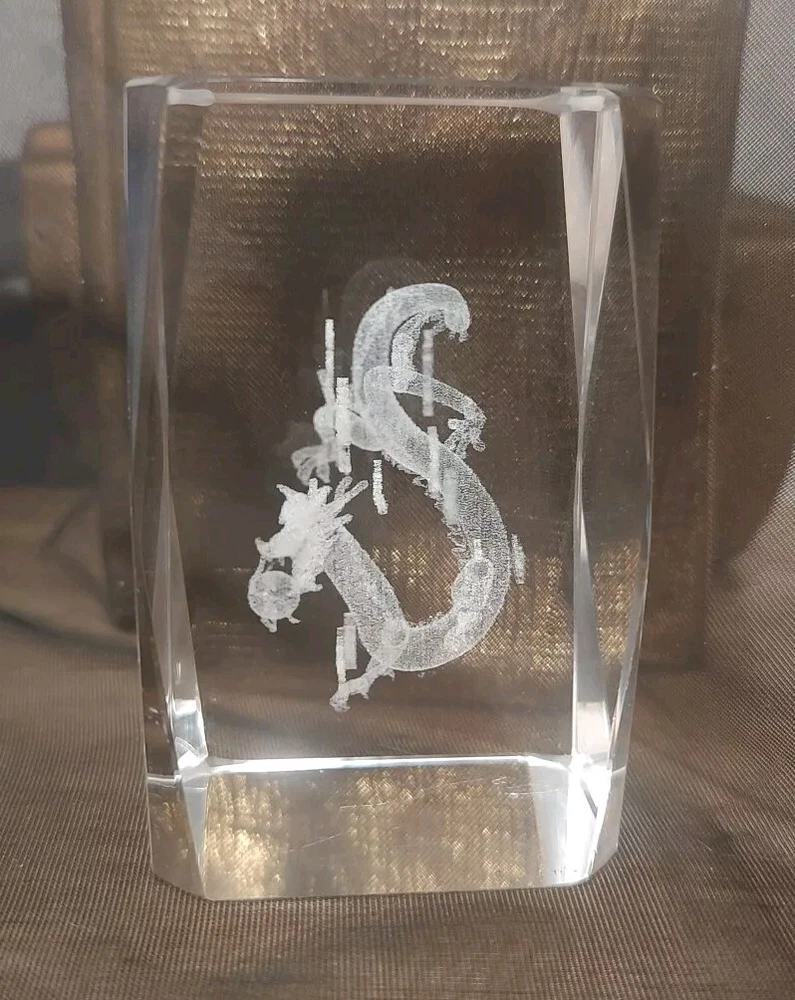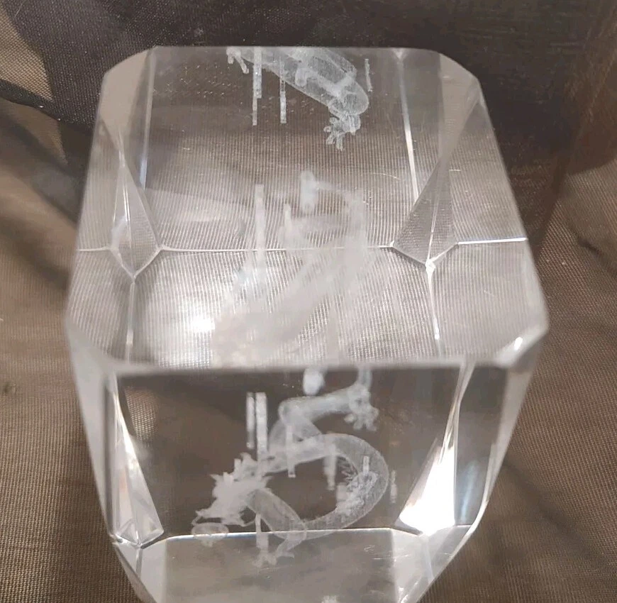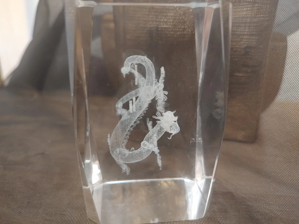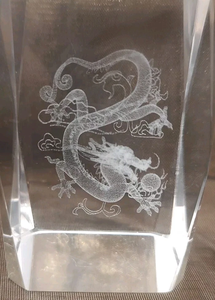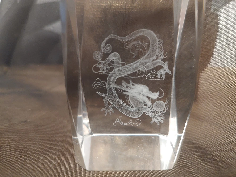 3-D Laser Etched Glass Crystal Paperweight Fire Breathing Dragon 3.2"x2" Medieval, Good Condition.