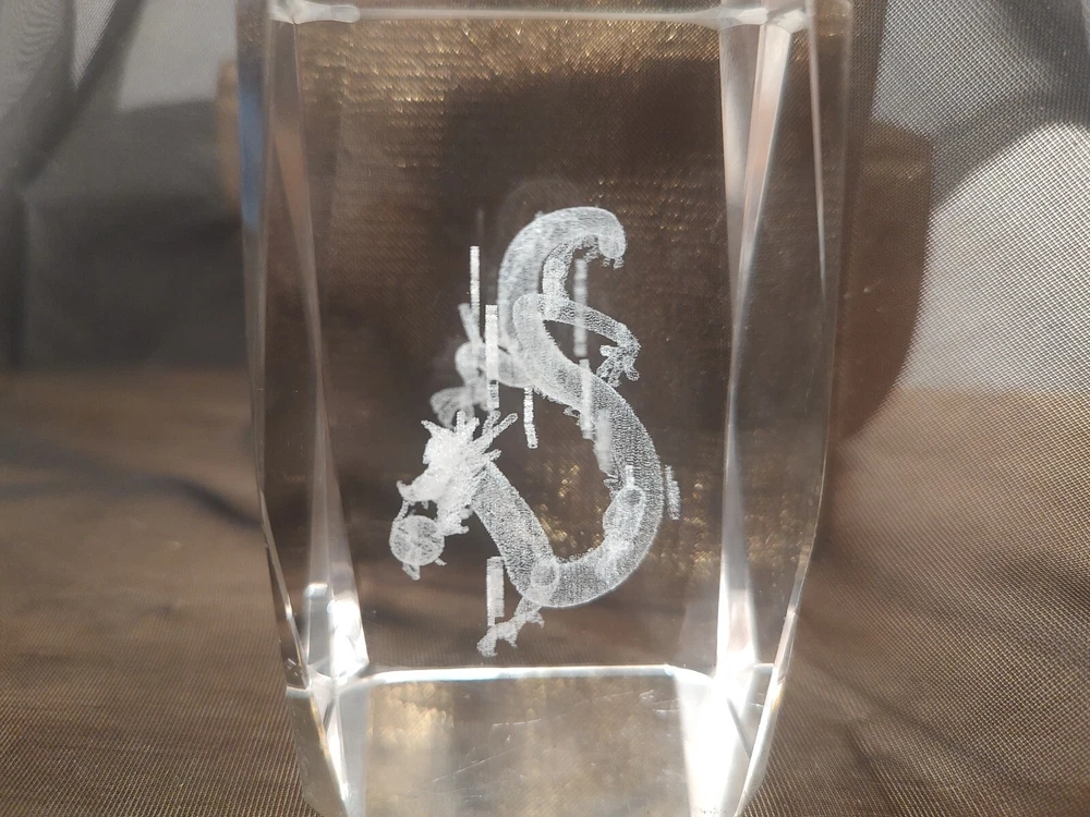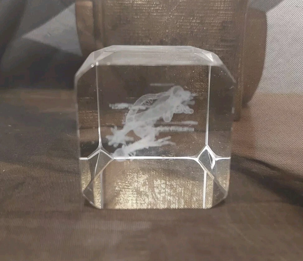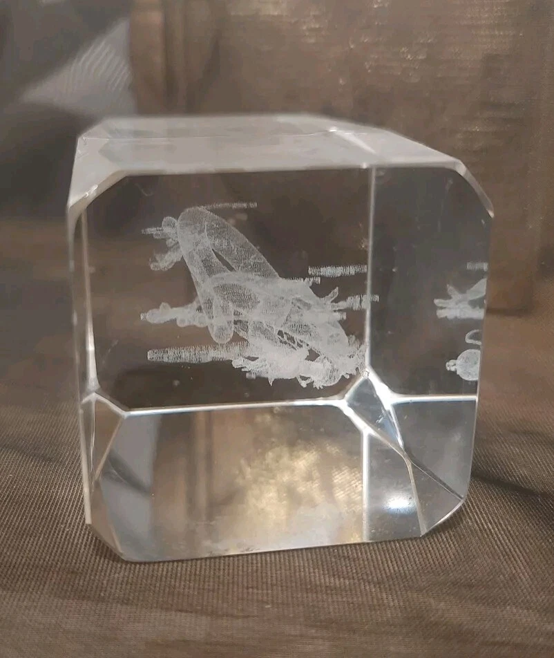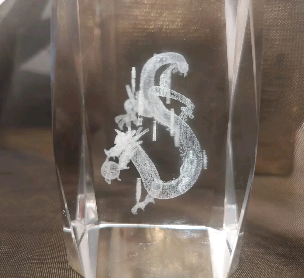3-D Laser Etched Glass Crystal Paperweight Fire Breathing Dragon 3.2"x2" Medieval, Good Condition.