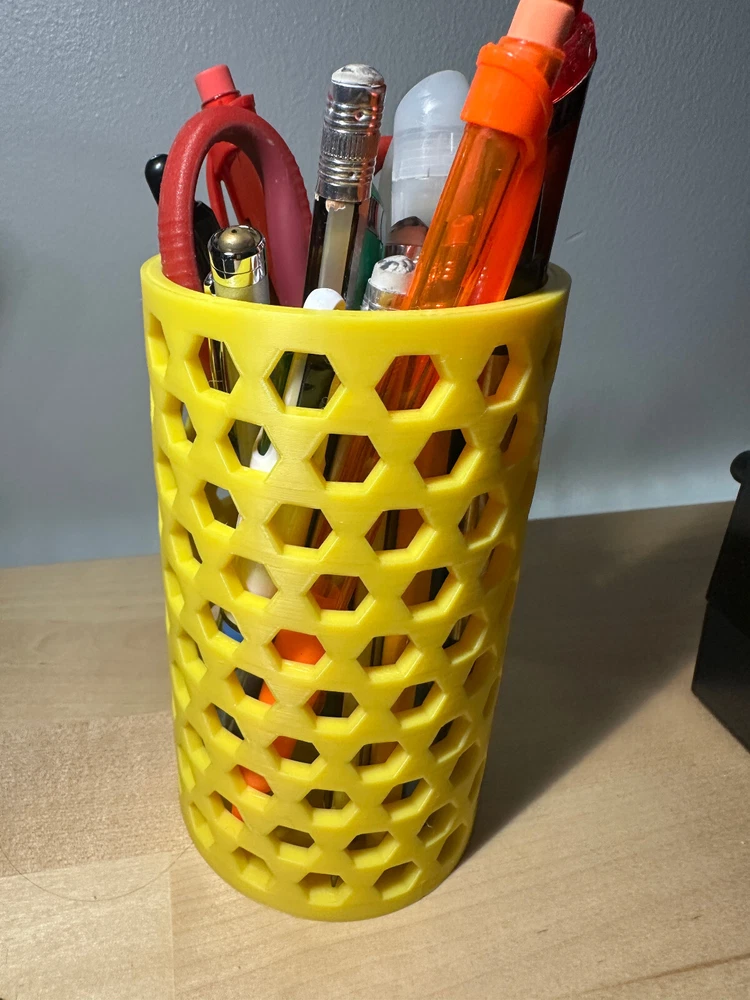 3D printed container for anything but will most likely be used for pen/pencils. I designed this myself in Shapr3D. If you want to 3d print this yourself here is my makerworld profile. https://makerworld.com/en/@Mangomaster