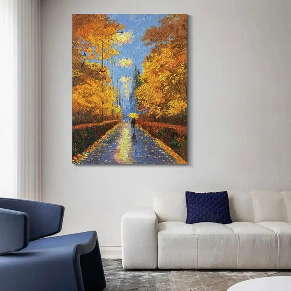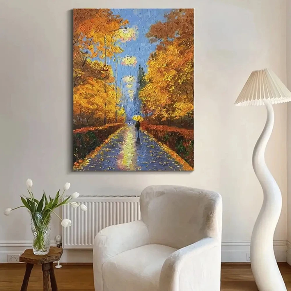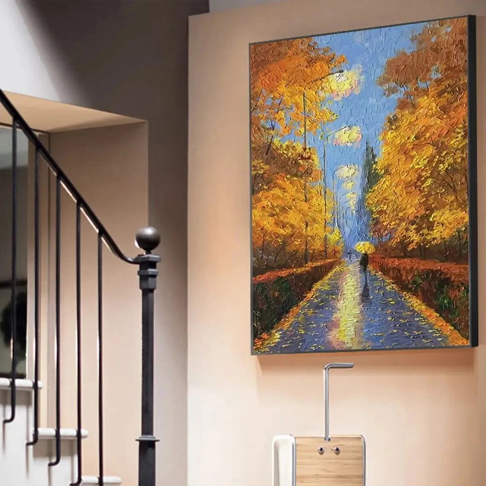 3D Street Light Scene Oil Painting Yellow Tree Palette Knife Painting Abstract