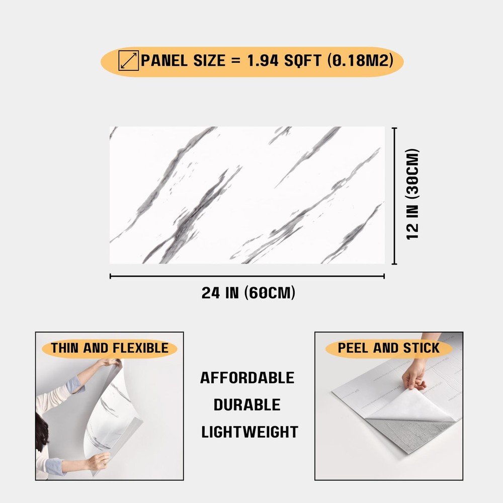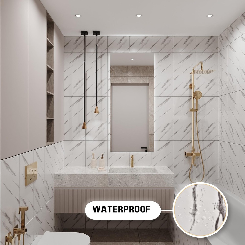 Effortless Elegance with Marble Peel and Stick Wall Panels Upgrade your space instantly with our 3D Marble Peel and Stick Wall Panels, the easiest way to achieve a sleek, modern look without the cost or hassle of real marble. Whether you’re enhancing your kitchen backsplash, shower walls, bathroom, living room, or even flooring, these lightweight, easy-to-install panels deliver a refined, high-end aesthetic in minutes. Each panel measures 24x12 inches (60x30.5 cm), allowing you to cover large areas quickly while maintaining a seamless, polished appearance. Designed to mimic the beauty of genuine marble, these panels offer a stunning 3D effect, adding depth and sophistication to any room. The best part? You get the elegant look of marble at a fraction of the cost, making this a smart, stylish solution for any home improvement project. Crafted from high-quality, durable vinyl, our panels are waterproof, stain-resistant, and easy to maintain—perfect for moisture-prone areas like bathrooms and kitchens. While they don’t have the weight or thickness of real stone, they provide a similar visual impact, creating a sleek, contemporary upgrade without the need for heavy materials or professional installation. For added durability in wet areas, we recommend sealing the edges with a waterproof sealant. Installation is quick and hassle-free—simply peel, stick, and admire. These panels adhere securely to clean, dry, and smooth surfaces, making them an ideal DIY-friendly solution. Whether you're revamping a backsplash, accent wall, or flooring, you can achieve a luxurious new look in just minutes. (For best results, avoid applying on rough, oily, or uneven surfaces.) If you’re looking for an affordable way to bring timeless marble elegance into your home, our 3D Marble Peel and Stick Wall Panels are the perfect choice. Easy to install, beautiful to look at, and designed to make a statement—your home transformation starts here. Affordable Marble Look for Any Space: Get the high-end appearance of marble—without the weight, cost, or hassle of real stone! Our peel and stick marble wall panels are a lightweight, budget-friendly alternative designed to replicate the sleek and stylish look of marble at a fraction of the price. Each panel measures 24x12 inches (60x30.5 cm) and is perfect for bathrooms, showers, kitchens, living rooms, and accent walls. Thin, Flexible & Easy to Work With: Unlike real marble or heavy wall panels, these thin, flexible panels are easy to cut and install, making them perfect for quick home upgrades. While they don’t have the thickness or weight of solid stone, they deliver a similar visual effect, allowing you to transform your space without complex installation or high costs. Waterproof & Practical for Everyday Use: Made from moisture-resistant materials, these panels are waterproof and stain-resistant, making them a great choice for bathrooms, showers, and kitchen backsplashes. While they mimic the look of marble, they offer a practical, low-maintenance alternative that won’t absorb water or require sealing like real stone. For extra durability in wet areas, we recommend sealing the edges. Effortless DIY Installation: Skip expensive labor and complicated tools! These self-adhesive panels stick securely to clean, dry, and even surfaces, making installation quick and hassle-free. Whether you're updating a backsplash, bathroom wall, or decorative feature, you can achieve a stylish upgrade in minutes. (Avoid applying on rough, oily, or uneven surfaces for the best results.) A Smart & Budget-Friendly Choice: If you love the look of marble but need a more affordable, lightweight option, these thin peel and stick panels are the ideal solution. Whether you’re working on a small home update or a larger decorative project, this is the easiest way to achieve a modern, stylish look—without the cost or effort of real stone.