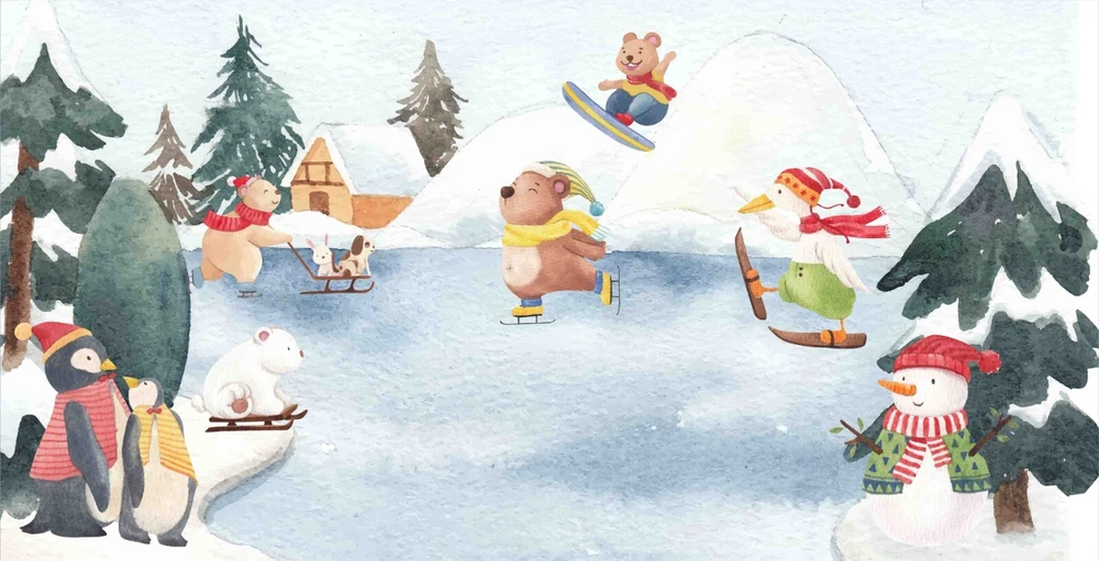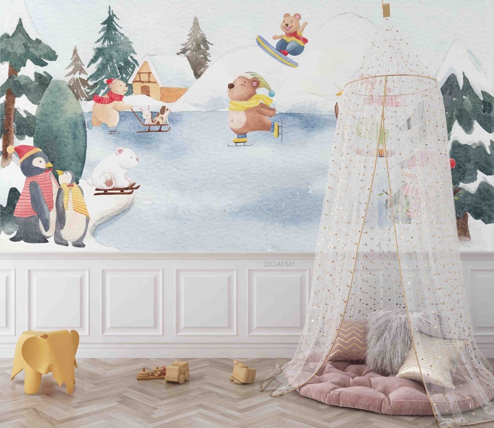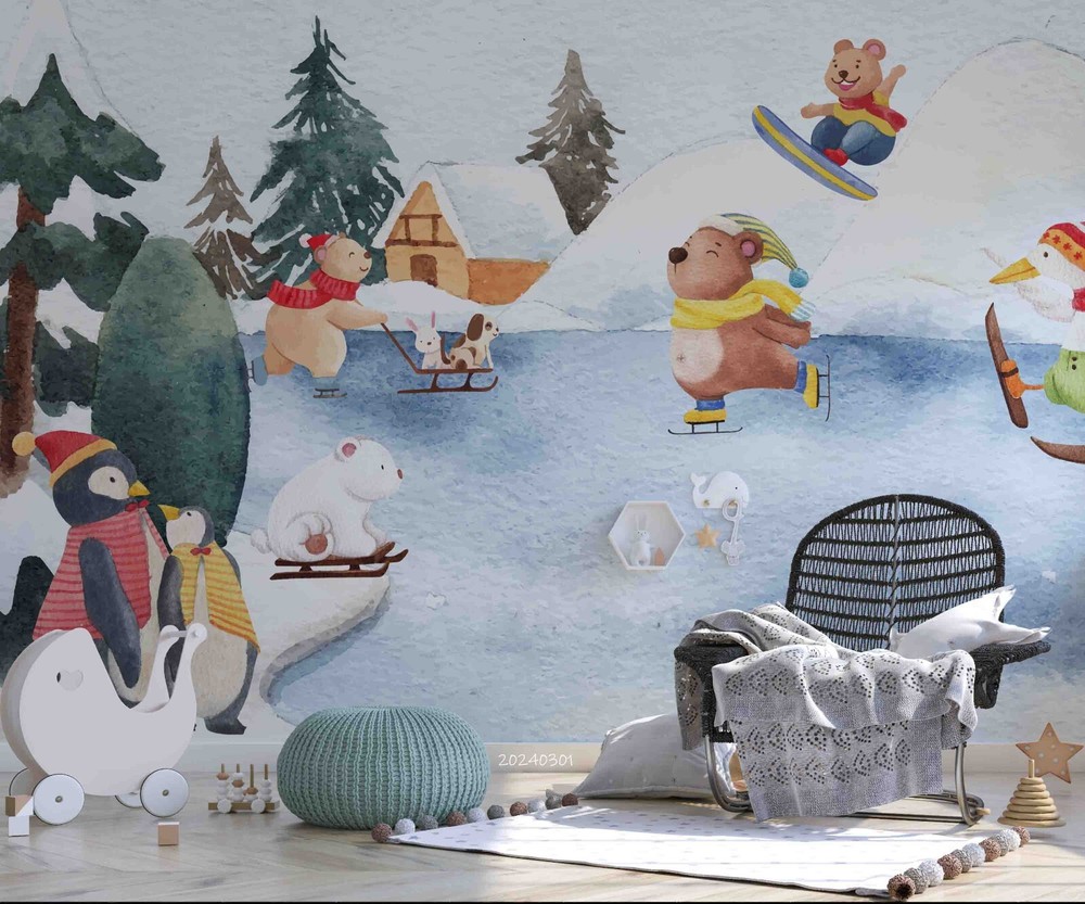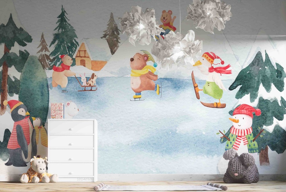 3D Winter Animal Skiing Forest Wall Murals Stickers for Creative Home Decor