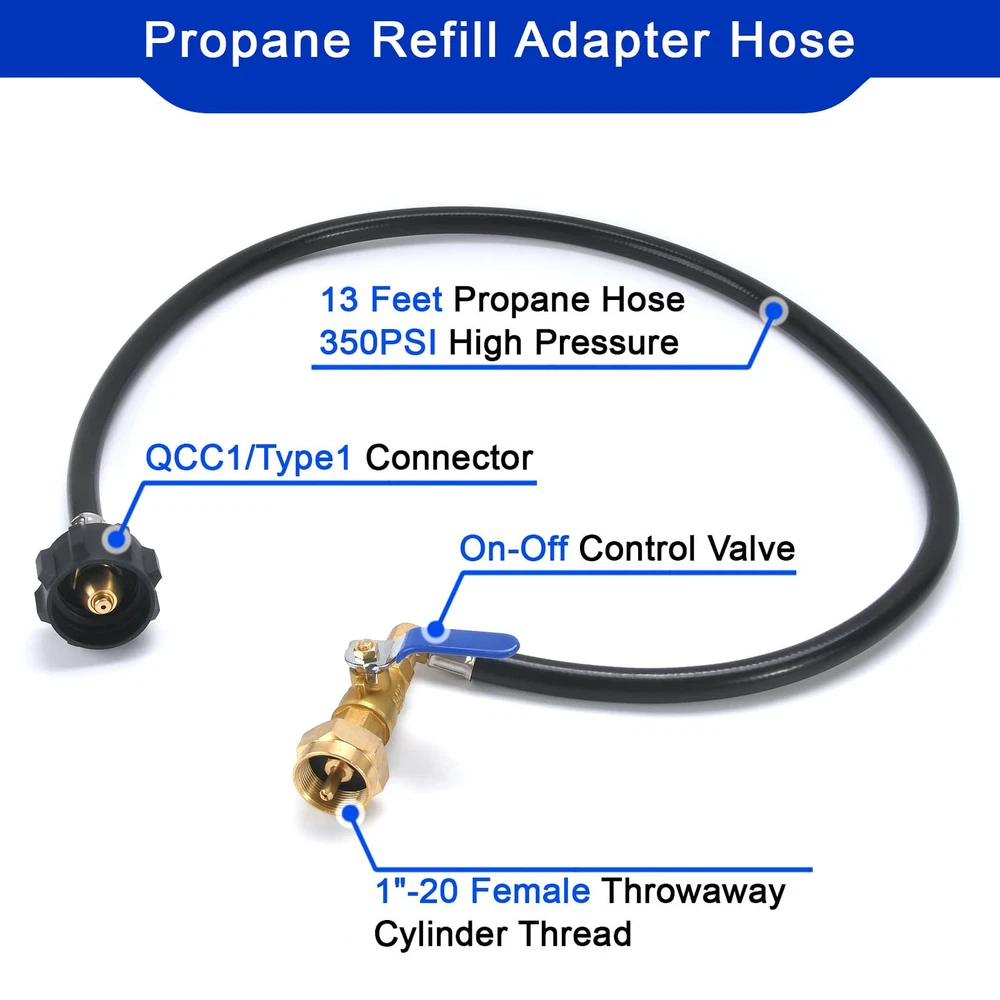 【Propane Refill Hose】: The propane hose is made of high-quality rubber and hundred percent solid brass, which has higher wear resistance and corrosion resistance 【Efficient use】:The propane filling hose can help you fill 1 pound propane bottle unlimited times. Connect QCC1/Type1 to the 5-40 pound water tank and connect the other end of the 1 pound gas cylinder. 【Safe and Convenient】:Traditional adapter joints are difficult to control gas. The propane hose has an on-off valve at the front end and can be directly closed after filling. 【Scope of Application】:Propane filled hose suitable for heaters, camping stoves, portable grills and blackstone griddleses, etc. 【Note】:You can freeze a 1 lb. propane bottle for half an hour before use. Close the valve on the propane hose first after you finish filling it, then close the switch on the tank.