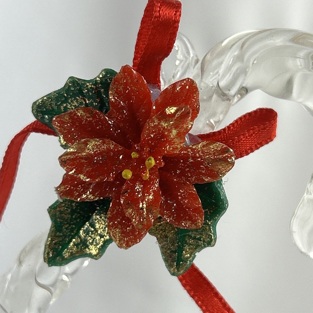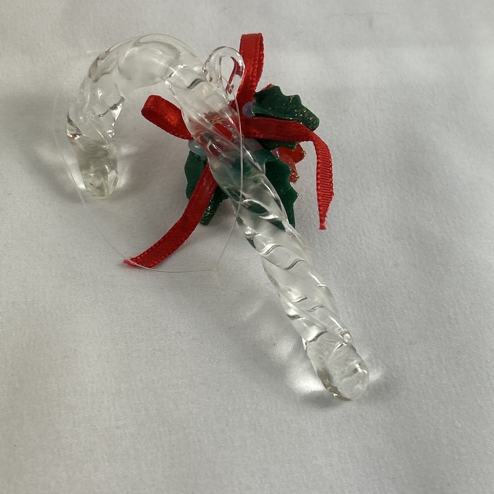 Add some sweetness to your Christmas tree with this Candy Cane Ornament. Made of clear acrylic and adorned with red and green poinsettia accents, this small ornament is perfect for anyone who loves the holiday season. The candy cane shape and candy theme make it a great addition to your holiday decor. This ornament is perfect for collectors and those who want to add a touch of nostalgia to their tree. The item measures 1.5 inches long and 3 inches tall and comes with a string for easy hanging. Don't miss out on this festive decoration for your home or office. No chips, cracks or repairs.