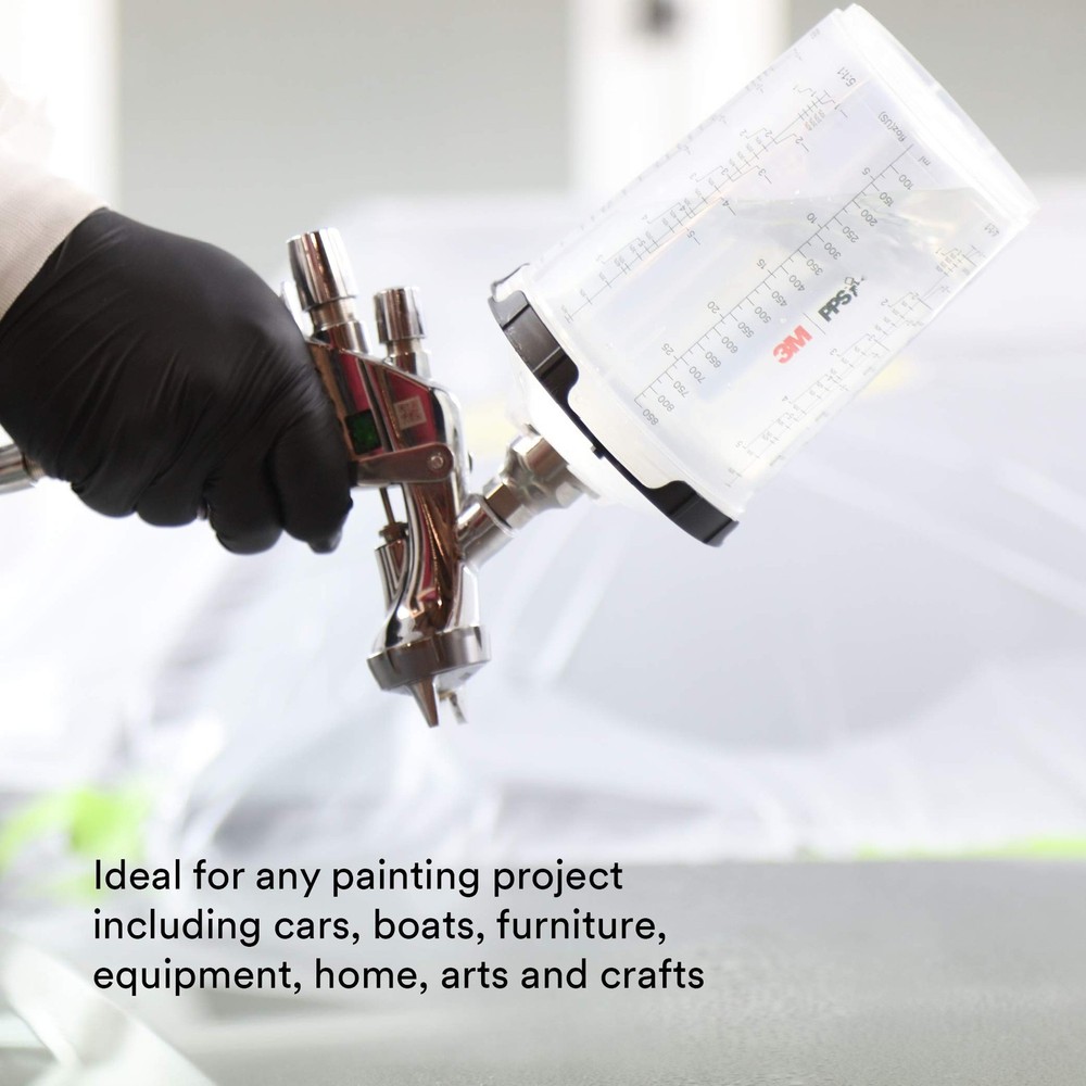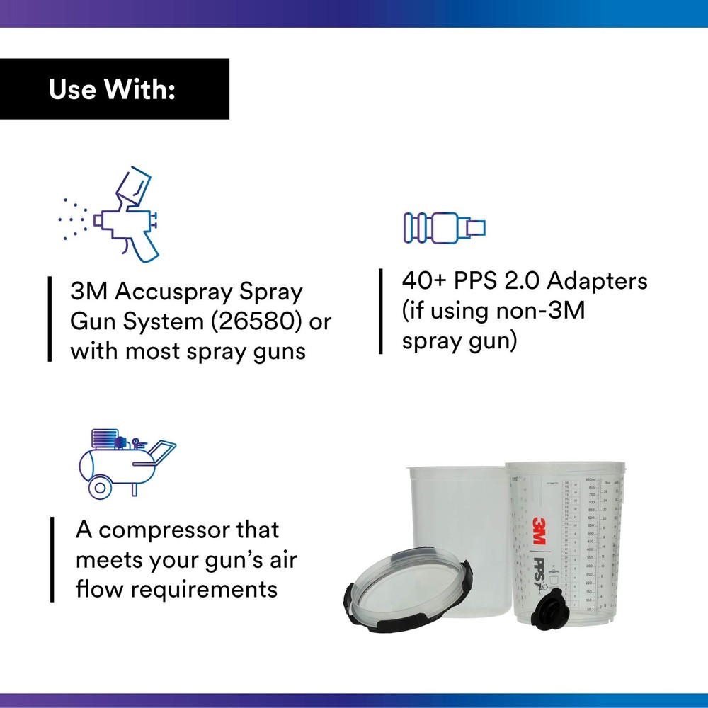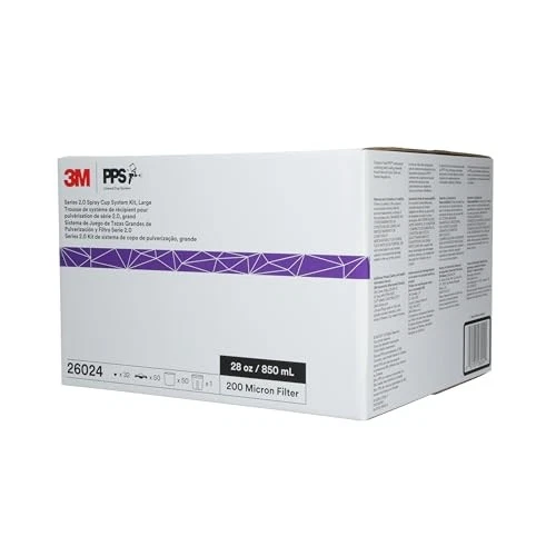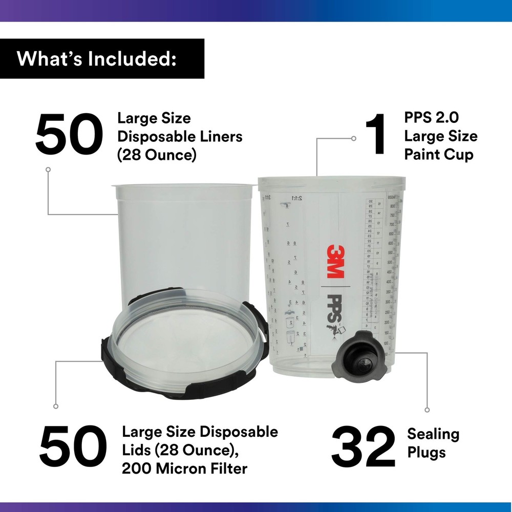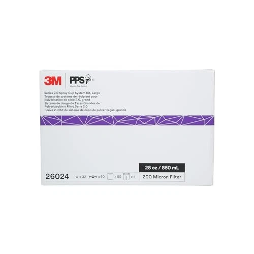 3M PPS 2.0 Spray Gun Cup, Lids and Liners Kit, 26024, 28 oz (Large), SILVER Product Details KIT INCLUDES – 1 reusable paint cup, 50 liners, 50 lids and 32 sealing plugs DISPOSABLE ALL-IN-ONE SPRAY CUP SYSTEM – PPS 2. 0 Spray Cup System Kit gives you everything you need for an all-in-one solution for measuring, mixing, filtering and spraying paint materials VERSATILE USES – Large 28-ounce size ideal for any painting project including cars, boats, furniture, equipment, home, arts and crafts RANGE OF APPLICATIONS – Use to apply paints, stains, varnishes, basecoats, undercoats, primers, sealers, clearcoats, gelcoats, sprayable adhesives and more IMPROVED DESIGN – With each lid you get an integrated quarter-turn locking collar, which helps eliminate cross-threading and paint buildup, and a built-in fine-mesh 200-micron filter, commonly used for solvent-based paint coatings 3M PPS 2. 0 Spray Cup System Kit is a great way to stock up on supplies for PPS 2. 0, our all-in-one solution for measuring, mixing, filtering and spraying paint materials for automotive, industrial, home, furniture, cabinetry and more. Our latest and greatest PPS system features improvements like a quarter-turn locking collar with each lid, new paint cup in each kit, domed lid design for better spray performance, wider lid fluid spout and redesigned adapter for a more stable lid-to-gun connection. Each lid strains paint material with a built-in 200-micron filter, commonly used for solvent-based paint materials. Unlike with conventional aluminum or other metal paint cup systems, with PPS you don’t have to mix paint in extra cups and filter it into a paint reservoir, so you waste less paint. And with a fresh lid and liner for each mix, there’s less risk of outside contamination. Specially designed PPS stainless steel metal adapters let you use the PPS 2. 0 system with virtually any spray gun. Use to apply paints, stains, varnishes, basecoats, undercoats, primers, sealers, clearcoats, gelcoats, sprayable adhesives and more. Kit contains 1 paint cup, 50 disposable liners, 50 disposable lids with locking collar and 200-micron filter, and 32 sealing plugs.