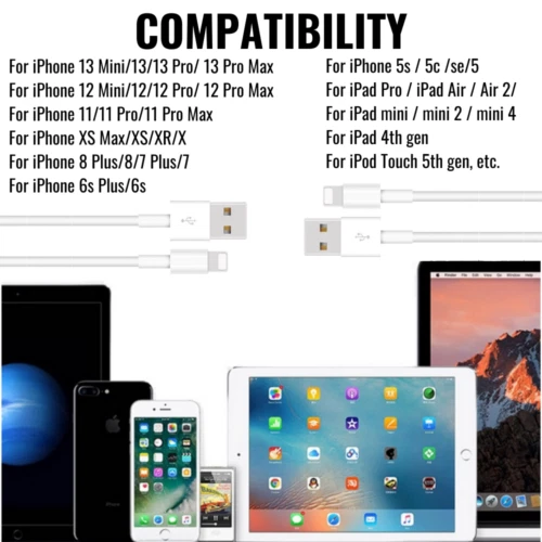 eBay eBay For iPhone Charger Cable: Full Support with iOS versions and all future updates Strong and durable premium material support upto 5500 times bending High coverage aluminum foil makes data transmission is not disturbed by external signals Gold-plated C48 terminal and tinned copper material ensures charging performance increased by 30% Fast Charging speed and High Speed transmission Compatible with Devices: For iPhone SE 2020/13/12/11/ Pro/Max/iPhone Xs/Max/XR/X/8/8 Plus For iPhone 7/ 7 Plus / 6s Plus / 6s / 6 Plus For iPhone 5s / 5c / 5 / SE For iPad Pro / iPad Air / Air 2 For iPad mini 2 / mini 3 / mini 4 For iPad 4th gen For iPod Touch 5th gen / iPod Nano 7th gen and Beats Pill+ Package Included : 1/3 Pack cable User Tips : When pulling out the data cable, please pull the end of the data cable instead of pulling the rope of the data cable violently. If the data cable gets wet with water, please wipe it dry before using it. If there is a black dot in the middle of the chip of the data cable after a long time of use, it will affect the phenomenon of unstable charging during the charging process. Wipe clean with an eraser to resume normal use.