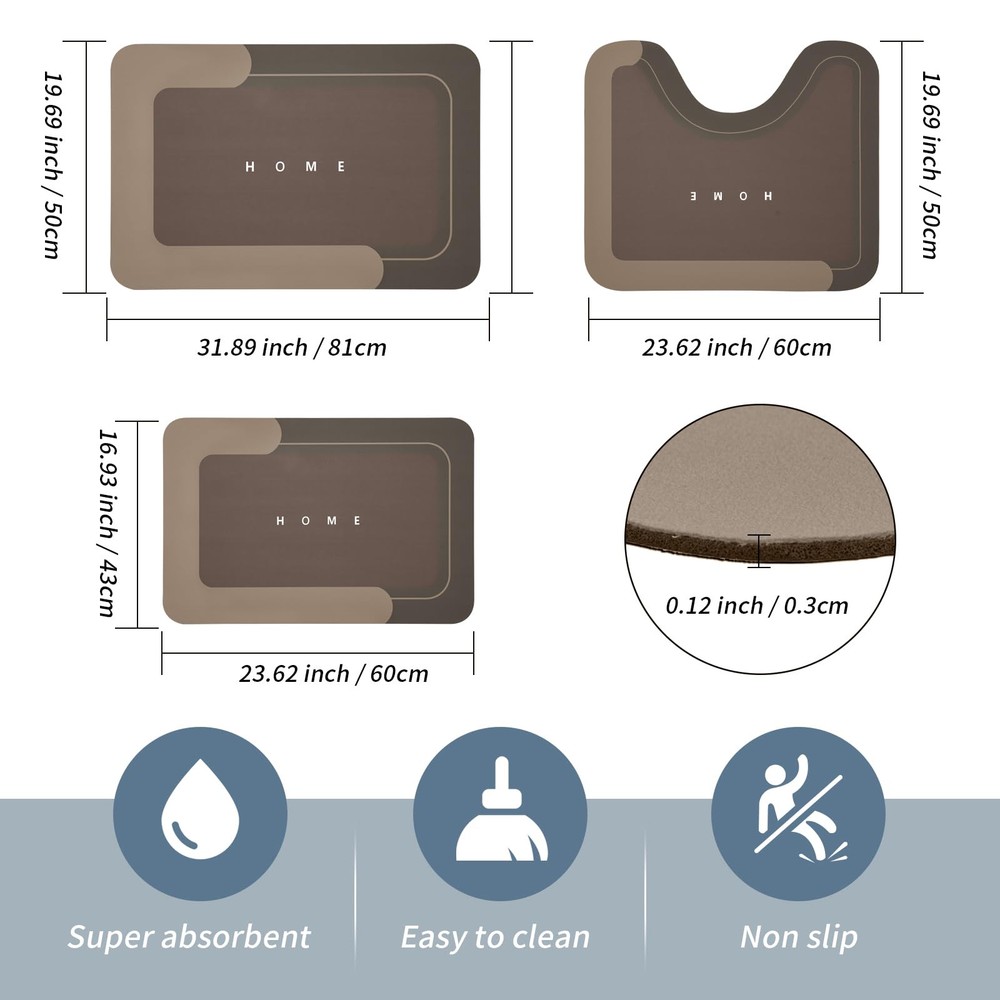 【Super Absorbent Diatomite Mat】These bathroom mats rugs are made of diatomite surface and have strong water absorption and quick drying function. The footprints and water stains on these magic mats will disappear in a short time, and keep the floor dry at all times. 【Soft and Comfortable】They are made of high-quality diatom mud material, which is comfortable to stand on, with smooth surface, no fiber falling, and will not fade after long time use. They are super absorbent floor mats that suitable for family life. 【Rubber Back】Anti-slip backing is necessary for silicone bathroom mats, which can firmly absorb the ground and prevent the mat from moving at will. At the same time, the quick dry bath mats will not allow water droplets to seep into the ground to prevent damage your floor. 【Combination Set】Our absorbent bathroom mats are divided into single-piece, two-piece and three-piece of different colors to meet your different needs, perfect for bathroom, kitchen, living room, bathtub edge, sink, etc. 【Easy to Clean】The surface of bathroom mats is smooth, so the dust and dirt can be removed by gently wiping with cloth or washing with shower nozzle. At the same time, the floor mats can also be machine washed, without the risk of damage.