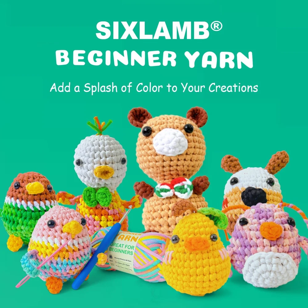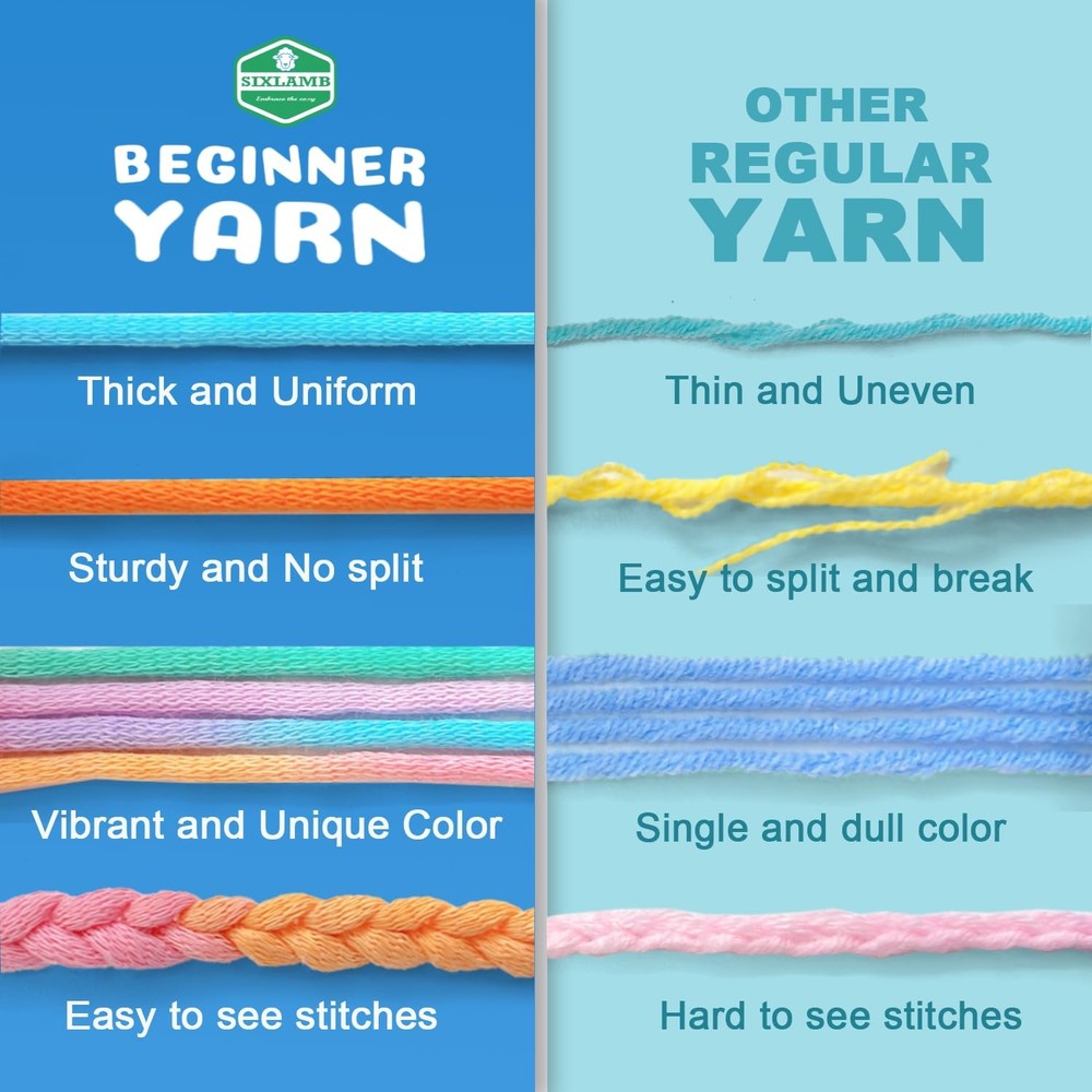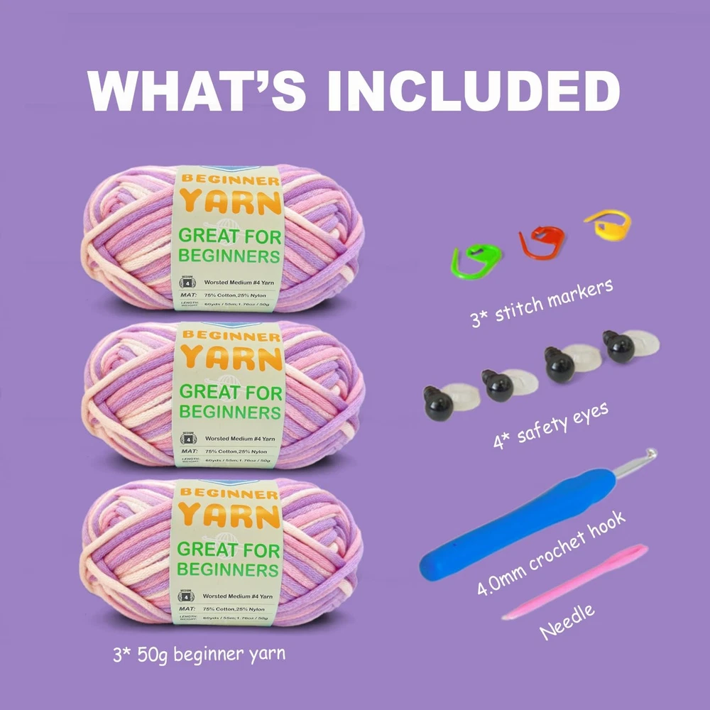 **Premium Beginner-Friendly Craft Yarn - 3-Pack Bundle (1.8 oz/60 yards each)** Discover the perfect easy yarn for your crafting journey with our specially designed beginner-friendly yarn. Each pack includes three skeins, with each skein weighing 1.8 oz and measuring 60 yards, providing ample material for your creative projects. **Why Choose Our Yarn?** Our yarn stands out from the rest due to its superior quality and thoughtful design. Made from 75% cotton and 25% nylon, this yarn offers a perfect balance of softness and durability. Unlike ordinary yarn, it is tightly spun to prevent splitting and breaking, ensuring a smooth and frustration-free experience for beginners. The clear stitch definition also makes it easier to see your progress, making it ideal for those just starting. **Exclusive Color Options** Our yarn comes in a variety of custom-dyed colors, featuring vibrant, multi-hued options that are perfect for creating one-of-a-kind projects. Each colorway is carefully selected to bring your creations to life, making every piece truly unique. **Complete with Tools, Accessories, and Tutorials** We’ve thought of everything to help you get started. This bundle includes all the essential tools and accessories, along with a basic tutorial guide, ensuring you have everything you need to bring your creative ideas to life. **Versatile Use** Whether you're crocheting adorable amigurumi animals, crafting stylish home decor, or knitting fashionable garments and accessories, our yarn is up to the task. Its versatility makes it suitable for a wide range of projects, ensuring that your creativity knows no bounds. --- This version includes the additional feature of the kit providing all necessary tools, accessories, and a basic tutorial. 【Premium Materials for Smooth Crocheting】 Beginner Yarn is crafted from a 75% cotton and 25% nylon blend;Worsted medium weight #4;Machine wash cold and dry; this high-quality, soft crochet yarn ensures a smooth and durable crocheting experience. 【Great for Beginners】Unlike traditional acrylic or wool yarn that may split,pill,fray,or snag,The easy-to-see stitches crochet yarn makes it easy to work with for those learning to crochet, avoiding splitting or breaking. Ideal for adults or kids who want to learn to crochet. 【Crochet Starter Kit】This crochet yarn set includes 3 skeins of cotton-nylon blend yarn, 1.76 oz / 50 g, 60 yds / 55 m per skein; and a 4.0mm crochet hook, 3 stitch markers, 4 safety eyes, and a plastic needle, providing everything needed to start crocheting immediately. 【Unique Colors & Versatile Yarn】Choose from a stunning palette of 23 yarn colors, featuring 11 solid shades and 12 variegated blends. These colors are carefully selected to ensure your projects have a unique and eye-catching appeal. Whether you're making amirugumi toys, blanket, or home décor, the vibrant hues bring your creations to life. This versatile yarn is perfect for beginners exploring different styles and projects, allowing for endless creativity in crocheting and knitting projects. 【Knitting Gauge】 Knitting gauge of 4” x 4” (10 cm x 10 cm) 20 sts and 28 rows with a 5.0mm (U.S. 9) knitting needle 【Crochet Gauge】 Crochet gauge of 4” x 4” (10 cm x 10 cm) 13 sc and 14 rows with a 4.5mm (U.S. H-8) crochet hook 【Perfect Gift】multicolor beginner easy yarn kit is a perfect gift for craft lovers, offering everything needed to start a new, rewarding hobby! It's always a fun adventure to crochet patterns with our beginner yarns.Let's just enjoy the endless possibilities!
