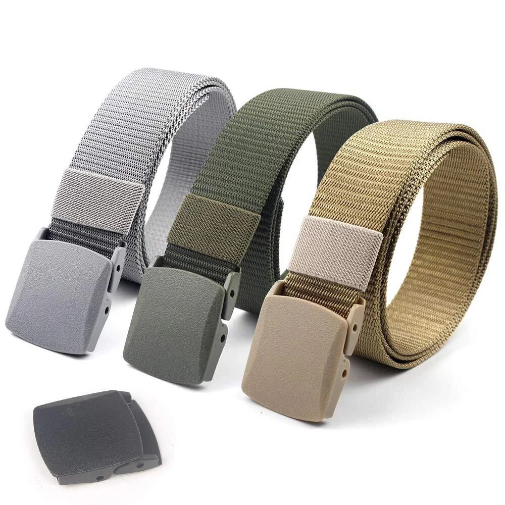 Description: Product: 3 × Belt ( Including 3 × Strap and 3 × Plastic Buckle ) and one more Black Plastic Buckle ( Prepare For Replacing ). Superior Material: Buckle: 100% Plastic; Strap: 100% Nylon. The Buckle is made of hard plastic and with special matte surface, make the buckle more attractive and durable. The Strap is made of strong and durable nylon material. All of our products have been tested to ensure a two-three-year lifetime. Easy to pass the metal detectors of security checkpoint. Also, No worry about the metal allergy. Size: Belt Total Length: 120cm / 47.2 inch.Belt Width: 1.45 inch./ Perfect for Waistline under 45"。 Color: Wine red,Navy,black. Feature: Not only used for daily wearing, but also a good partner for outdoors sports, hunting, hiking, shooting, riding, running, golf, water sports etc. It comes with Beautifully designed, a nice gift choice for men, husband, boyfriend, father, son and friends as Birthday gift, Thanksgiving gift, Christmas gift and New Year gift. Package Inclued: 3 pcs canvas belt plastic buckle belt and one more black plastic buckle ( Prepare For Replacing ). The highly cost-effective Selling in 3 pack belts can satisfy your replacing needs, or you can share with your family or friends. One more Black Plastic Buckle not only can extend belts’ lifetime but also can make your belts in different style. We adopt the way of highly cost-effective Selling in 3 pack, the most important is can helping you save money. Warm Note: - International standard buckle, Without any metal, anti-allergic. - Durable, high strength, environmental friendly 1000D nylon webbing with 1100lb/500kg tensile strength. - Our products have been tested to ensure a two-three-year lifetime using in the normal circumstances. INFINITELY ADJUSTABLE - Military Belts for Men No holes in mens belt web means it is fully adjustable! Adjust the size depending on your waist and what you are carrying. Never get caught between holes!Great web belts for men COMFORTABLE & ANTI-ALLERGIC - Military belts for men Web belts for menBelt Web Nickel free international standard plastic buckle, feel comfortable and easy to wear. Non-metallic buckle for easy, quick clearance at security checkpoints. Especially suitable for metal allergy to wear, not easy to crack and breakage EASY TO DRY - The military mens belt web web belts for men makes with lightweight and wear-resisting nylon material that has a strong evaporation of sweat, more comfortable and breathable, feel more flexible, easy to dry in air WIDE USAGE - This military belts for men Belt Web web belts for men is suitable for lightweight, Quick Dry, Comfort Nylon material Strap with Plastic Buckle suitable for your outdoor sports (Hiking, Climbing Mountains, etc), military uniforms matching and quickly passing security checkpoint. The most commonly wearing is daily wearing, this Belts are good matching your slacks or jeans FASHION DESIGN - The military belts for men Belt Web is very cheap price to buy three different colors of the belt!A waist belt is not only used for daily wearing, but also let you be more fashion and can show your own taste. we strongly recommends this belt for you here, with concise style and implicit cool design. Perfect for decorating with all kinds of clothes