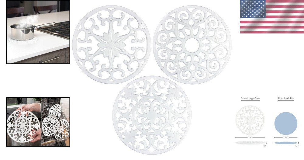 Set of 3 Flexible Silicone Trivets 10" - Elegant Hot Pads for Pots and Pans ‹ › ‹ › ‹ › ‹ › ‹ › ‹ › ‹ › ‹ › ‹ › ‹ › ‹ › Set of 3 Flexible Silicone Trivets - 10" Elegant Hot Pads for Pots and Pans Features: Extra Large and Thick: Measuring 10 x ¼ inches, providing an additional 3 inches of coverage compared to standard silicone trivets. Heat Resistant: Safely withstands temperatures up to 446°F, perfect for hot pots, pans, and dishes. Easy to Clean: Dishwasher safe and simple to wash by hand, keeping your kitchen looking pristine. Decorative: Elegantly designed, these trivets can be hung on the wall or displayed on the counter when not in use. Premium Quality: Crafted from food-grade silicone that is durable and non-slip, perfect for daily wear and tear. Benefits: Superior coverage for your surfaces, providing enhanced protection against heat and scratches. Long-lasting and resilient, ensuring you won’t need frequent replacements. Stylish design complements any kitchen décor, making them a perfect blend of practicality and beauty. Soft enough to protect delicate surfaces while maintaining its non-slip grip for safety. Why Choose Our Silicone Trivets? Elevate your culinary experience with our Set of 3 Flexible Silicone Trivets. Designed for the discerning cook, these trivets offer unmatched protection for your countertops and dining tables while showcasing an elegance that your kitchen deserves. With a premium-quality finish and heat resistance up to 446°F, safety and style never looked so good. Perfect for any occasion, these trivets are not just functional but add a decorative touch to your kitchen. With easy cleaning and a trusted brand since 2012, you can invest in a smarter kitchen accessory that will last for years. Transform the way you serve with our stunning silicone trivets—order yours today! Shipping Free & Fast Shipping - We offer free shipping to most of the USA with a normal delivery time of 3-10 businessdays. However, due to various situations, additional delivery time (up to 3 weeks) may be required for some items. Alternative Carriers - We may use alternative carriers (e.g. USPS, FedEx, UPS, etc.) to ensure your package arrives safely and on time. Due to the use of multiple carriers, we are unable to provide a tracking number automatically. Handling Time - Orders are processed and shipped within 1-5 business days of receiving cleared payment. Shipping Restrictions - Shipping to Alaska, Hawaii, Puerto Rico, Guam, and other US territories may incur shipping charges or delivery restrictions. Please contact us before ordering, or your order can be refunded/cancelled. State Restrictions - There may be restrictions based on your state of purchase. For example, certain items may not be shipped to California due to state regulations. Contact for Tracking Updates - If you require tracking updates or have any concerns about the delivery of your order, please feel free to contact us, and we will be happy to assist you. Return Please see our ebay return policy. We do not accept return on most products. This is to avoid customers mis-using ebay returns. All sales are final. Please be sure to check the return policy listed at the top of the listing. In rare cases, we may accept returns, if the buyer pays both ways shipping and 20% restocking fee. If you are un-sure of return policy of a particular item, please ask before buying. Payment We accept all major credit cards, PayPal, and Apple Pay for your convenience. Your payment information is secure and encrypted to ensure a safe and seamless transaction. Please complete your payment within 3 days of purchase to avoid any delays in shipping. Feedback Your feedback is extremely important to us. We strive to provide the best products and customer service possible. If you are satisfied with your purchase, please take a moment to leave us a positive review. If you have any concerns or issues with your order, please contact us before leaving negative feedback. We are committed to resolving any problems and ensuring your satisfaction. Contact Us If you have any questions or concerns, please feel free to reach out to our customer support team. You can contact us through the eBay messaging system. We are available Monday to Friday, 9:00 am to 5:00 pm EST, and we will do our best to respond to your inquiry within 24 hours. Buy it now and enjoy a pleasant shopping experience! UPC: Not Set Unit Quantity: 3 Material: Silicone Department: Unisex Theme: Not Set Occasion: Multipurpose Character: Not Set Set Includes: Set of 3 Features: Dishwasher Safe,Heat Resistant,Non-Slip,Flexible Brand: Unbranded Color: White Type: Trivet Pattern: Not Set MPN: Not Set Number of Items in Set: 3 Character Family: Not Set Style: Modern Size: Size Country/Region of Manufacture: Not Set Care Instructions: Dishwasher Safe Model: Not Set Unit Type: lb Personalize: Not Set