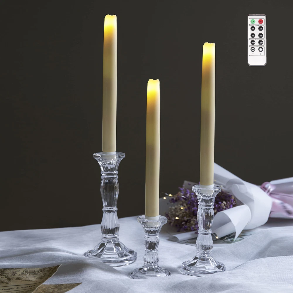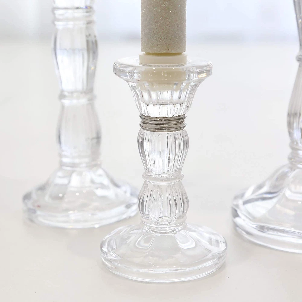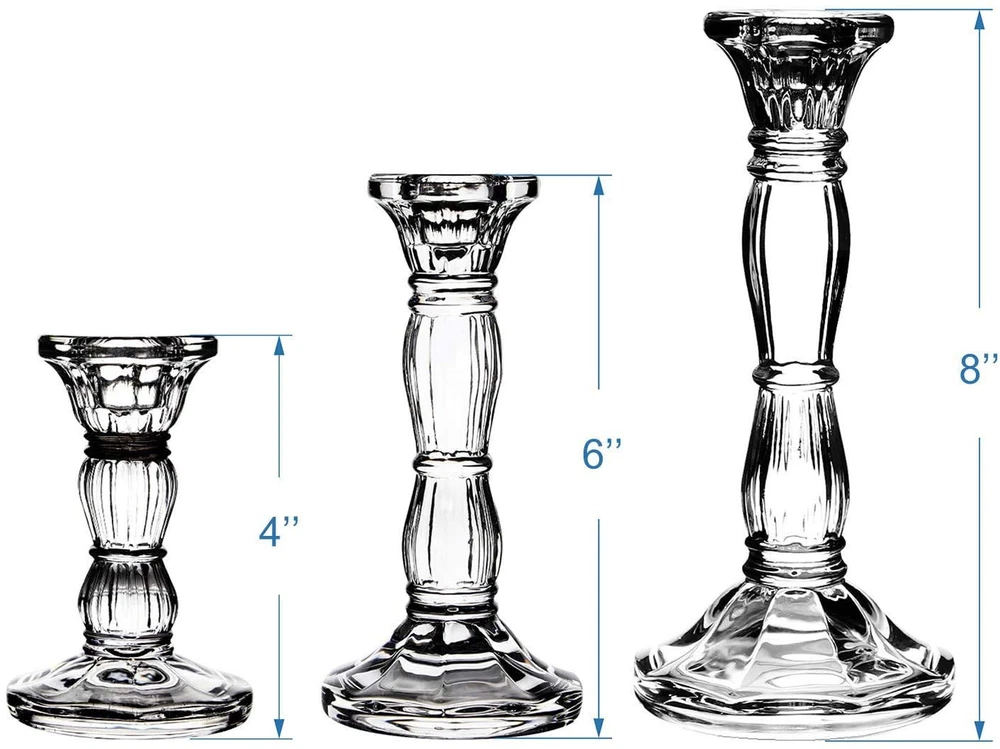 ★Exquisite Design: This exquisite glass candle holders comes with a goblet taper holder sits atop a beautiful pedestal to create a smooth, curved surface shape.3 different size satisfy your daily all need . ★100% Match: Choose from a 4” or 6” or 8" set to fit seamlessly into any setting, whether a wedding or celebration hall, a candlelit romantic dinner at home or a restaurant. Fits all standard candle sizes. ★Elegant Decor:The crystal glass candle stick complements any decor with a touch of sophistication. Plain candles will appear elegant in these candle holders. ★Multi Use: Fits all size taper candle,it will be a nice centerpieces decorations for home coffee table,Valentine's Day,weddings,parties,valentine's Day,new year or other special holidays or events. ★Great Gift: It is an elegant and novel gift for graduations, birthdays, anniversary, and special occasions to your friends and relatives.