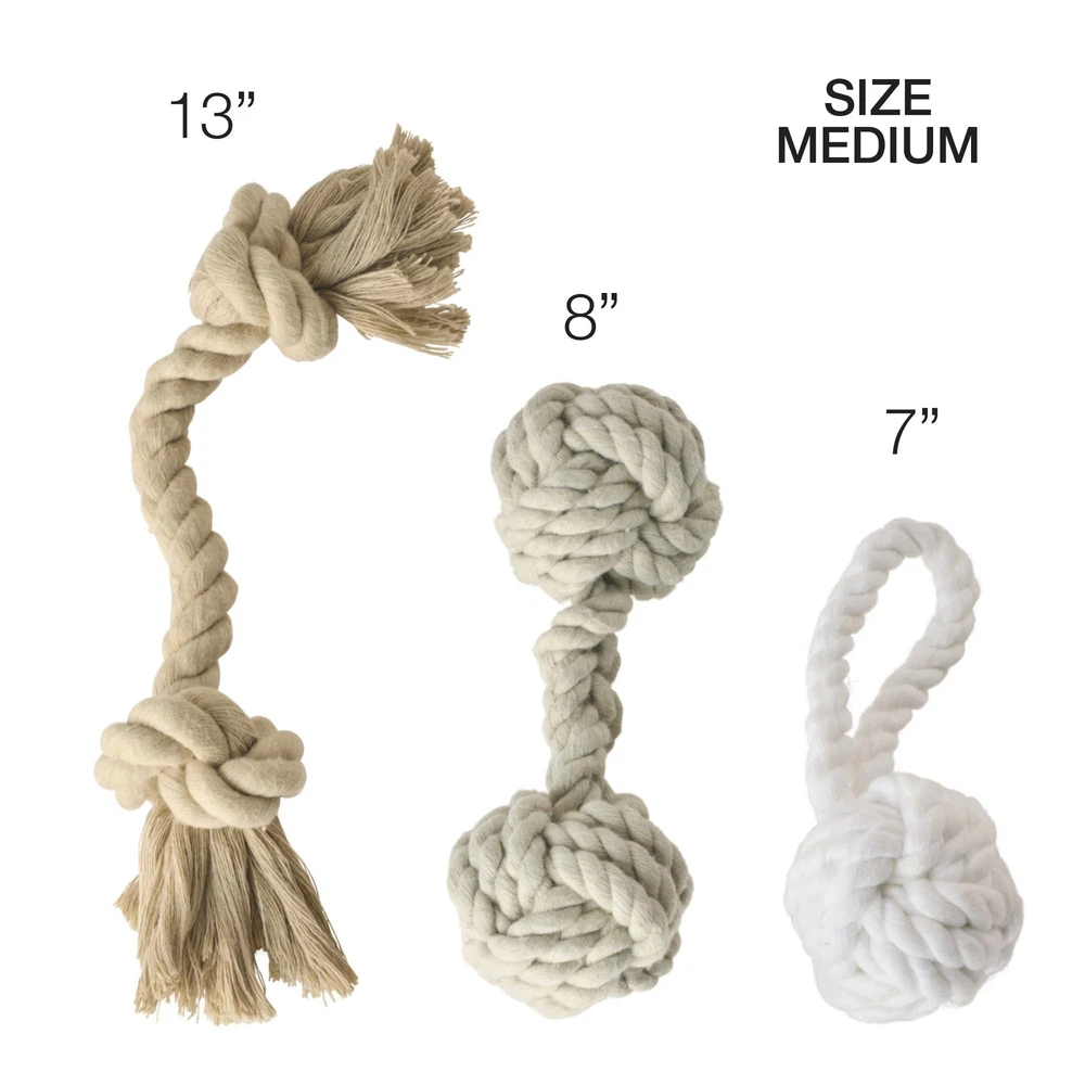 "Rope For The Best" 3-Pack Organic Cotton Dog Rope Pull Toys—the ultimate playtime companions for pets of all breeds! With these toys, it's play, tug, fetch, and repeat—keeping your furry friend entertained and happy for hours on end. Crafted from 100% organic cotton, they're not only pet-friendly but also earth-friendly, making them a guilt-free choice for environmentally conscious pet parents. Sturdy and washable, these toys are designed to withstand even the toughest play sessions. Their durable materials and tug toy design make them perfect for interactive play, promoting healthy exercise and bonding between you and your pet. Plus, they come highly recommended by our furry testers, earning 5-paws for fun! Whether it's a birthday, holiday, or just because, our 3-Pack Organic Cotton Dog Rope Pull Toys make the paw-fect gift for all your beloved fur babies! SUSTAINABLE - Crafted from 100% organic cotton FUNCTIONAL - Designed for tug and fetch. VERSATILE - For all dog breeds large and small and includes 3 different rope toys COMFORTABLE - Enjoy interactive play with your dog. Made of durable cotton for endless hours of tug and fetch. PACKAGING: Printed on recycled paper and sustainably made in eco-conscious solar-powered facility. Please recycle!