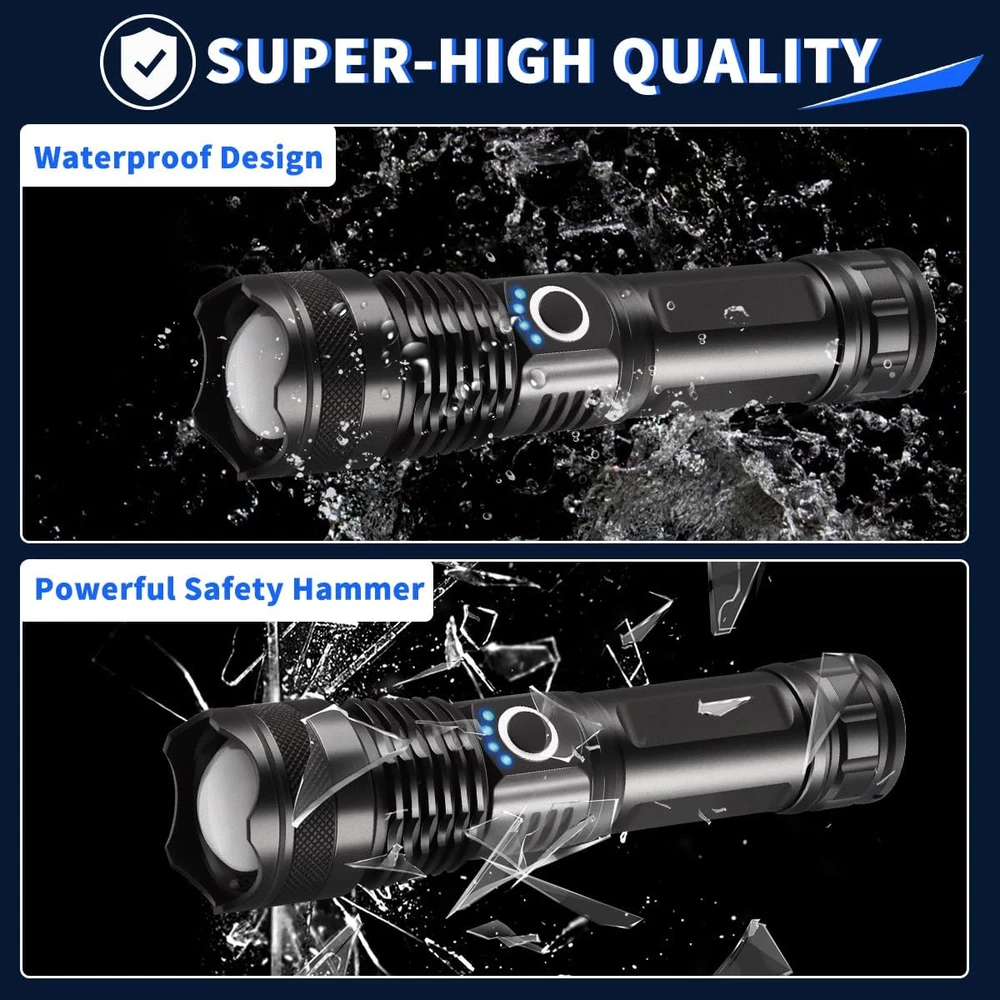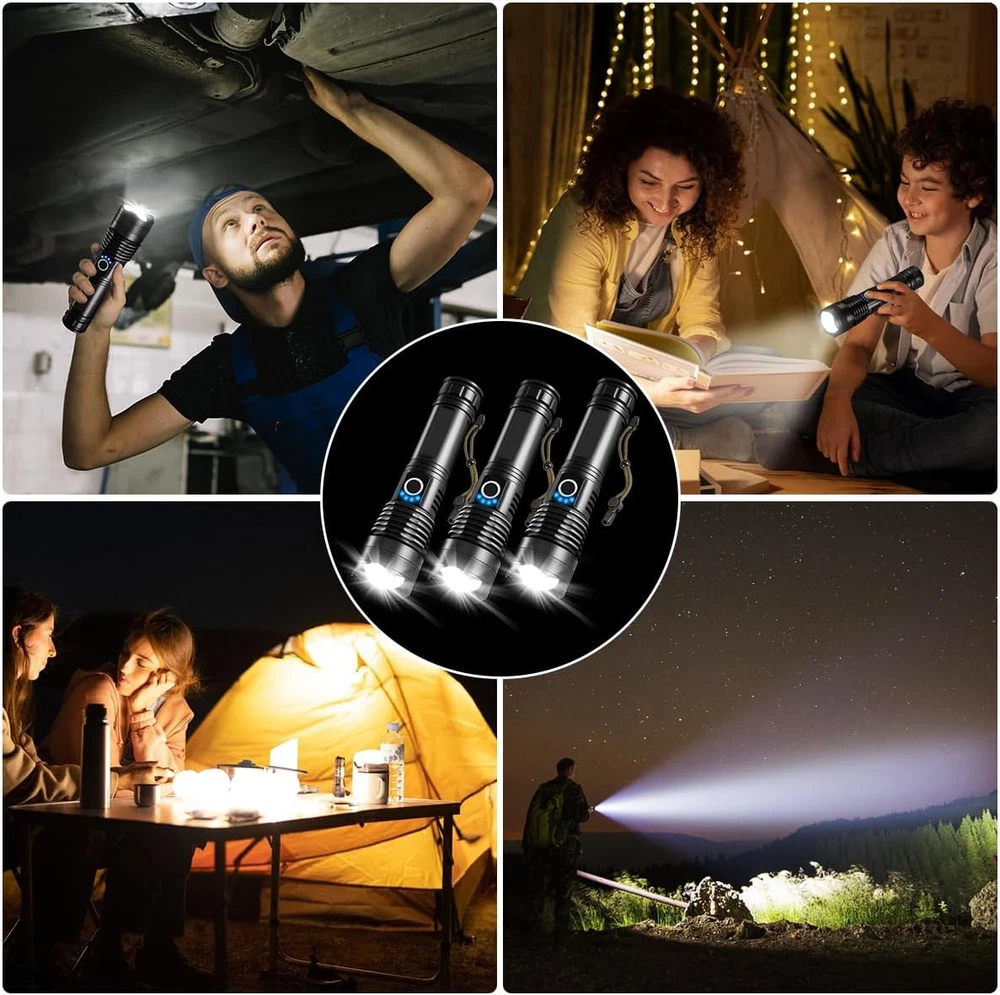 Flashlights High Lumens: Flashlights high lumens are equipped with a upgraded bright LED chip, lighting up to 1000ft² area or 1500ft distance, this rechargeable flashlights high lumens will easily light up your entire home or backyard Rechargeable Flashlights: Rechargeable flashlights with high-capacity rechargeable battery for long-time use and led flashlights also comes with a power indicator, which prevents it from suddenly running out of power while in use 5 Modes & Adjustable Focus: The bright flashlight has 5 modes: high/medium/low/strobe/SOS, and you can also change the size of the beam by adjusting the focus of the flashlight, which can meet your needs in different situations Fine Aluminum & Compact: Tactical flashlight is made of fine aluminum with good heat dissipation and impact resistance, and its compact body design and light weight of 6.8 ounces make it a good companion for you to carry Support Service: UUYEE offers a 12-month replacement policy for flash light. Any problems, such as not light up, please feel free to contact us by clicking the " GET HELP WITH ORDER " under your order ID. Meanwhile, family size 3pack flashlights rechargeable will be a wonderful choice on Valentine's Day, Father's Day, Halloween, Thanksgiving or Christmas, to your father, mother, man, women, brother, sister and family member Product Description 3 PACK RECHARGEABLE FLASHLIGHTS HIGH LUMENS 1 RECHARGEABLE 2 WATERPROOF 1 ZOOM IN 2 ZOOM OUT