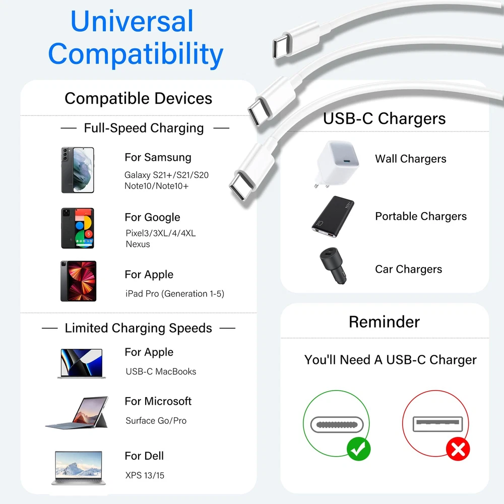 3Pack USB C to USB C Charger Cable 6ft 60W for Apple Long Type C Fast Charging Cord for iPhone 15/Pro Max/Plus for MacBook Pro 2020 IPad Pro12.9/11, for iPad Air 4/5/Mini 6(White) Charge Compatibility List : Match all PD USB C charger. for iPhone 15/ 15 Plus/ 15 Pro/15Pro Max, Compatible with MacBook Pro 13 inch, MacBook 12 inch 2020, 2019, 2018, 2017, 2016, for New MacBook Air 2020 / 2019 / 2018, Compatible with iPad Pro 2018/2020/2021/2022, iPad Mini 6 2021, Air 4 2020, for Samsung Galaxy S22/ S22+/ S22 Ultra/ S21/ S21+/ S21 Ultra/ S20/ S20+/ S20 Ultra/ Note 20/ Note 20 Ultra/Note 10/ Note 10+/ A80, for Google Pixel 4 3 2, 4XL, 3XL, 2XL, XL. USB C to USB C Cable : This is a USB-C to USB-C cable, which means it has the same USB C plug on both ends. (Note: Charging speeds also depends on your device and charger. Pair your C-Port devices with USB-C Chargers including and various 100w 96w 65w 60w 45w 30w 18w USB-C Power Adapters.) What you get : 3 × USB C to USB C Charger Cable (6 ft), 6-Month worry-free period, If you have any questions, please contact us for free, we will solve issues within 24 hours. Built to Last : Our softest cable ever is also one of our strongest. Thanks to a 30,000-bend lifespan, this cable is more than ready to handle the stresses and strains of charging on the go. 6ft long cable : 2 meters long fast charge cable, You can charge your devices from a distance on the sofa, in bed, in the back seat of your car, offers fast charging at home, in the office, or on the go. let you can work and charge for your Laptop or Tablet anywhere. Compatibility List : Match all PD USB C charger. for iPhone 15/ 15 Plus/ 15 Pro/15Pro Max, Compatible with MacBook Pro 13 inch, MacBook 12 inch 2020, 2019, 2018, 2017, 2016, for New MacBook Air 2020 / 2019 / 2018, Compatible with iPad Pro 2018/2020/2021/2022, iPad Mini 6 2021, Air 4 2020, for Samsung Galaxy S22/ S22+/ S22 Ultra/ S21/ S21+/ S21 Ultra/ S20/ S20+/ S20 Ultra/ Note 20/ Note 20 Ultra/Note 10/ Note 10+/ A80, for Google Pixel 4 3 2, 4XL, 3XL, 2XL, XL. USB C to USB C Cable : This is a USB-C to USB-C cable, which means it has the same USB C plug on both ends. (Note: Charging speeds also depends on your device and charger. Pair your C-Port devices with USB-C Chargers including and various 100w 96w 65w 60w 45w 30w 18w USB-C Power Adapters.) What you get : 3 × USB C to USB C Charger Cable (6 ft), 6-Month worry-free period, If you have any questions, please contact us for free, we will solve issues within 24 hours. Built to Last : Our softest cable ever is also one of our strongest. Thanks to a 30,000-bend lifespan, this cable is more than ready to handle the stresses and strains of charging on the go. 6ft long cable : 2 meters long fast charge cable, You can charge your devices from a distance on the sofa, in bed, in the back seat of your car, offers fast charging at home, in the office, or on the go. let you can work and charge for your Laptop or Tablet anywhere. Shipping from the USA All of our products are shipped from the USA, ensuring quick delivery to your destination. Payment We offer the following payment methods: PayPal, credit card, bank transfer, and eBay's secure payment system. Free Shipping & Free Returns Shipping within the USA is FREE. Additionally, any return is absolutely free for you. Risk-Free Purchase You have the option to return an item within 30 days without any justification. We cover the return shipping costs! Fast Shipping We ship immediately upon receipt of payment. Generally, the package is delivered within 2-3 days in the USA. If it takes longer, we will contact you. Quality and Costs Made in Europe, USA, China No customs fees or additional charges Total satisfaction guarantee Invoice with declared VAT available upon request in .pdf format Feedback Your feedback is very important to us. After you pay for your purchase, you will automatically receive positive feedback from us.