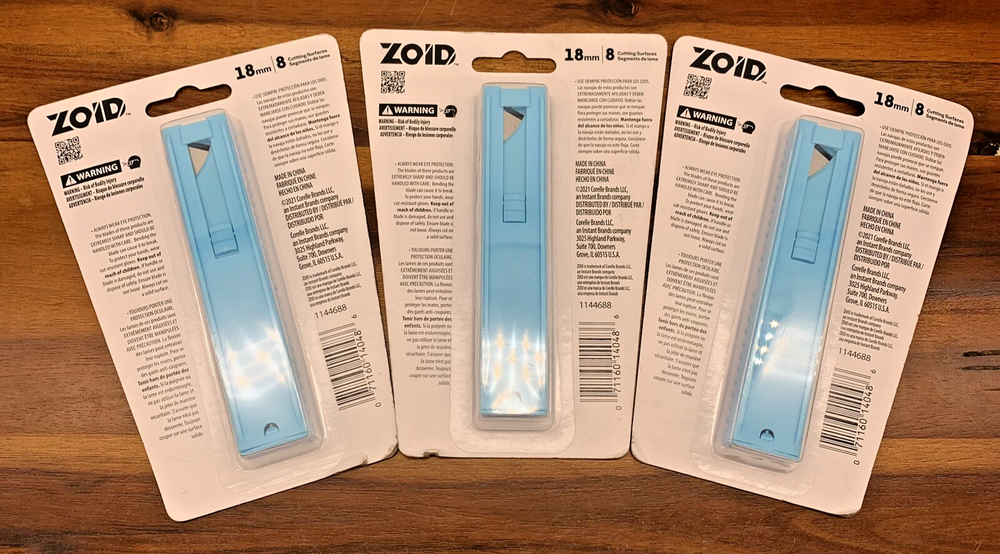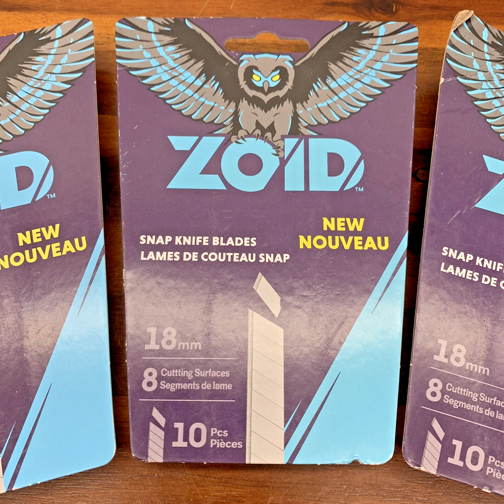 3 Packages ZOID 18mm Snap Knife Blades w/8 Cutting Surfaces Utility Blades All brand new, never opened! Three Packages! Please zoom in on photos for a better view of the item's condition. We do our absolute best to research all items we sell. If you ever have questions, please reach out to me! We will always package items securely and with care. Thank you for viewing and please visit our store for more awesome new and vintage goodies!