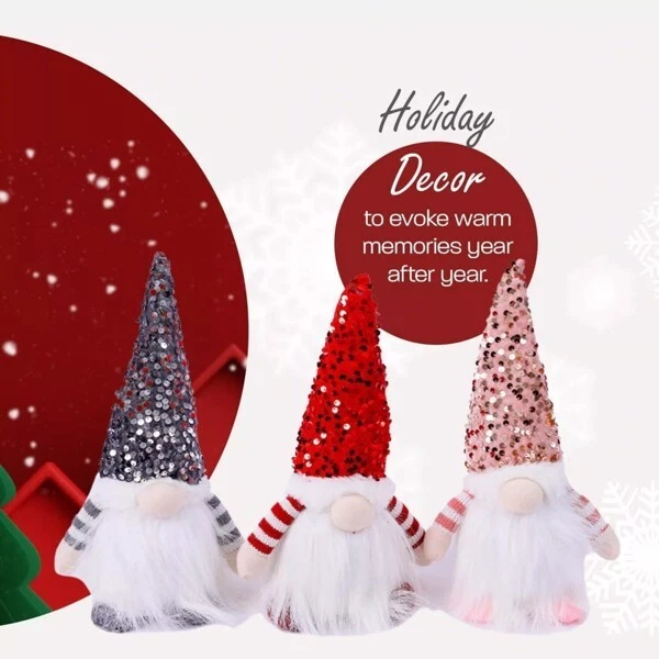 Specifications: Material: Polyester Size: 12(H) x4(W) Inches Power:3x AAA Battery Each (not included) Package: 3 x Christmas Gnome Plush Santa Claus Features Set of 3 Mini Lighted Christmas Gnomes : These adorable lighted Xmas decorative plush gnomes wearing red, green and grey pointy hats with long white beard and a white ball on the top, perfect tabletop decorations that are indispensable in your home. They are popular motif around holidays and very suitable for spreading the traditional spirit Suitable Size : Please note the size of our mini Xmas gnome before you order, these are really cute figurines. The handmade pointed hat gnomes are 9 inches high from the head to toes and 4.1 inches wide. This size gnome is a great view on the tabletop. 1 set includes 3 lighted holiday gnomes. They are perfect addition to the Christmas home decor collection Light Up Your Holiday : There are warm white LED lights on their round bellies. When you turn on the switch that at the bottom, the light vivid emit a warm mood, creating an peaceful atmosphere. 3 button batteries operated(Include). Recommended Age Grading:3+ Premium Quality : Each Xmas plush gnome is handmade of top & safe materials. Their body is crafted from soft felt and plastic, the bendable wire in his ridiculously tall hat, so that the hat can be bent to your liking. The long white beard is made from fiber fur. Each one is specially handmade with lots of love by professional artisans Perfect Christmas Gift : These 3 pack cute light up plush figurines will be a unique gift for anyone during holiday seasons. They are ideal Christmas decorations, create a whimsical touch to home decorations to decorative your table, shelf, home, desk, fireplace, parties bars, bedrooms, kitchen, office decor and so on 3 Pack Christmas Plush Gnome, Handmade Scandinavian Swedish Tomte Set of 3 Christmas plush gnomes, also is known as a Tomte or Nisse. These handmade Swedish Tomte dolls are welcome any time of the year. Not only for Christmas! Each Christmas plush gnome is handmade of top & safe materials. This adorable Gnome plush Santa is perfect gift for kids and adult. Not only for Christmas party, but also for Thanksgiving day, Birthday and so on. Notes: 1. Please allow 1-3 cm difference due to manual measurement and 3-5 g for the difference between different colors. 2. Due to the screen difference, the color may be a little difference from what you expect, please allow it.