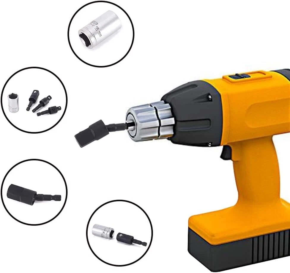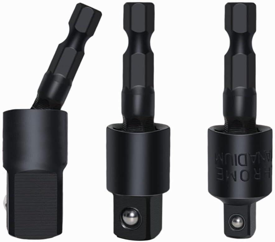 3 sizes: 1/4" hex to 1/4", 3/8" and 1/2" socket adapters. They will turn your power drill or impact driver into a versatile high-speed nut driver. Quick change 1/4-inch hex shank makes for easy, convenient bit switches and is compatible with impact ready power tools. This adapter set is designed to provide a securely locked in extension to your existing tool. Provides additional length to reach into a multitude of hard to reach spaces. The spring ball lock ensures a tight fit into the driver head to prevent slipping during use. Every adapter is embedded with a spring-loaded stainless steel tension ball to assure a quick and firm lock. The connected socket wrench will keep in place for heavy-duty work. Specification: Material: High-speed steel(HSS 4341) Color: Titanium coating Type of shank: 1/4 inch hex / 6.35mm Package includes: 1/4 * 1/4 * 65mm length -- 1/4 " shank can be converted to 6.35mm square head 3/8 * 1/4 * 65mm length -- 1/4 " shank can be converted to 9mm square head 1/2 * 1/4 * 72mm length -- 1/4 " shank can be converted to 13mm square head