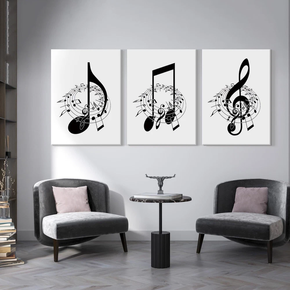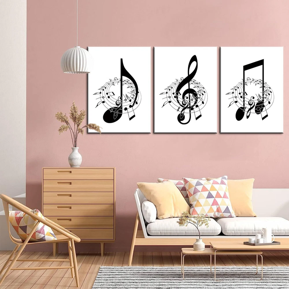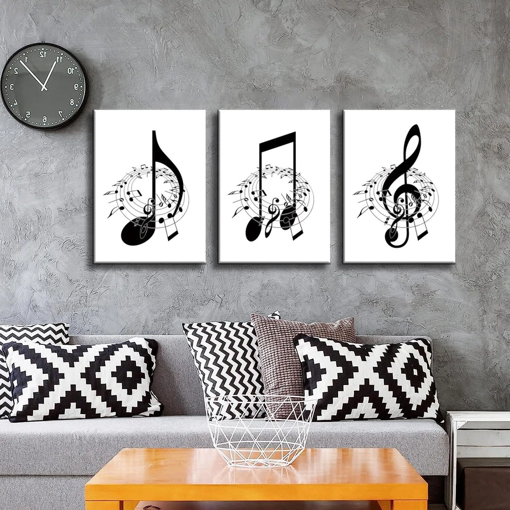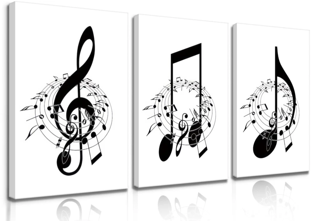 [Music Decor Size]:Music wall decor canvas art print set is 16"x24"x3 pcs (40x60cm x3 pcs)framed,Ready to hang [Black and White Wall Decor]:Music notes wall decor painting reflects your noble temperament and quality, And also has a strong sense of art, The presence of music note wall art adds a touch of elegance and sophistication to any room. [Suitable For Any Space]:High definition modern canvas printings artwork, Strong sense of texture,Full of artistic. The perfect wall decorative painting give your home living room, Bedroom, Kitchen, Office, hotel, Restaurant, Bedroom, Guesthouse, Gym and so on add the elegant artistic atmosphere. [Perfect Gift]:Music notes wall decor are a good choice as gifts for your family, Classmates,Partners,Friends,or workmates on wedding days, Holidays,anniversary, Thanksgiving, Christmas, Valentine's day, Birthday. [Multiple sizes] You can choose a variety of sizes and styles of wall art to meet the needs of different occasions and personal preferences, can add a touch of art to your space, highlighting the unique personality and taste.