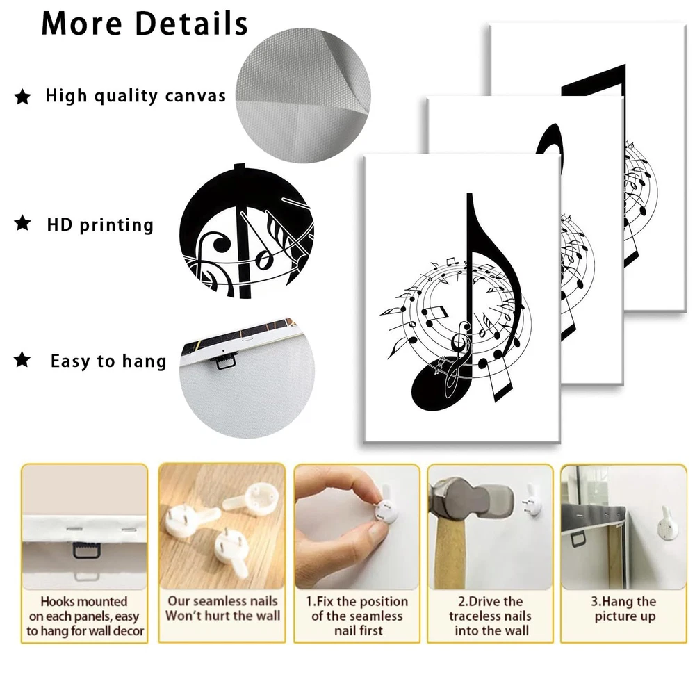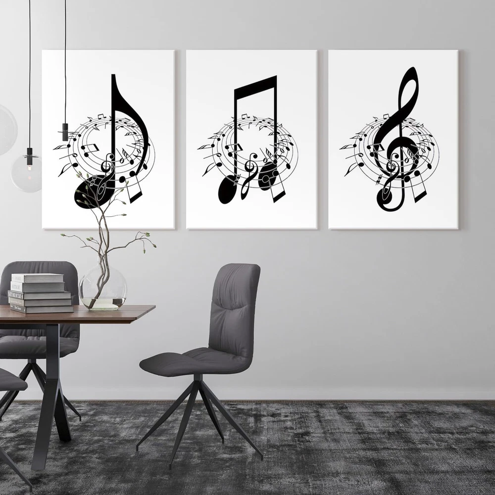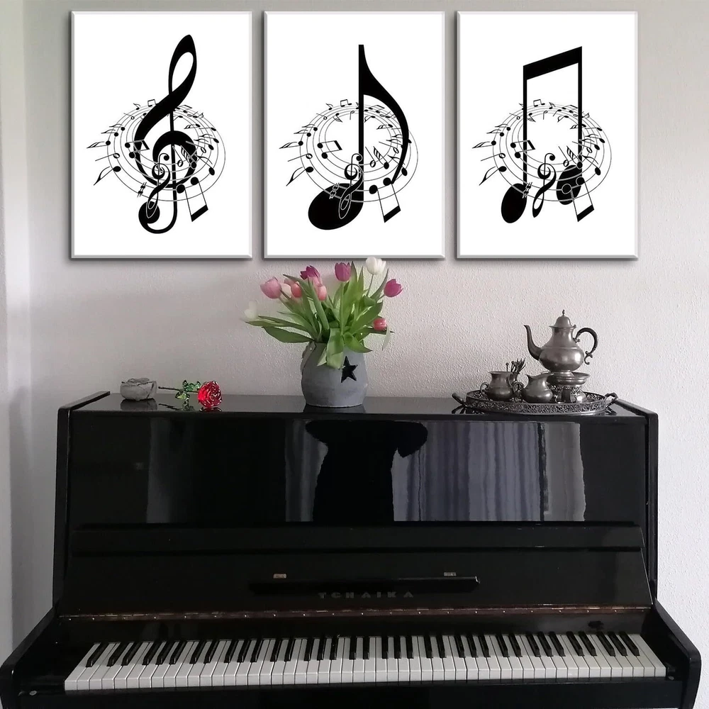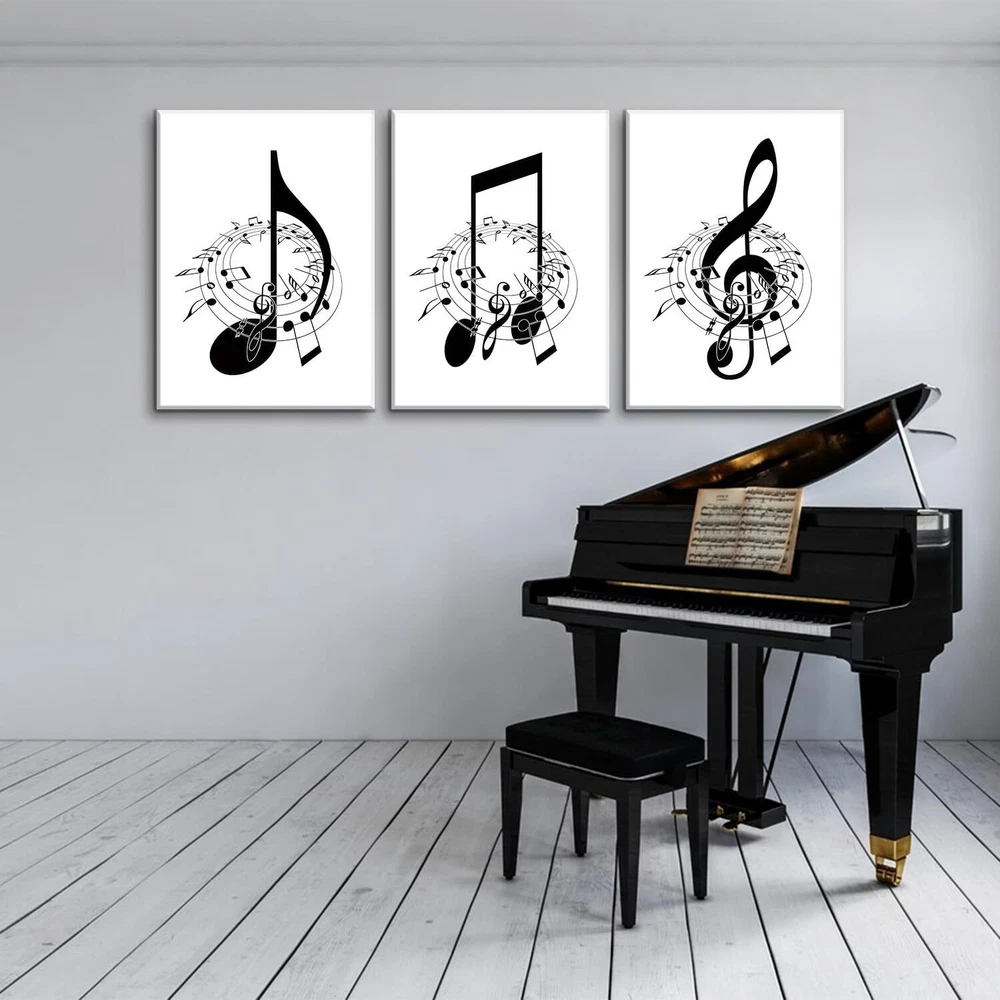 [Music Decor Size]:Music wall decor canvas art print set is 16"x24"x3 pcs (40x60cm x3 pcs)framed,Ready to hang [Black and White Wall Decor]:Music notes wall decor painting reflects your noble temperament and quality, And also has a strong sense of art, The presence of music note wall art adds a touch of elegance and sophistication to any room. [Suitable For Any Space]:High definition modern canvas printings artwork, Strong sense of texture,Full of artistic. The perfect wall decorative painting give your home living room, Bedroom, Kitchen, Office, hotel, Restaurant, Bedroom, Guesthouse, Gym and so on add the elegant artistic atmosphere. [Perfect Gift]:Music notes wall decor are a good choice as gifts for your family, Classmates,Partners,Friends,or workmates on wedding days, Holidays,anniversary, Thanksgiving, Christmas, Valentine's day, Birthday. [Multiple sizes] You can choose a variety of sizes and styles of wall art to meet the needs of different occasions and personal preferences, can add a touch of art to your space, highlighting the unique personality and taste.