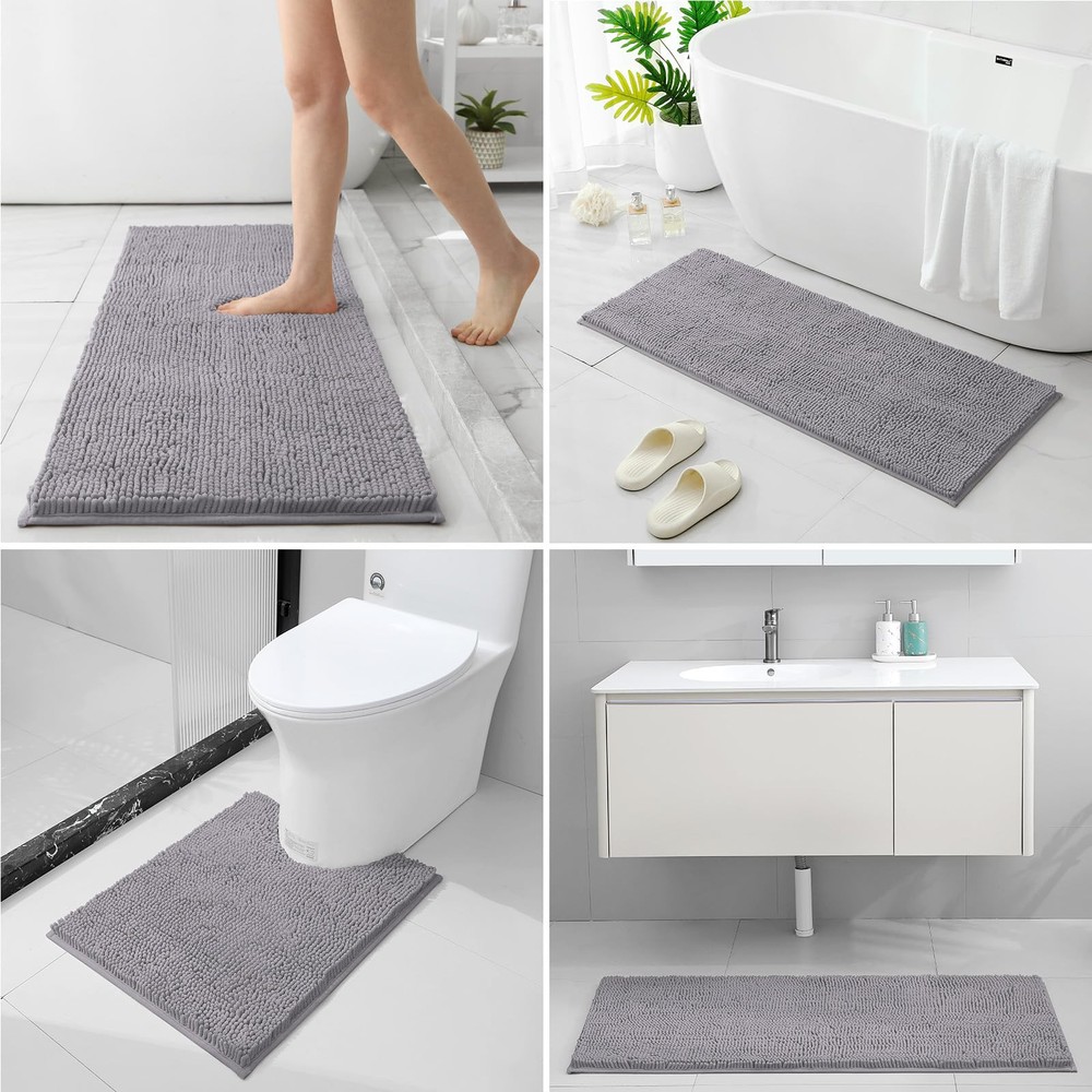 COMPLETE 3 PIECES BATHROOM RUGS: Include 1 Small Bath Rug 17"x24", 1 U-Shape Contoured Rug 20"x24", 1 Long Bath Rug 20"x48". Unique fiber-locking technique, say goodbye to horrible fiber-dropping! Thicker and better constructed than most other rugs. Suitable for hotel, sauna, shower, gym for bathroom, bedroom, dining room, living room, and so on. NON-SLIP BATH RUGS: The bottom is made of high-quality PVC material. This anti-skid backing has practically slip resistance on the tile floor surface, that it won’t slip or slide to keep you more safe and cozy. Unlike other rugs where the rubber backing tends to wear and peel off after several washes. The rugs are much stronger and durable for long-lasting use. ULTRA SOFT: These upgraded luxurious shag rugs can soak up the water and keep your floor dry like a gaint sponge, made of plenty of shaggy microfibers, each fiber about 1 inch and more compact and thick to arrange together, the rug set soft enough like sinking into a deep shag pile while you step on it. HIGH WATER ABSORBENCY: High-pile, thick Chenille fabric helps save your floors from dripping water while you're stepping out of the bath, bathtub, shower, or getting ready by the sink. Moisture is trapped in the bathroom mat's deep pile, allowing the rug to dry quickly and cleanly. Place rug on CLEAN DRY SMOOTH FLOOR only. Water under the rug can cause it to slip. Keep bottom of rug dry. MACHINE WASHABLE: Wash with cold water and mild detergent. Hang to dry, or air dry flat. Do not Bleach or Dry Clean. It's really easy to handle and care for. Colors remain nice and vibrant even after many washes