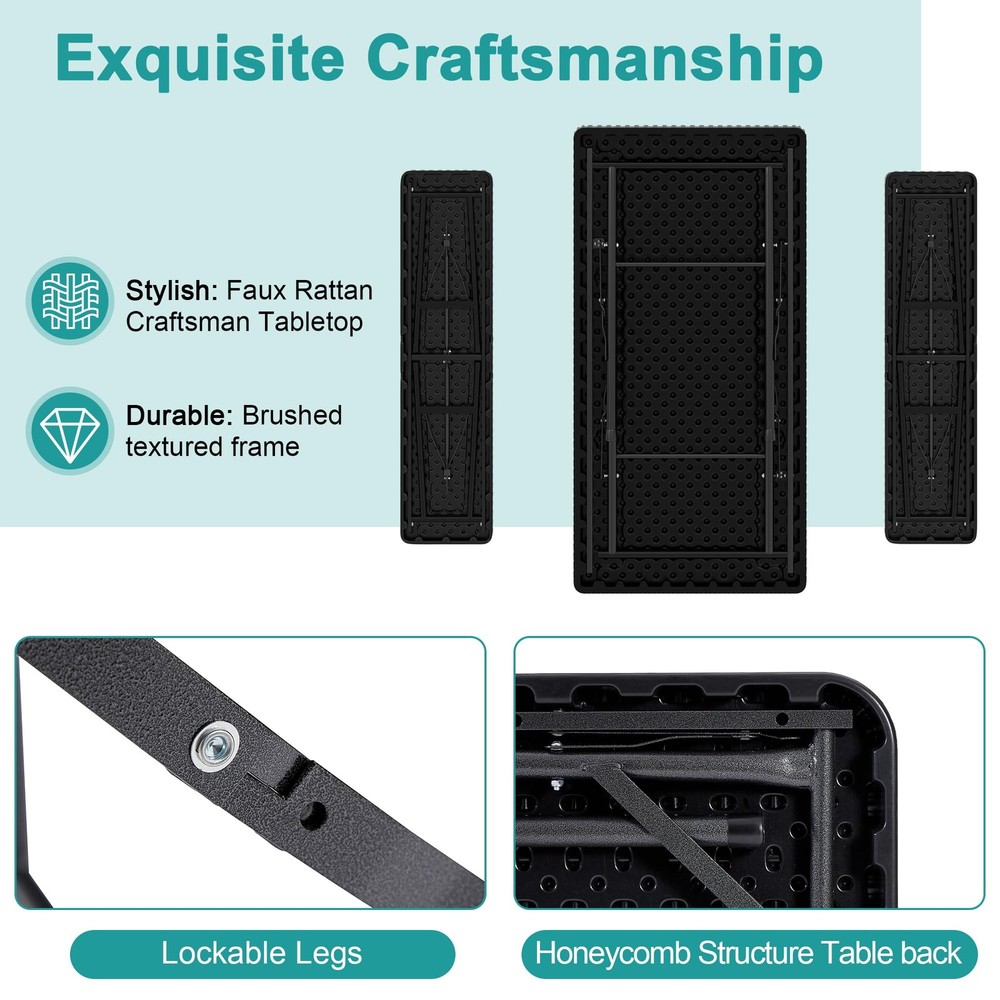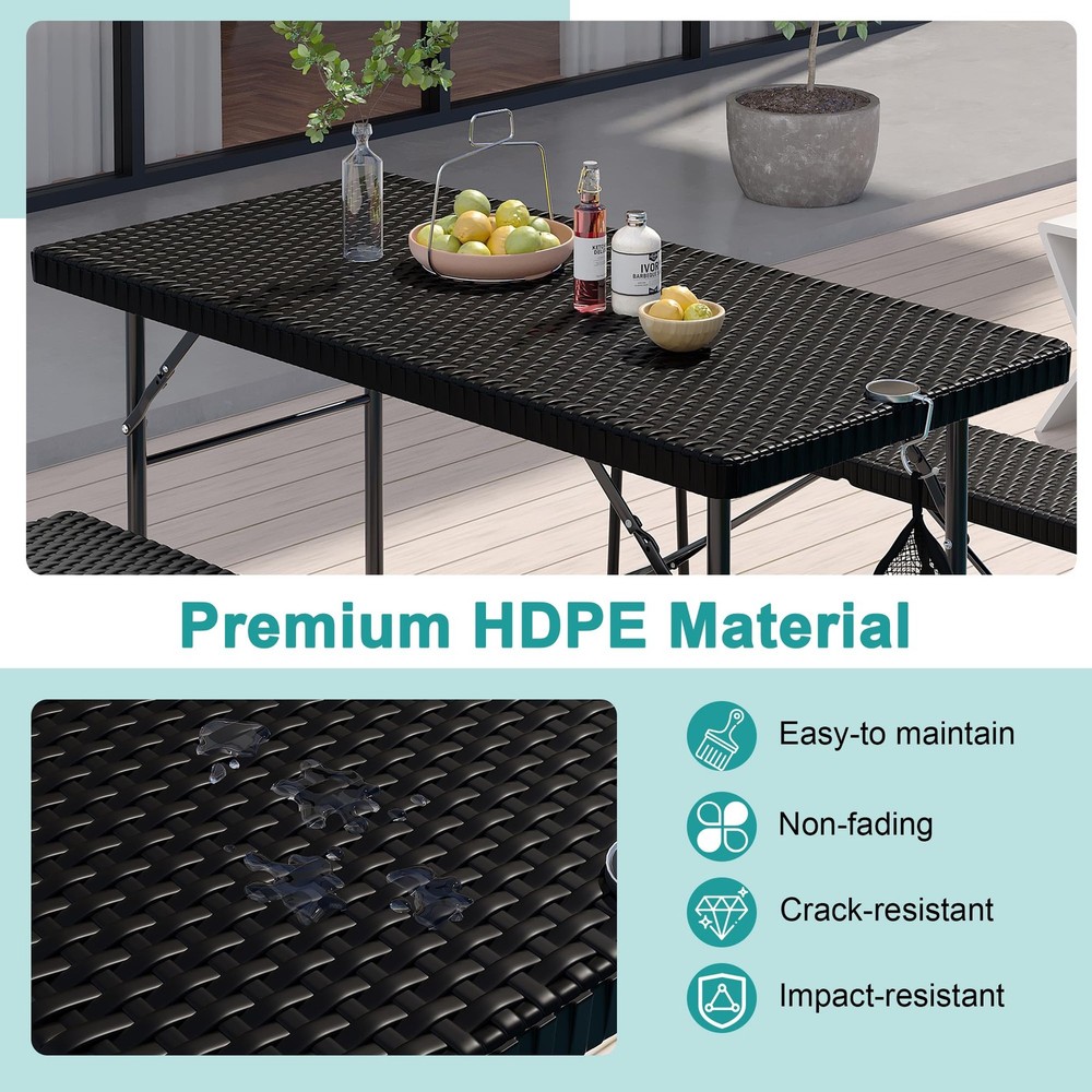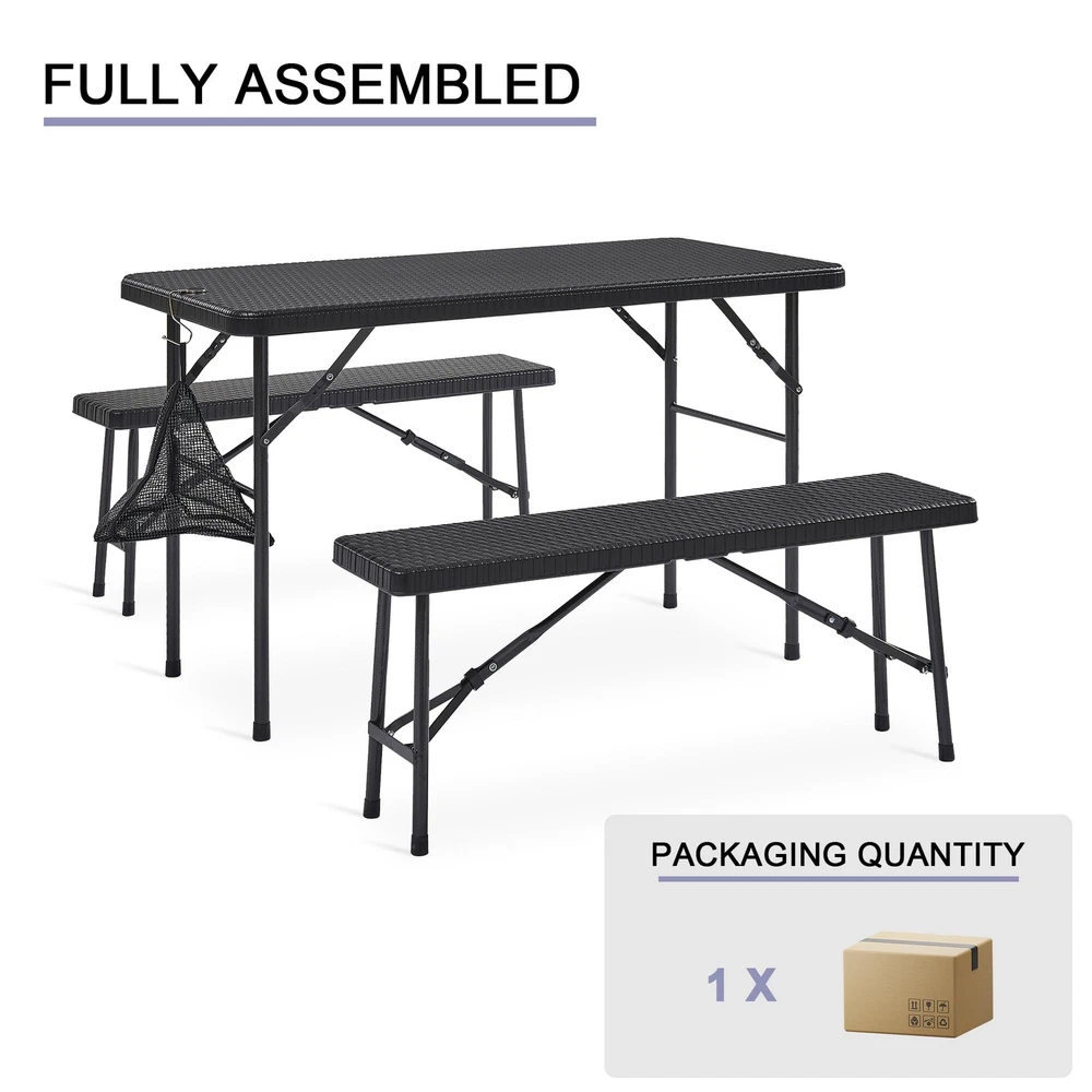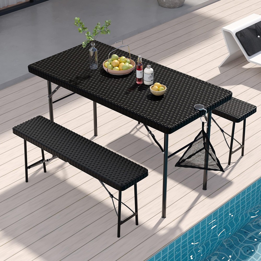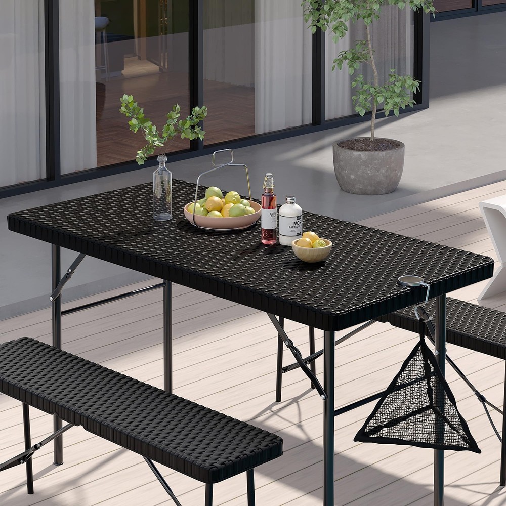 Faux Rattan Design - This folding table and chairs are crafted from faux woven rattan, featuring modern and stylish style. Perfect for decorating your patio, poolside, balcony, garden and porch. Ideal for both indoor and outdoor use, providing a place for you and your friends to enjoy and relax. Lightweight and Portable - The folding design of this folding table set allows for quick and easy storage. When folded, the table measures 47.2 x 24 x 1.57 inches and the benches measure 40.2 x 10 x 1.54 inches. This makes them easy to transport and store in a car trunk. With this set, you can enjoy a café experience right outside your door, making it an ideal solution. Durable and Easy to Clean - This folding patio table set is highly rust, water, and abrasion resistant! The galvanized iron frames are coated with an anti-rust layer to prevent corrosion and decay. The tabletops are also made from a waterproof HDPE material, providing great support while being easy to clean. Sturdy Weight Capacity - The folding table and chairs set are constructed from heavy-duty steel frames with snap-lock mechanisms for stability during use. When set up it can comfortably accommodate 4 people. Recommended weight capacities are 400 lbs for the table and 550 lbs per benches. No Assembly Required - The bistro set requires no assembly, taking just 20 seconds to fully unfold and be ready for use. [With a Mesh Bag] - For containing small items and keeping the tabletop tidy.