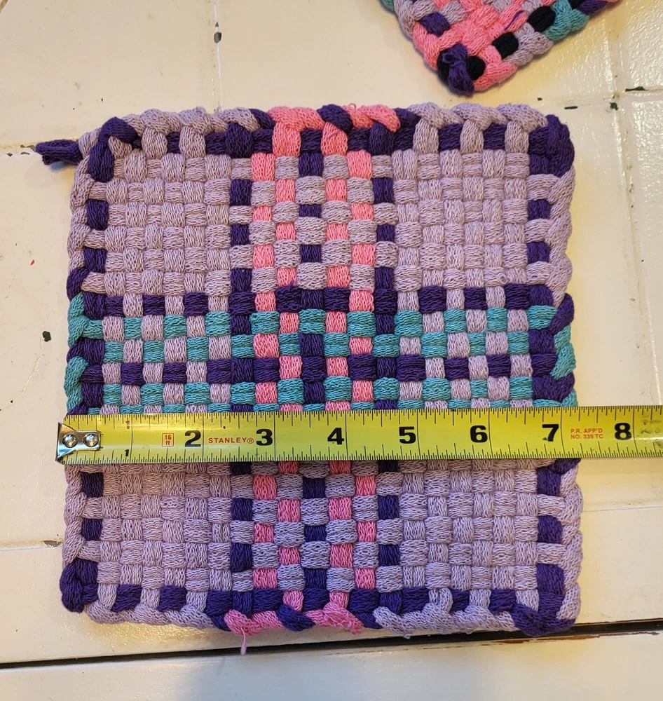 Add a touch of spring to your kitchen with this set of 2 handmade purple, pink, and turquoise woven potholders and 1 purple dishrag. Made from cotton, these traditional-style kitchen accessories are perfect for Easter and multipurpose use.