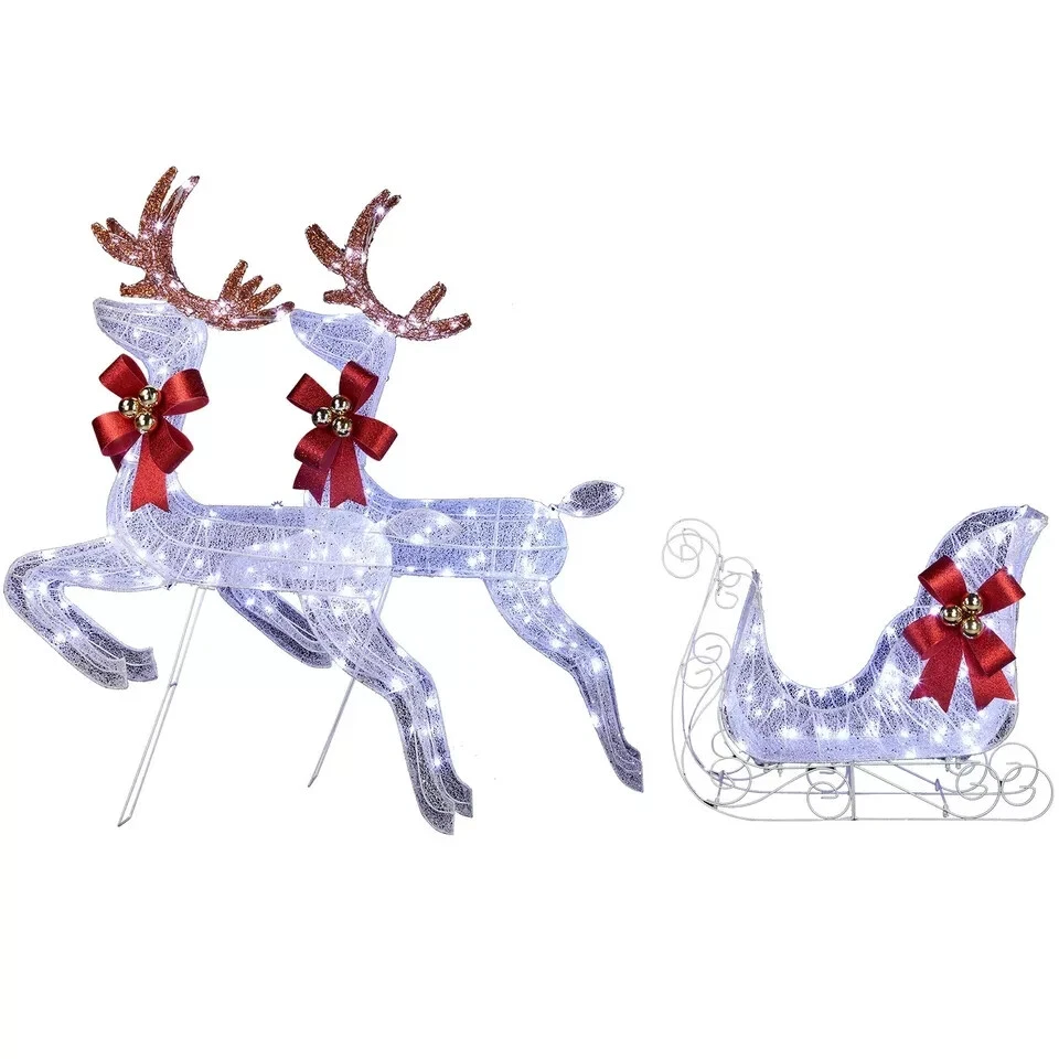 Product Description:- Introductions: This charming 3-Piece Lighted Set of 2 Reindeer & Sleigh is the perfect addition to your holiday décor. Featuring two reindeer pulling a santa's sleigh, this set is beautifully adorned with festive bowknots and sparkling glitter, capturing the magic of the holiday season. With its durable, weatherproof design and warm LED lights, it adds a cozy, enchanting glow to any indoor or outdoor space. Easy to assemble and store, this reindeer set will bring joy and festive cheer to your home year after year. Features: 1. Charming Reindeer & Sleigh Set: This delightful set features two reindeer pulling a santa's sleigh, each detailed with a festive bowknot and glistening glitter for added holiday sparkle. Loved by both kids and adults, this reindeer and sleigh set is sure to bring warmth and festive joy to your outdoor or indoor Christmas decorations. 2. Eye-Catching LED Lights: Pre-lit with 270 white LEDs, these reindeer glow beautifully in the night, creating an inviting holiday atmosphere. The well-placed LED lights make the reindeer a stunning focal point for your Christmas display, both day and night. 3. Weather-Resistant and Sturdy Build: Made from a durable, rustproof metal frame with waterproof fabric, the reindeer set is built to withstand wind, rain, and snow. The included ground stakes provide extra stability, ensuring your decorations stay secure in winter weather. 4. Easy Assembly & Storage: This collapsible reindeer set can be set up in minutes, allowing you to enjoy your festive display without hassle. The lights are pre-installed, simply connect the wires and plug them in to watch them come to life. 5.Perfect Holiday Decor for Indoor & Outdoor: Whether placed indoors near your Christmas tree, on the porch, or outdoors in the yard, this lighted reindeer set enhances any holiday setting. Perfect for holiday parties, weddings, or as a festive yard display, these reindeer bring elegance and a joyful touch to your celebrations. Specifications: 1. Overall Dimensions: (83 x 10.8 x 39.4) in / (211 x 27.5 x 100) cm 2. Number of Lights: 270pcs 3. Light Color: White Package Includes: 1 x 2 Reindeer & Sleigh Set 1 x Set of Ground Stakes