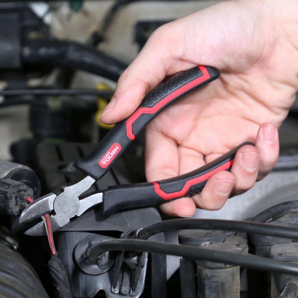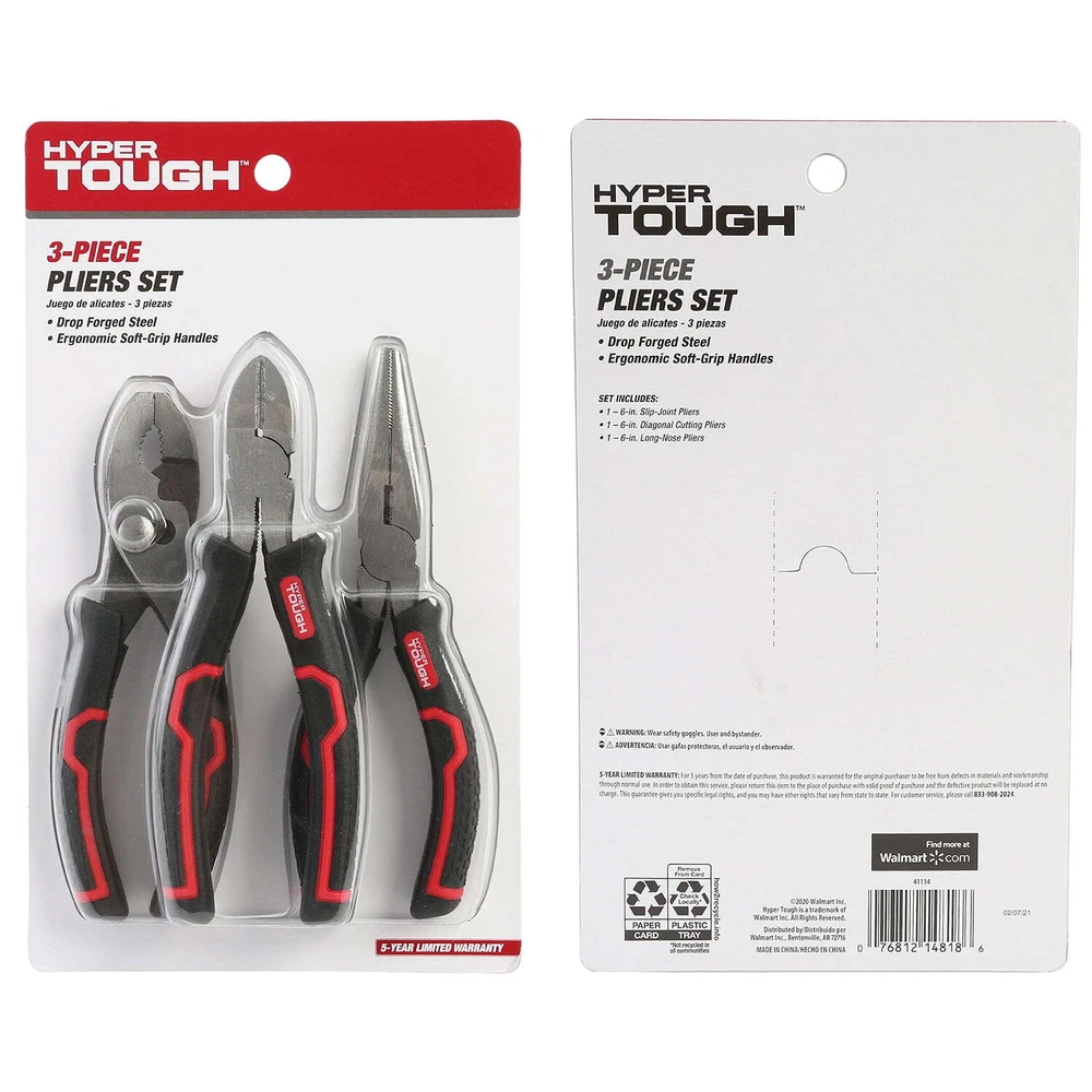 The New 3-Piece Pliers Set (Model 41114) includes the most common pliers essential for any tool box. These pliers are made from drop forged steel for strength and durability. Precision milled jaws and hardened cutting edges provide years of use at a great value. Heavy duty double molded grips minimize slippage and increase comfort. This set includes: 6-Inch Slip-Joint Pliers that feature a 2 position adjustable jaw for versatility, 6-Inch Diagonal Cutting Pliers which have honed and offset cutting jaws for flush cutting and 6-Inch Long-Nose Pliers which include a side cutter, are designed for secure gripping and accurate cutting in hard-to-reach spaces. New 3-Piece Pliers Set with Ergonomic Soft Grip Handles Ergonomic Soft-Grip Handles Heavy-Duty Steel Construction Includes: 1 - 6-Inch Slip-Joint Pliers, 1 - 6-Inch Diagonal Cutting Pliers, 1 - 6-Inch Long Nose Pliers