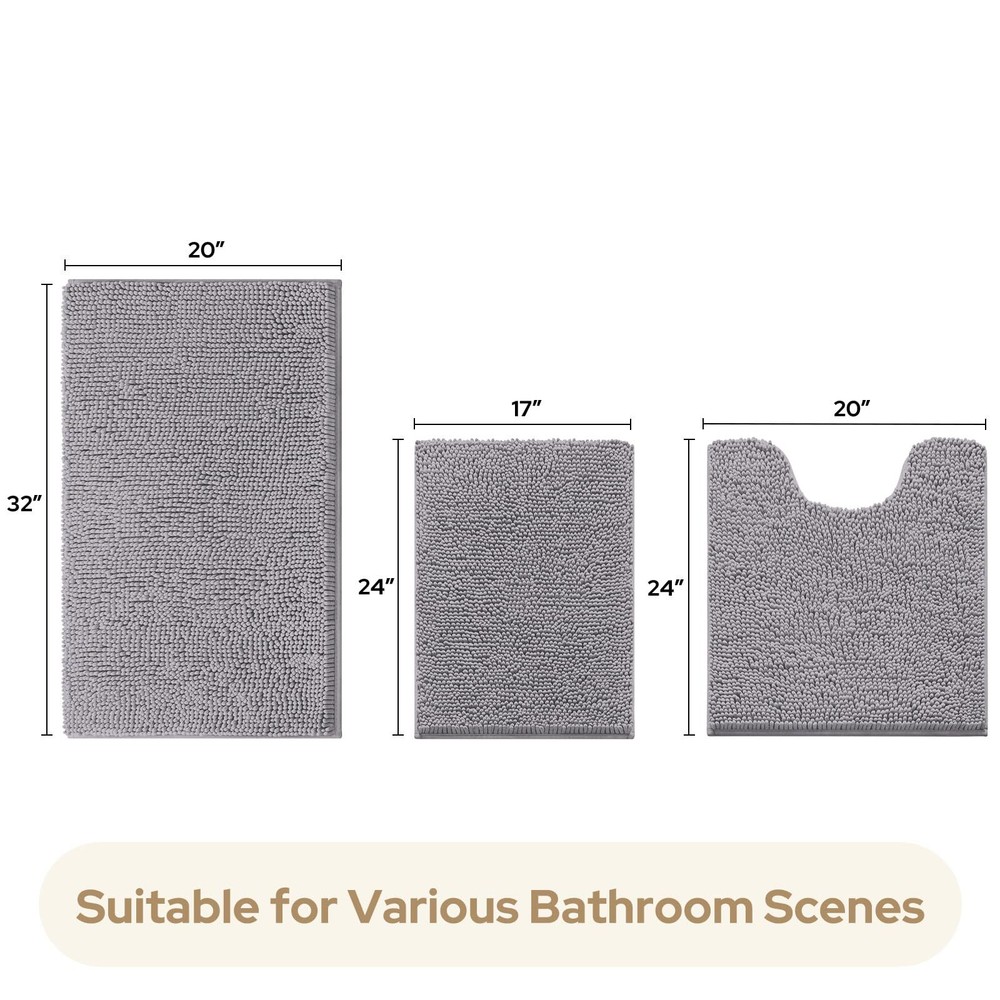 HOMEIDEAS 3 Pieces Bathroom Rugs, Ultra Soft Non Slip Absorbent Chenille Toilet Bath Mat Set (Grey) COMPLETE 3 PIECES BATHROOM RUGS: Include 1 Small Bath Rug 17"x24", 1 U-Shape Contoured Rug 20"x24", 1 Large Bath Rug 20"x32". Unique fiber-locking technique, say goodbye to horrible fiber-dropping! Thicker and better constructed than most other rugs. Suitable for hotel, sauna, shower, gym for bathroom, bedroom, dining room, living room, and so on. NON-SLIP BATH RUGS: The bottom is made of high-quality PVC material. This anti-skid backing has practically slip resistance on the tile floor surface, that it won’t slip or slide to keep you more safe and cozy. Unlike other rugs where the rubber backing tends to wear and peel off after several washes. The rugs are much stronger and durable for long-lasting use. ULTRA SOFT: These upgraded luxurious shag rugs can soak up the water and keep your floor dry like a gaint sponge, made of plenty of shaggy microfibers, each fiber about 1 inch and more compact and thick to arrange together, the rug set soft enough like sinking into a deep shag pile while you step on it. HIGH WATER ABSORBENCY: High-pile, thick Chenille fabric helps save your floors from dripping water while you're stepping out of the bath, bathtub, shower, or getting ready by the sink. Moisture is trapped in the bathroom mat's deep pile, allowing the rug to dry quickly and cleanly. Place rug on CLEAN DRY SMOOTH FLOOR only. Water under the rug can cause it to slip. Keep bottom of rug dry. MACHINE WASHABLE: Wash with cold water and mild detergent. Hang to dry, or air dry flat. Do not Bleach or Dry Clean. It's really easy to handle and care for. Colors remain nice and vibrant even after many washes SHIPPING Domestic Buyers - We have confidence in our products, but if you are not fully satisfied please contact us within 30 days of purchase and you will get full refund. - We ship within 3 business days of payment, usually sooner - We offer FREE shipping on all orders! - We only ship to the lower 48 states, no APO/FPO addresses or PO Boxes allowed International buyers – please note: Import duties, taxes, and charges aren't included in the item price or postage cost. These charges are the buyer's responsibility. - Please check with your country's customs office to determine what these additional costs will be prior to bidding or buying. * Order Cancellation Policy ** You can return a product for up to 30 days from the date you purchased it. 1. The seller reserves the right to cancel the special case only due to eBay cancellation fee. 2. The decision of seller is the final. 3. The seller will respond to the cancellation request within 2 business days. Please wait for the result of cancellation. 4. In case the cancellation is not completed by some reasons, the buyer can follow the options below to get the refund. 4.1 The buyer can reject the item when it arrives. 4.2 The buyer can send the item back to the seller within 30 days If the buyer receives item (USA Shipment ONLY). The seller will provide the FREE return label to the buyer when the buyer opens " Return Item" case on eBay by using the reason as "Change my mind" ONLY. 5. When buyer has placed the order. The order will be processed and completed by automatic warehouse system within 5 minutes. In case that buyer sends the cancellation request after 5 minutes of placing the order, the request will be rejected. **Sending direct message to cancel the order is not allowed for every case.* Return Policy For the return case - If buyer would like to return the items for refund or replacement, please CONTACT SELLER to receive the free return label from seller. The refund or replacement will be processed with the tracking number of return label which is provided by seller only. The other ways of return which are not approved by seller will not be processed for the refund or replacement.