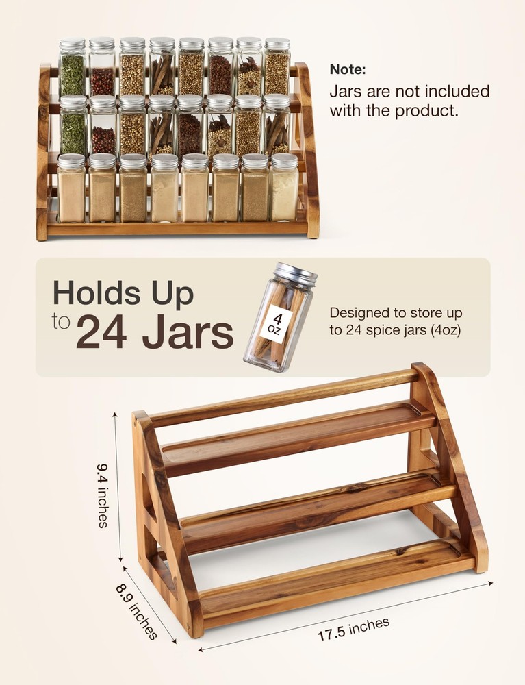 Acacia Wood 3-Tier Spice Rack Durable Acacia Wood Construction: Crafted from high-quality acacia wood, this organizer combines durability with an elegant wooden tray design, ideal for cabinet storage Holds Up to 24 Jars: Perfectly accommodates up to 24 spice jars (4oz), keeping your kitchen cabinet or pantry tidy. Note: Jars are not included Adjustable and Versatile: Suitable for use in cabinets, or countertops, offering flexible kitchen organization options for spices, seasoning, or pantry items Multi-Purpose Use: Besides spices, this tray can also organize other small items such as essential oils, baking supplies, or pantry essentials Effortless Assembly: This step stool is designed for easy and quick assembly. With clear instructions included, you’ll have your stool set up in no time, without the need for professional help