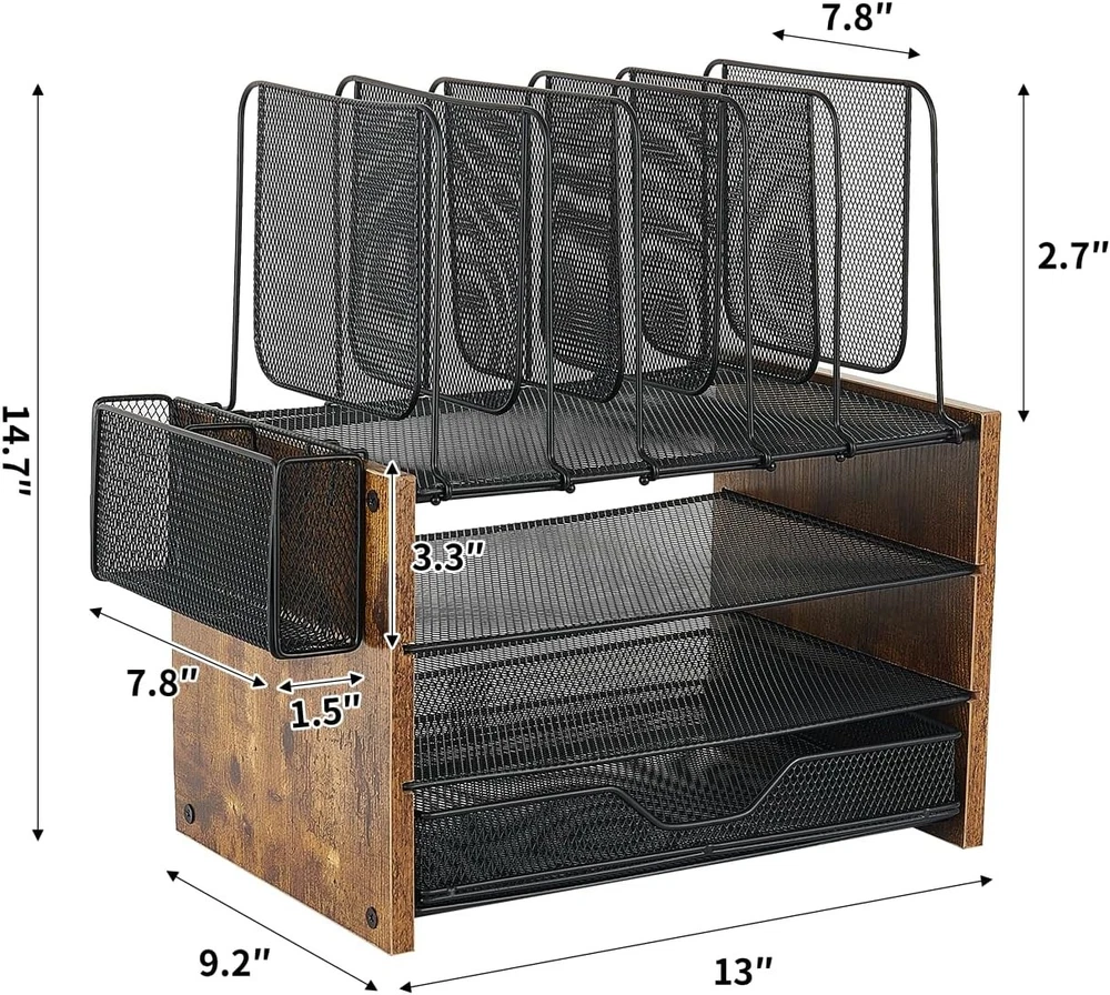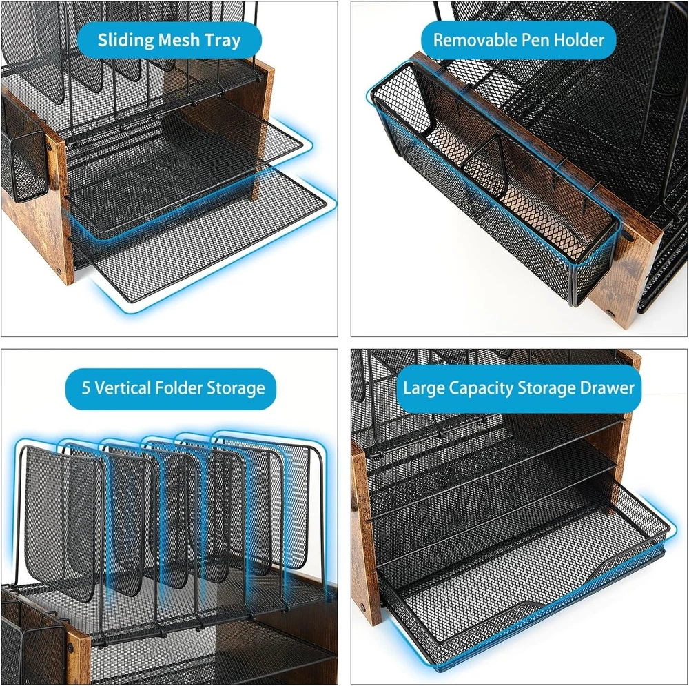 Wood Desk Organizers and Accessories with Drawer, 3-Tier brown Description Features: 【MAXIMIZE YOUR STORAGE】OPNICE wooden desk organizer transforms chaos into control—5 upright file shelves, pen holder, and sliding drawer save 40% desk space. A vertical desk file organizer that keeps essentials within reach, it’s the ultimate desktop organizer for streamlined workflows. 【EFFICIENCY ENHANCED】This high-capacity file organizer for desk stores folders, paper, and more for quick access and easy identification. Effortlessly organize your office supplies and office desk accessories to boost productivity and maintain focus. 【STRONG & STYLISH DESIGN】Crafted with quality wood and mesh metal, our paper organizer for desk ensures stability. Sleek design enhances workspace aesthetics, making you feel happy. Perfect for desk organization and office organization and storage. 【EASY ASSEMBLY】Our paper tray organizer for desk includes all parts and simple, clear instructions for quick assembly in just 3 minutes. Once built, it’s a versatile office desk organizer that’s easy to move, offering flexible desk top organizing solutions. 【WORRY-FREE SUPPORT】Enjoy 24-hour support and happy gifting. Your desk organizer tray is a practical desk accessory & workspace organizer and essential office organizer. Product Details: Specific Uses For Product: desk file organizer for office supplies Material: Wood, Metal Special Feature: Vintage wood, Rust Resistant Color: brown Brand: OPNICE Finish Type: Powder Coated Product Dimensions: 9.2"D x 13.5"W x 14.9"H Shape: Rectangular Number of Items: 1 Manufacturer: OPNICE Item Weight: 6.07 pounds Item model number: OP1TT Finish: Powder Coated Item Package Quantity: 1 Special Features: Vintage wood, Rust Resistant Included Components: File Folder Desk Organizer Batteries Included?: No Batteries Required?: No Specific Uses For Product: desk file organizer for office supplies Material: Wood, Metal Special Feature: Vintage wood, Rust Resistant Color: brown Brand: OPNICE Finish Type: Powder Coated Product Dimensions: 9.2"D x 13.5"W x 14.9"H Shape: Rectangular Number of Items: 1 Manufacturer: OPNICE Mounting TypeUnit Count: Tabletop Mount1.0 Count Handling We will ship all orders within 3 business day of payment. Delivery We take pride in offering fast and reliable delivery for your orders! We are committed to getting your products to you as quickly as possible. Generally, we would like to inform you that all orders will be delivered to you within 1-3 business days after processing.However, in some cases, delivery times may vary depending on the buyer's location. Especially in remote or rural areas, the expected delivery time may be extended. In such situations, we do our best to ensure that your order reaches you as quickly as possible.If there are any delays, we will be happy to contact you to explain the situation. Our goal is to enhance your satisfaction with our fast delivery times. We work diligently to ensure that your order arrives safely.Trust us and enjoy our speedy delivery! Return Policy All items qualify for returns within 30 days of receipt. Buyer is responsible for return shipping on any item that is not damaged. Feedback We take our reputation seriously, we buy and sell online, so we understand the value of trust. If you are unsatisfied with your order, please contact us and we will work with you to resolve it to your satisfaction.
