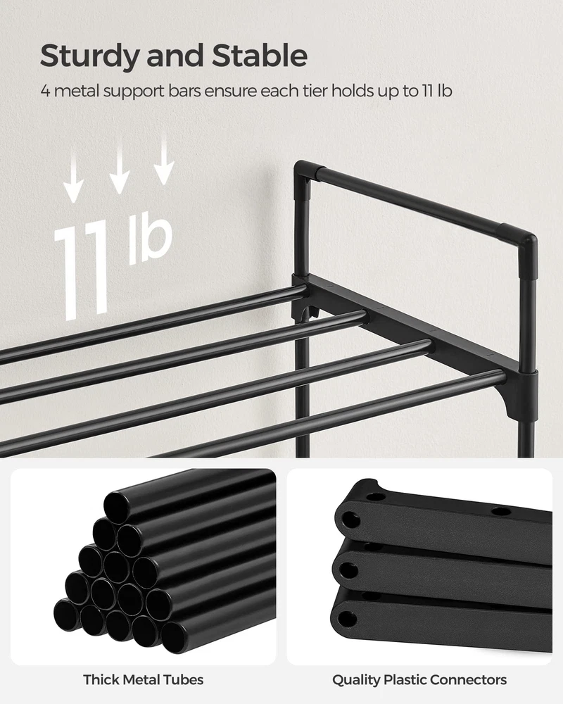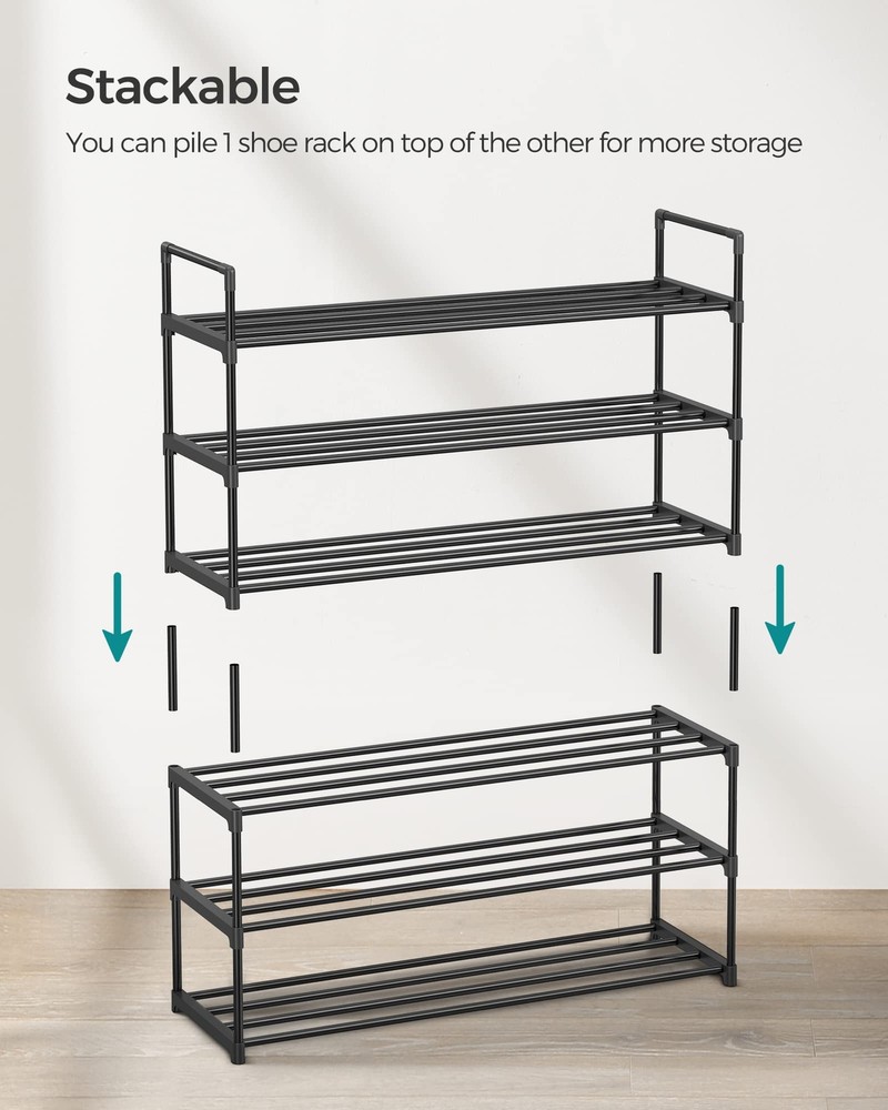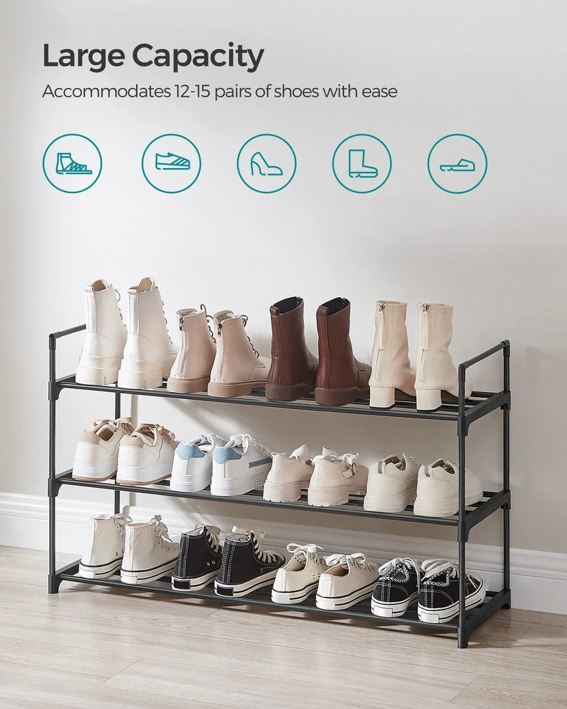 Shoe Rack, 3-Tier Shoe Storage Organizer, Metal Shoe Shelf, 12 to 15 Pairs Shoes [Holds a Lot] Keep your shoes in order and easy to access with this 11.8"D x 36.2"W x 21.3"H shoe rack. It’s spacious enough to fit up to 12 pairs of men's or 15 pairs of women's shoes [Robust and Durable] Connected by quality plastic connectors, this 3-tier shoe shelf made of thick metal tubes holds up to 11 lb per tier, giving your footwear a reliable home [Easy to Assemble] Thanks to a simple structure, numbered parts, and easy-to-follow instructions, you’ll set up this shoe organizer in no time and without any tools! [Stackable] Simply remove the crossbars on top, then you can stack one shoe storage organizer on top of the other to create more space [Fits Various Places] Simple lines and a space-saving figure make this metal shoe shelf a perfect storage solution for your entryway, bedroom, closet, or even your living room Shipping We offer FREE shipping on all orders! We ship within Three business days of payment, usually sooner. We use a selection of shipping services such as UPS, FedEx, USPS etc. We only ship to the lower 48 states, no APO/FPO addresses or PO Boxes allowed. Local pickups and combined shipping options are not provided at this time. Return You can return a product for up to 30 days from the date you purchased it. Any product you return must be in the same condition you received it and in the original packaging. Please keep the receipt. Payment We accept payment by any of the following methods: PayPal Please pay as soon as possible after winning an auction, as that will allow us to post your item to you sooner! Feedback Customer satisfaction is very important to us. If you have any problem with your order, please contact us and we will do our best to make you satisfied. Contact Us If you have any queries, please contact us via ebay. We usually respond within 24 hours on weekdays. Please visit our eBay store to check out other items for sale! Thank you for shopping at our store.