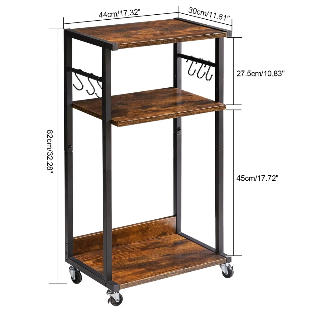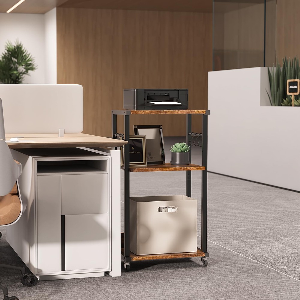 Tall Printer Stand HPT002H 3 Tier Storage Design: The top space of the computer stand is great for the printer and fax machines. The next panel and 6 S-Hooks can store your work supplies, stationery, and documents. And the space below is suitable for the computer host and Shredder. The second layer adopts an adjustable layer board design, which can be suitable for storage needs of different heights Sturdy and Heavy Duty: The CPU stand comprises MDF wood panels and heavy-duty iron frames, which ensures strong stability. The sturdy metal frame can firmly support items placed on the home desktop printer stand. For home office as an great addition to the desk space Easy to Move: Equipped with four wheels that can turn 360 degrees, two of which can be locked. When you need to work, you can lock the wheels and fix them on the edge of your desk. It is also very convenient to move large computer hosts and Paper shredder Easy to Assemble: Comes with all tools needed, including screwdriver, and all parts are labeled with a sticker matching to instruction. You can definitely complete the installation easily and smoothly by following clear and detailed instruction Product Size: 32.28*17.32*11.81'' , Use a clean and damp cloth to wipe the surface