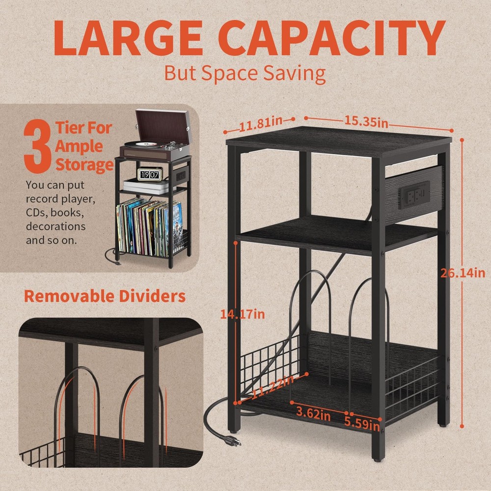 Experience unparalleled versatility with our bed side table. The tabletop and second shelf are large enough to hold a variety of record players and audio essentials. The black side table features U-shaped shelves on third shelf for easy access and sorting of vinyl records. In addition, the small bedside tables have been upgraded with side wire mesh to prevent accidental slips. The nightstand with charging station is a game changer. With 2 USB ports and 2 outlets, the night table effortlessly connects to your record player, speakers, or other devices without a mess of cables. No more struggling to find a power source. Plus, the small table stand is lightweight and easy to move around. The black end table is made of sturdy frame and wood planks for strong, long-lasting support: 100 lbs. for the hard top and 50 lbs. for the second/third shelf. Adjustable table legs level for added stability. Small side table for small spaces, the side table with storage features an airy/compact design that blends seamlessly into tight spaces. Unleash unrivaled versatility with our tall side table. Thanks to the removable U-shelf, the living room side tables offer even more possibilities for books, magazines, photo albums or cute trinkets. Not only is it a record rack with vinyl storage, but it can also be used as a living room end tables, end tables bedroom, office side table or decorative shelf to brighten up your decor. The tall end table comes with detailed instructions, labeled parts, assembly tools and corresponding assembly video for quick assembly. If you have any questions, please feel free to , our service team will answer the e-within 12 hours. The end table with storage has 12-month Quality Assurance! Always by Your Side. Overall Size:15.35"L × 11.81"W ×26.14"H. The 3rd Open Shelf Size: 11.22"W×14.17"H, designed for all kinds of vinyl(7/8/10/12 inch). THREE TIER END TABLES: Elevate your audio journey with the 3 tier record player stand with vinyl storage. The tabletop and 2nd shelf are ample to hold various record players and audio essentials. And the 3rd open shelf features U shape rack for easy access and sorting of vinyl records. Plus, the bedside table is upgraded with side wire mesh to avoid vinyl accident slips. END TABLE WITH CHARGING STATION: The charging nightstands are game-changers. With 2 USB ports and 2 outlets, the small side table can effortlessly connect your record player, speakers, stereo, or other devices without cables chaos. No more struggling with power supply searching. Moreover, it is lightweight to move with ease. VERSATILE SIDE TABLES: Experience unrivaled versatility with our small nightstand. Thanks to the removable U shape rack, it unlocks more storage possibilities for books, magazines, albums or cute trinkets. More than a small table, it also serves as bedroom night stands, side tables living room, small office table or decorative stand to brighten your decor. STURDY & SPACE SAVING: Crafted from sturdy frame and wood board, the side tables bedroom boasts stalwart & lasting support: 100lbs for hard top and 50lbs for 2nd/3rd shelf. Adjustable feet can level to add extra stability. With airy/compact design, the end tables living room seamlessly blends into small space. Let the music flow freely without space constraints!