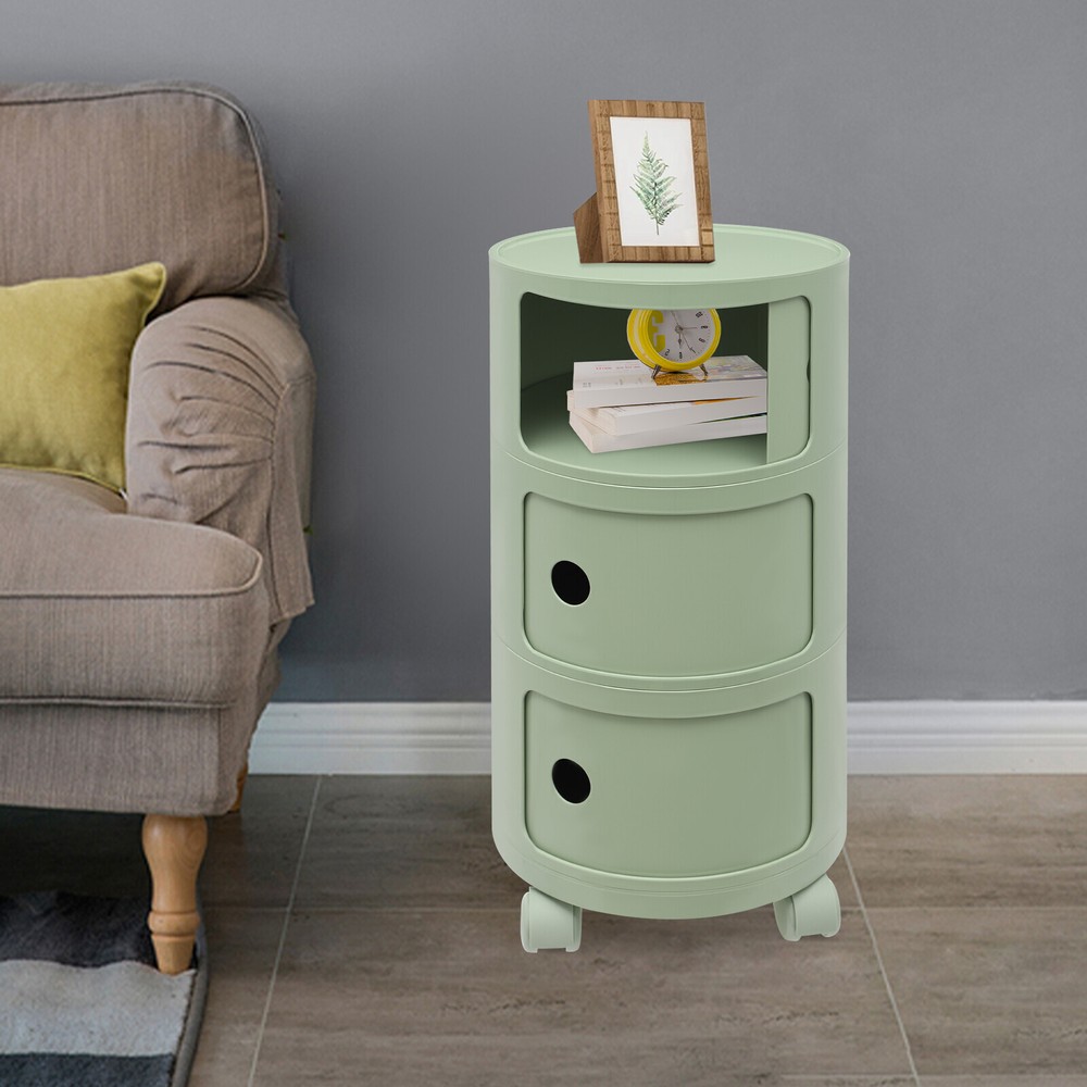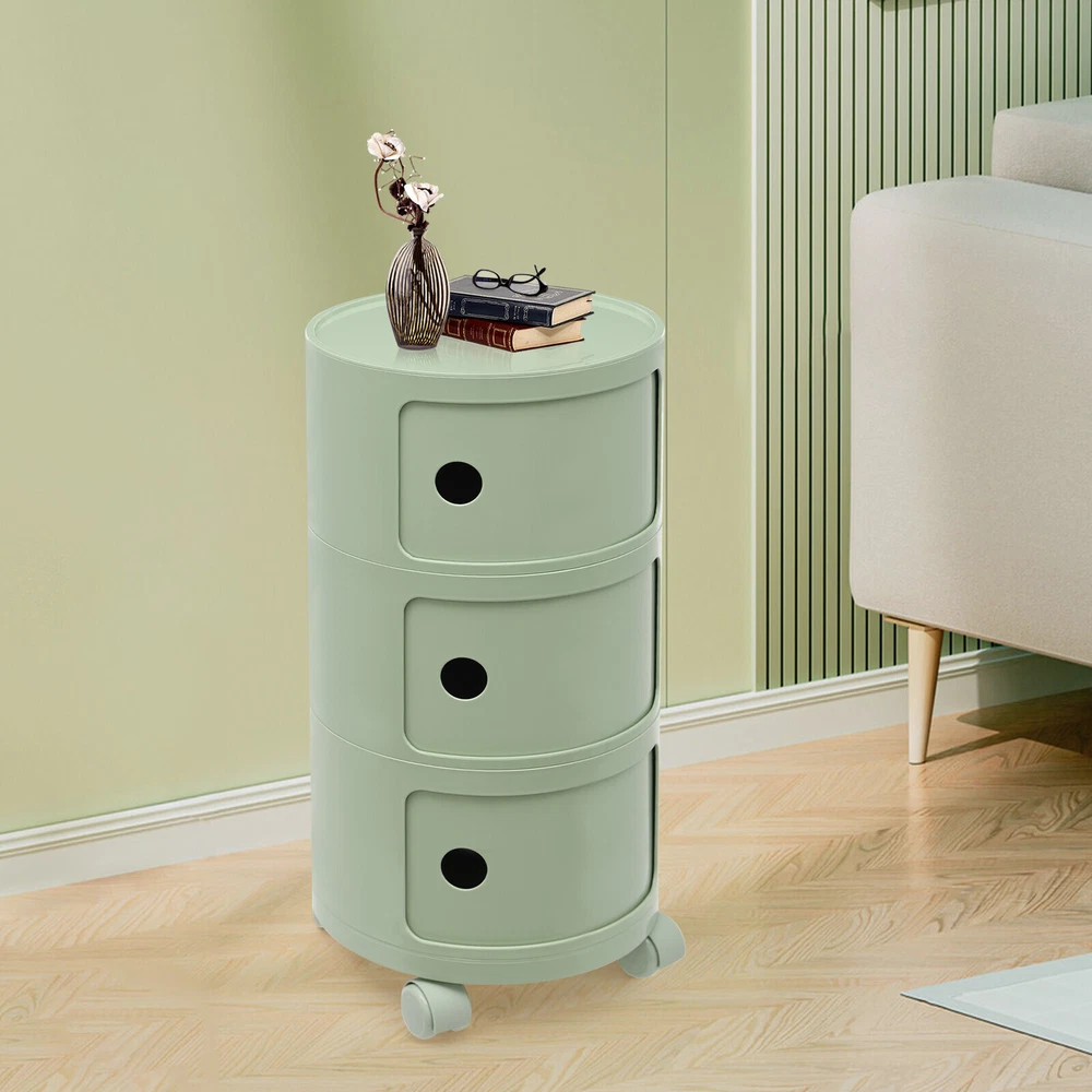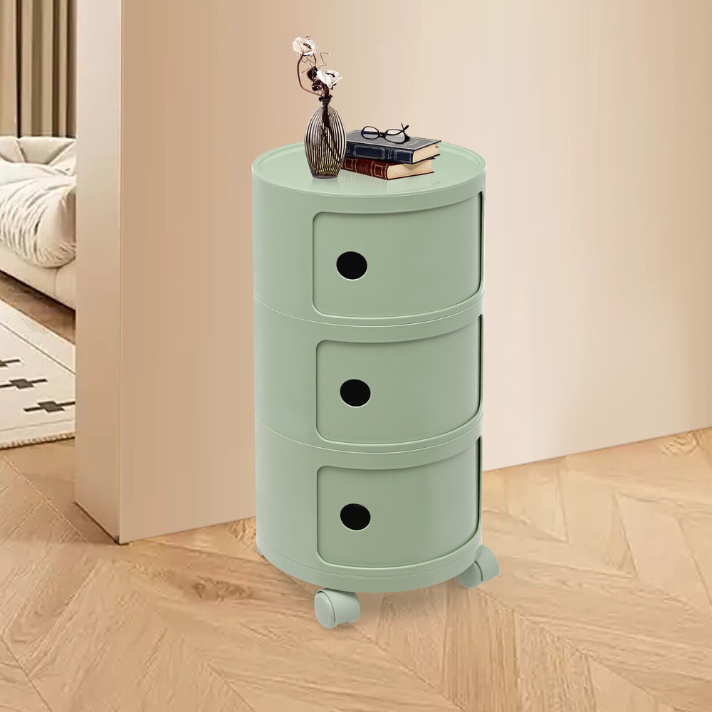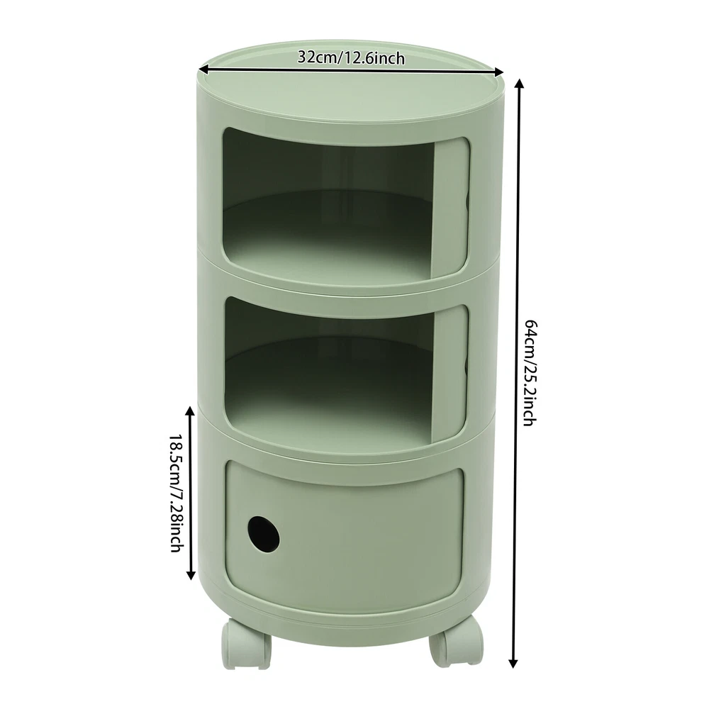 3-tier Round Bedside Cabinet Multifunctional End Table Storage Cabinet w/Wheels Description Are you still struggling with a lack of storage space above your home? Here comes the good helper. This 3-tier bedside cabinet boasts a large size with 3 cabinets and a top space to provide you with enough storage space. The exquisite appearance makes it the finishing touch to a dull room. It stands quietly where you need it and brings you a sense of well-being within reach. Key Features High-quality Material : Made from high-quality ABS material, this product is wear-resistant , safe, water-resistant , sturdy, and durable, so it can withstand the test of time well. Thoughtful Design: Each tier is designed with a sliding door that pushes and pulls smoothly for easy access while preventing items from dusting and enhancing privacy. High Load-Bearing Capacity: The sturdy structure, thickened material, and stable designed wheels allow it to withstand a weight of up to 88.18 pounds without collapsing, allowing you to use it with confidence. Flexible to Move: You can easily move the product anywhere you need it thanks to its four four wheels, giving you a lot of mobility and convenience. Ample Storage Space : The 3-tier product and a wide top platform allow you to classify and store various items, decorations, etc., creating a clean and comfortable living environment for you. Each tier is 7.28 inches in height, providing ample storage space for your usage needs. Powerful Function: This product significantly combines practicality and aesthetics, it is very suitable for many places with storage and tidying needs. It can not only help you organize your room in order, and keep it tidy at all times, but also as an embellishment to make your home more attractive. Fashion Appearance: It adopts a light green color, which is simple, elegant, and very fashionable. Not only is it modern style, but it can also decorate the house. Enjoy Bedtime: After you wash, heat a cup of milk, lie on the bed, select a book(not included) from the bedside table, and enjoy a comfortable bedtime before the end of the tired day. Effortless Cleaning : A smooth surface and simple structure are convenient for cleaning to save you time. Ideal Gift: A simple but elegant design provides natural charm, leading the product to integrate into various decoration styles, so it is a suitable gift for others. Buy with Confidence: We stand behind all our guests and look forward to assisting you with your purchase. It is our pleasure to answer your confusion and questions. The end of the story between us is not "we sell and you buy". Details Round Corners: Compared with traditional square corners, an arc design can better ensure safety during installation and use. Raised Bottom: The raised bottom effectively prevents moisture and facilitates cleaning. Protective Guardrail: It effectively reduces the falling of items and serves a decorative purpose. 3 Round Holes: They facilitate opening and closing cabinet doors. Application It is suitable for indoor places such as the living room, office, bedroom, and cloakroom. It can be used as a bedside table, sofa side table, or storage cabinet for storing cosmetics, books, newspapers, magazines, cups, sundries, etc. Specifications Material: ABS Style: Modern Color: Light Green Mount Type: Freestanding Shape: Round Indoor/Outdoor Usage: Indoor Assembly Required: Yes Number of Tiers: 3 Number of Wheels: 4 Load Capacity: 40kg/88.18bs Gross Weight: 3.3kg/7.28lbs Net Weight: 2.8kg/6.17lbs Product Size(D*H): 12.6*25.2 in Each Tier Height: 18.5cm/ 7.28 in Package Size: 61*35.5*35.5cm/24.02*13.98*13.98in Package Included 1* 3-tier Bedside Cabinet 4* Wheels Notes Please carefully check if the size is suitable before placing an order. Please use the product within its weight capacity to avoid damage. Please note that this product does not include items such as books and newspapers. Please allow the slight color difference caused by the shooting light and 1-3cm error due to manual measurement, and make sure you do not mind before you order. Brand CNCEST UPC 763508618671 Item Height n/a Item Length N/A Item Width N/A Type Nightstand