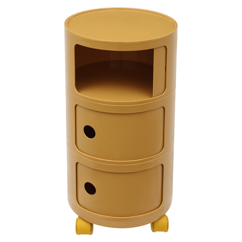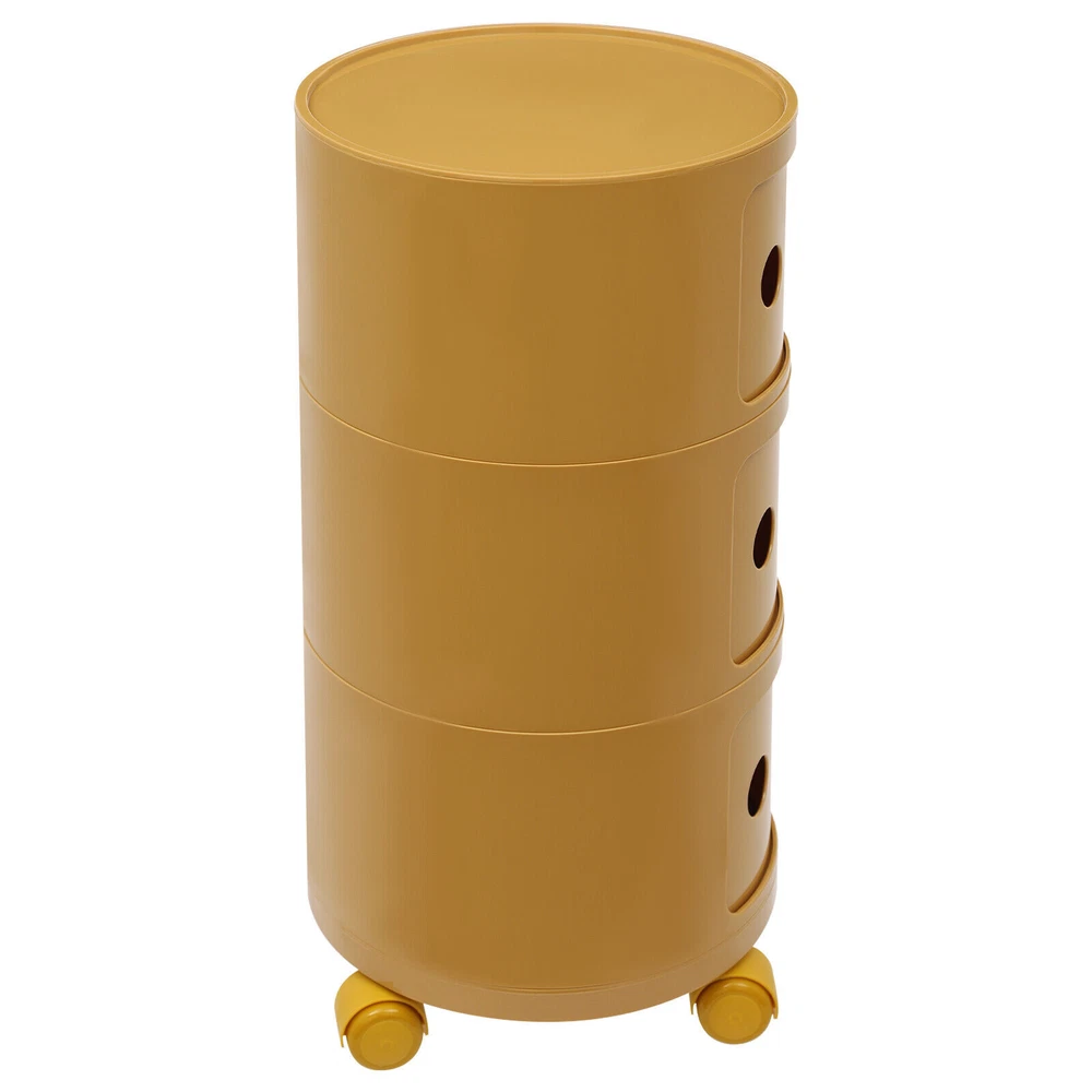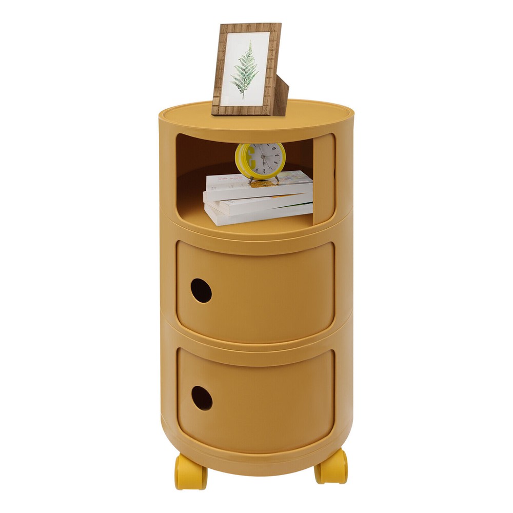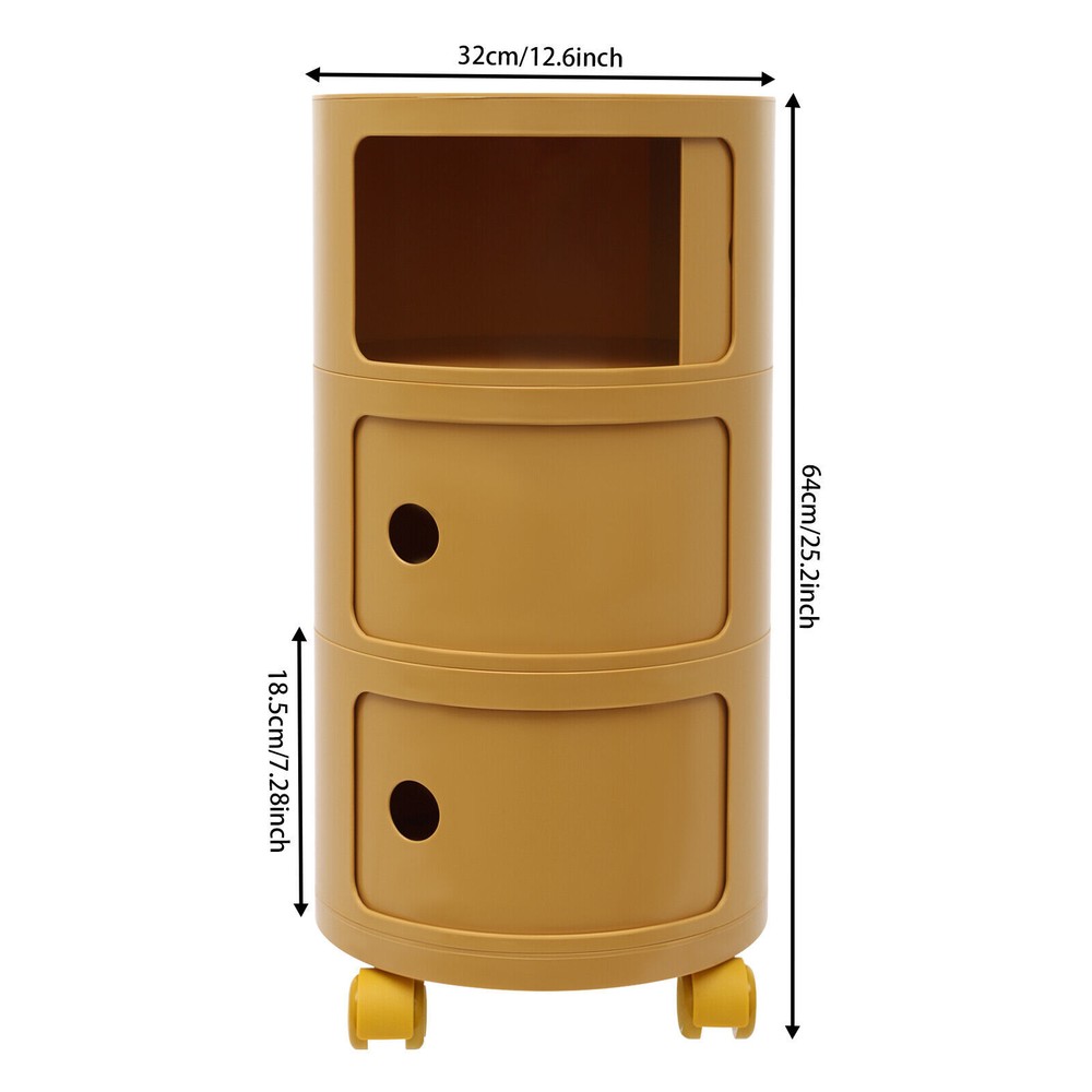 This round storage end table is a game-changer for small spaces! The three-tier design offers plenty of room for books, snacks, or bedside essentials, while the cheerful yellow color adds a fun pop to any room. The wheels make it easy to move around, and the sturdy ABS construction holds up to 88lbs—perfect for holding drinks, decor, or daily clutter. Assembly was quick, and it looks way more expensive than it is. Love how versatile it is for bedrooms, living rooms, or even as a portable office organizer!