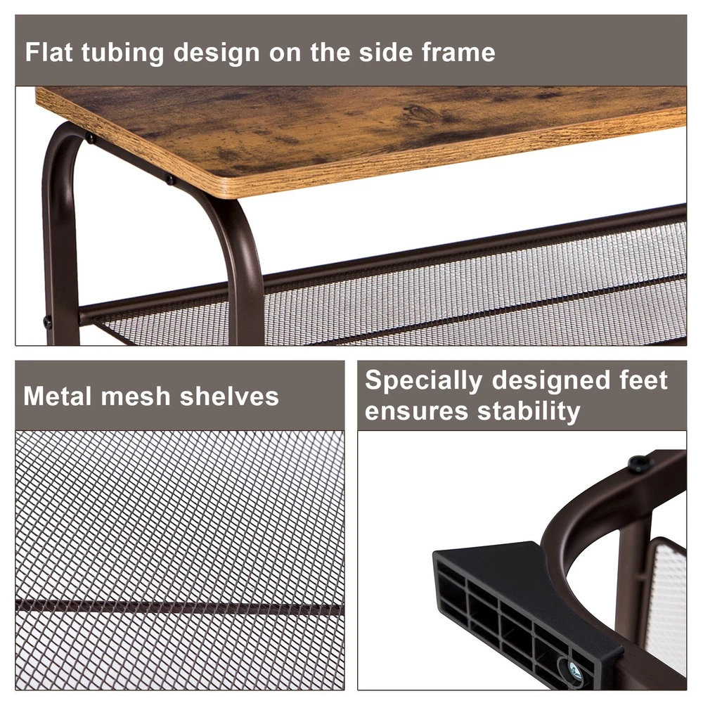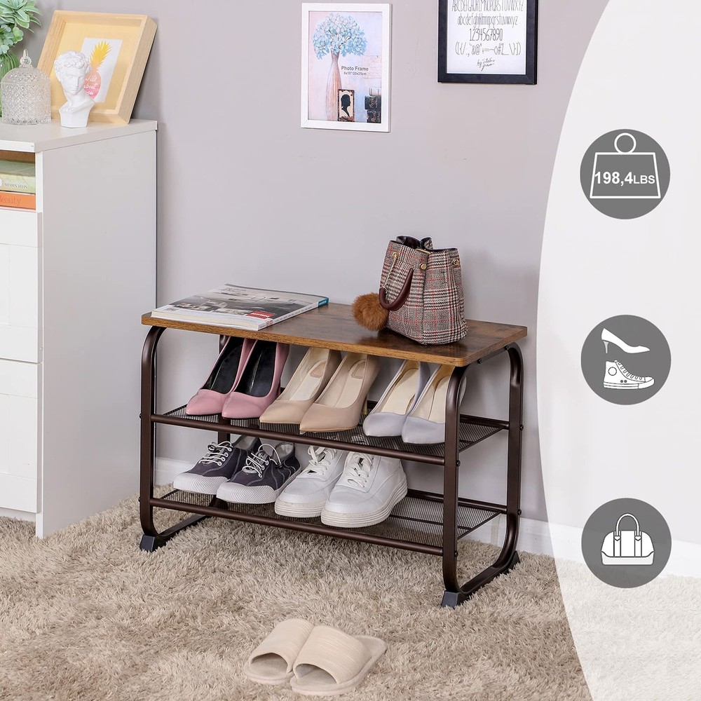Always wasting time looking for the right shoes in a big, messy pile? Hopping around on one leg to put on your shoes before heading out? Longing for a tidy, magazine-like entryway with everything organized? This 3-tier shoe bench is the answer you’re seeking! Rescue your shoes from the piles and provide them a handy perch. Next time, sit on the bench, grab the right pair, tie your shoes, and go! Quality—The steel frame and particleboard surface give this bench a sturdy, stable structure that supports up to 198 lb. Storage—Your sneakers, flats, and high heels go on the 2 mesh shelves, and bags go on the top shelf. Holding about 6-8 pairs of shoes, it takes little floor space. Look—With two tones of rustic brown and bronze, this industrial shoe rack is a hallway beauty that will wow your guests! Specifications: - Color: Rustic Brown, Bronze - Material: Particleboard, Steel - Product Size: 11.8”D x 26.0;W”W x 17. 7”H (30 x 66 x 45 cm) - Top Board Size: 11.8”D x 26.0”W (30 x 66 cm) - Product Weight: 11 lb (5 kg) - Max. Static Load Capacity: 198 lb (90 kg) Package Contents - 1 x Shoe Bench - 1 x Assembly Kit - 1 x Instructions Notes: - For daily maintenance, wipe the product with a damp cloth. - Children are not allowed to climb or stand on the product; kids under 6 years old should use it with adult supervision. [Make It Happen] Before: Shoe piles eat up your hallway, blocking your entry and a way to a tidy home. After: Have a seat, take your shoes off, and put them away. What happened? You got this 3-tier shoe bench! [Assembly? Easy Job] You don’t have to go a long way to have this shoe rack in your hallway, as the assembly is only 3 steps! The clear instructions and labeled parts help you set it up in leaps and bounds [Made with a Mix] The frame? Steel. The top surface? Particleboard. This shoe storage organizer is the result of a perfect combination of robust, durable materials, offering you a stable structure that supports up to 198 lb [Storage with Style] Don’t sacrifice style when it comes to storage. Instead, invite this chic, industrial piece in. The 2 metal mesh shelves can hold about 6-8 pairs of shoes, while the rustic brown surface stages purses. Is this a cutie? We think so! [What You Get] A shoe bench and rack in one that offers 3 storage shelves to clear the mess in your hallway and a comfortable seat for your family or guests to change their shoes