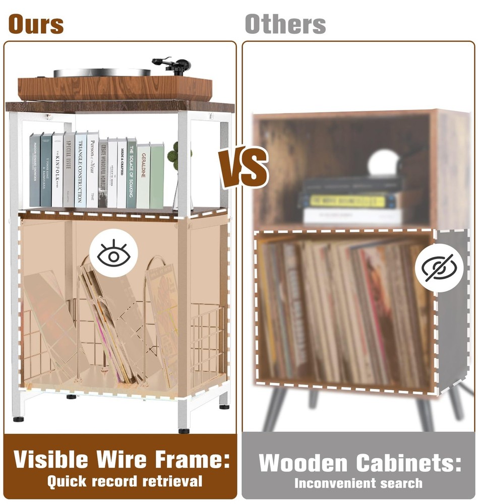 3-tier record player stand features vinyl record storage, which can be used to your turntable, speakers, albums, CDs, books, magazines, collectibles, etc. The large storage space can fulfill all your diverse needs. It's an excellent gift for those who love vinyl records! On the wooden phonograph stand, it allows you to separate the items on each tier, making it more convenient to access them. The modern and minimalistic style matches home decor, making it an ideal choice for a turntable stand, vinyl record storage cabinet, bedside table, or coffee table in living rooms, bedrooms, and offices. Specification: Material: Durable Metal + Wood Product Size: 11.8’’ D x 15.8’’ W x 26.2’’ H Product Weight: 14.8 lbs Max Load Capacity:75 lbs CD Storage Quantity: Hold up to 100 albums Package Contents: 1 x Record Player Table 1 x Screw Package 1 x User's Manual Warm Tips: Children are not allowed to climb on or play with the product! Don't sit on the table! If you find the table a little wobbly after assembly, please adjust the foot pads to improve stability. Multi-Functionality: This record player table boasts an expansive range of applications due to its multifunctional design. Measuring 11.8’’ D x 15.8’’ W x 26.2’’ H, it serves as an efficient record storage table that seamlessly organizes all your vinyl records, albums, and CDs. Not only can it function as a vinyl record display table or a record player cabinet, but it also doubles as a turntable stand, nightstand, or end table - perfect for any living room or bedroom setting. 3 Layer Record Player Stand: Besides being a stand for your turntable, the table helps keep your precious vinyl records well-organized. The second and third tier can easily up to 100 albums in total. The designated compartments or shelves allow for convenient categorization based on genres, artists, or release years. This feature ensures easy access to your records and enables you to maintain an orderly collection. High-Quality Material: The table is crafted from high-quality wooden and metal to ensure durability and longevity. The robust construction can withstand max load weight 75 lbs of turntables and substantial record collections. This end table comes with 4 adjustable foot pads which can be easily adjusted to fit the height of your needed. Additionally, the foot pads can protect your floors from scratches and scuffs. Irrespective of the frequency of use, it promises to stay stable and stylish. Aesthetic Appearance & Practical: This record player table is a visual masterpiece that blends into any interior setting. With its vintage design and modern accents, it enhances the aesthetic appeal of your room, while complementing modern décor trends seamlessly. The second layer has an open design, which is convenient for access. It can snacks, books, or other items within reach. The third layer Iron wire frame and U-shaped wire can protect your vinyl records from falling or slipping. Easy Assembly: The record player table prioritizes the user's convenience with easy assembly instructions. All necessary tools are included, allowing even those with minimal DIY skills to set it up effortlessly. By opting for this table, music lovers who prefer a quick and hassle-free setup can start enjoying their favorite tunes without a long, complicated assembly process.