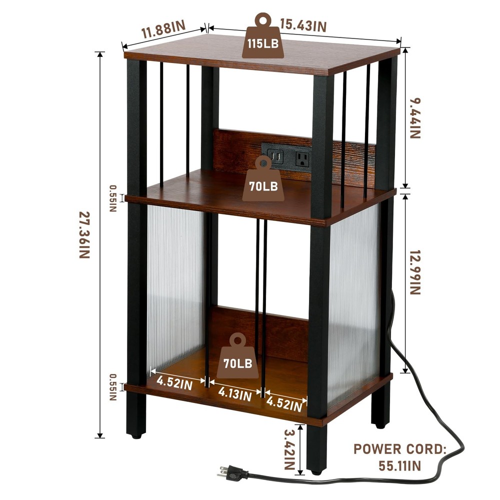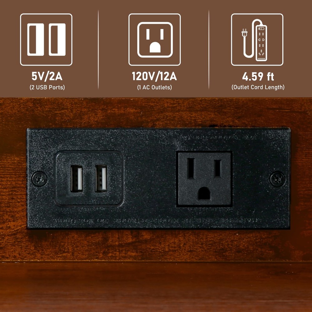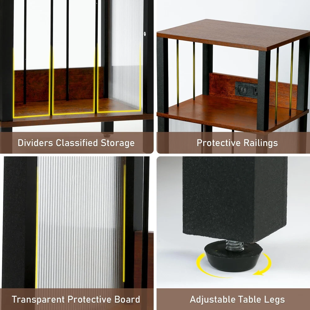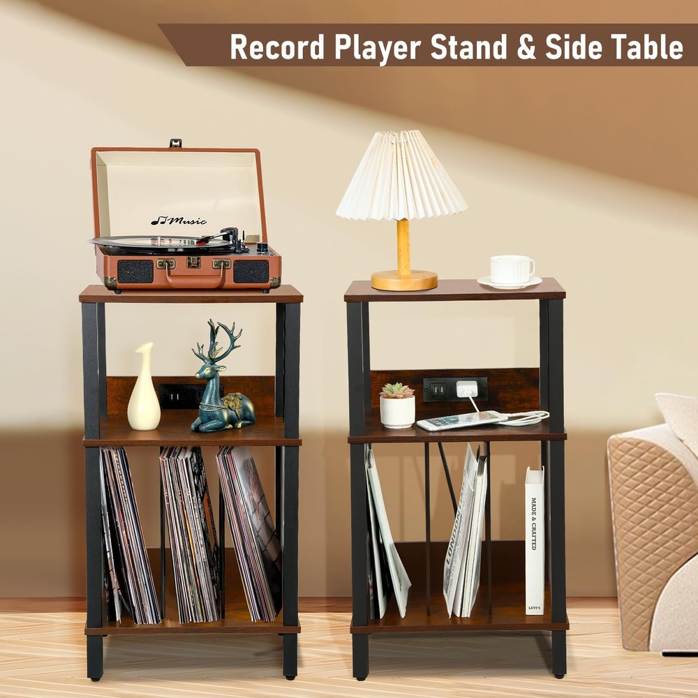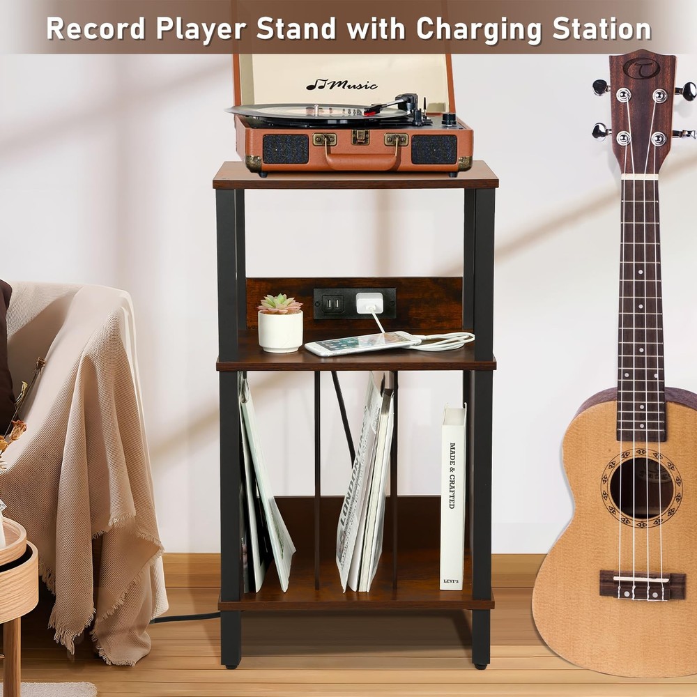 Record Player Stand with Charging Station, 3 Tier End Table with Vinyl Record Holder, Record Shelf Up to 100 Albums, for Living Room, Office.(Rustic Brown) Record Player Stand with Charging Station: The record player table has 1 AC outlet and 2 USB ports to simultaneously charge your record player, cell and other electronic devices. Plenty of Display Space: The record player table has 3 tiers of space, the third tier is divided into sections for storing records, magazines, books and file , and can hold up to 100+ records, the second tier with a guard rail and the third tier with a clear guard provide you with plenty of storage space while preventing items from falling out. More Use Scenario: This small side table can be used as a record player stand, or as a side table for the living room, office, retro design can be perfectly integrated into a variety of decorative styles, adding beauty to your living environment. Simple yet Smooth: The Vinyl Storage Cabinet has individually numbered parts and instructions that make the assembly process so simple that it can be assembled in minutes without help. Complete Service: You will receive the record player stand, installation instructions and installation tools, in the process of assembly and use of any problem you can at any time, we are the first time to help you solve the problem, the moment you receive the product is the beginning of our service.