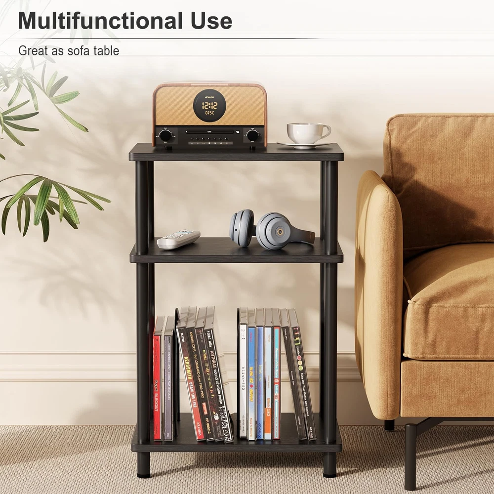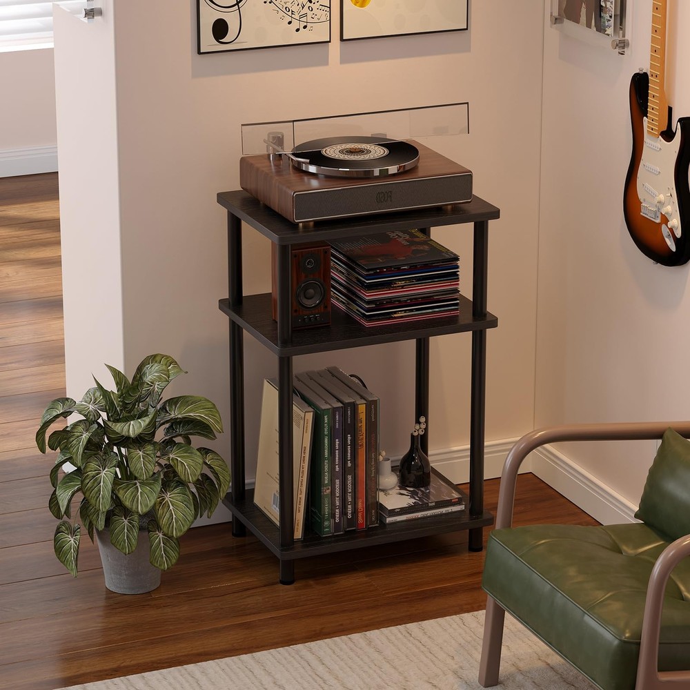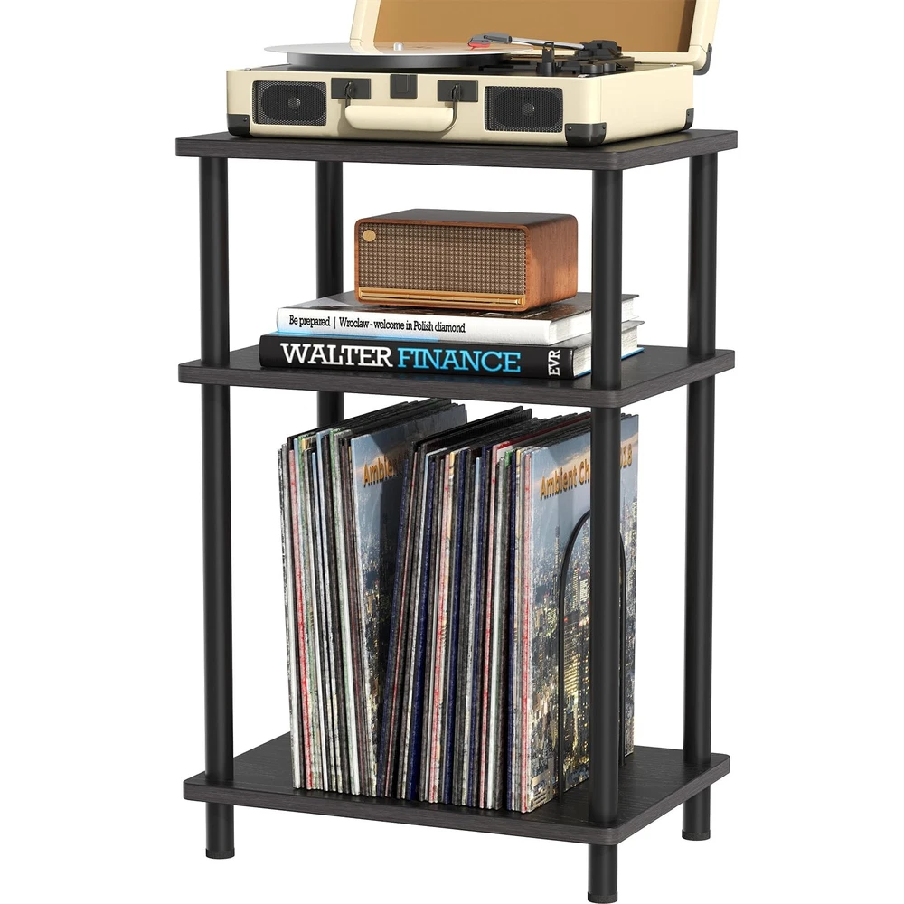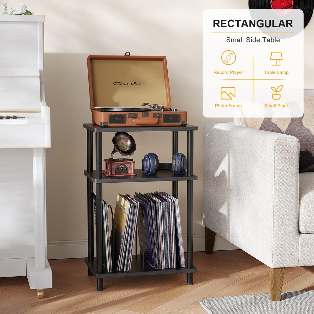 end table Adjustable and Customizable Storage Space: This stylish stand features three tiers, with a spacious top that easily accommodates record players of all sizes.The U-shaped iron pieces on the third tier are removable, allowing you to adapt the storage to your needs. When fully removed, it functions as a standard side table, while installing the iron pieces transforms it into a dedicated record player table for storing vinyl records and albums. Versatile & Convenient End Table: This end table is perfectly sized to serve not only as a record player stand but also as a nightstand or side table for small spaces. Its classic shape and light weight makes it easy to move and reposition, allowing you to place it in the living room, bedroom, entryway, or anywhere else you need a spot for drinks, remotes, and magazines. Material & Size: Measuring 15.7"D x 11.8"W x 24.4"H, the end table is made of high-quality MDF and wood with smooth coating, which is easy to clean and waterproof. The legs of the small side table have a structure which is very stable. With a weight capacity of up to 160 pounds, this sturdy side table provides a reliable surface for your record player and various other items. Modern Turntable Stand: Featuring a blend of vintage wood grains and modern colors, this record display shelf boasts a sleek design that effortlessly complements a variety of furniture and décor styles. Its elegant appearance enhances the overall aesthetics of your room, making it a perfect addition to any space. Easy Assembly: This vinyl record turntable stand comes with clear instructions and labeled parts, making it simple to put together. You can easily assemble it in under five minutes without the need for any additional tools.