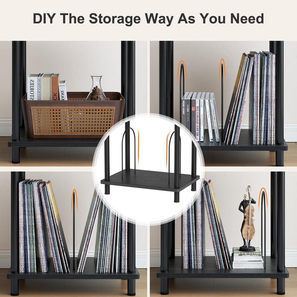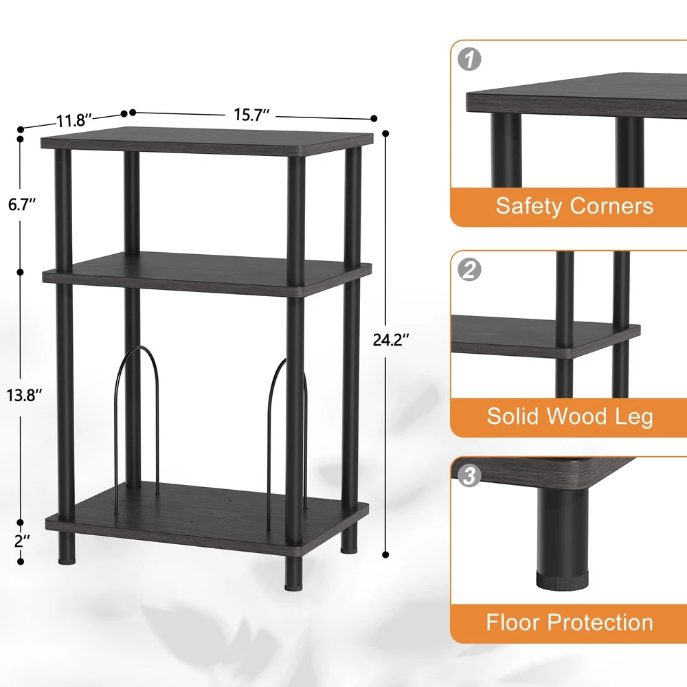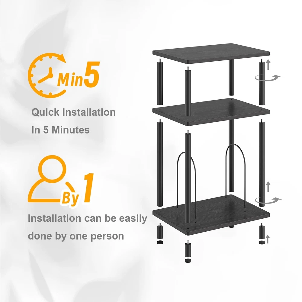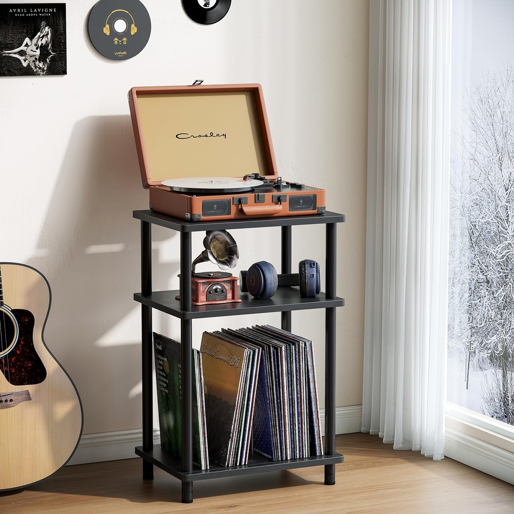 end table Adjustable and Customizable Storage Space: This stylish stand features three tiers, with a spacious top that easily accommodates record players of all sizes.The U-shaped iron pieces on the third tier are removable, allowing you to adapt the storage to your needs. When fully removed, it functions as a standard side table, while installing the iron pieces transforms it into a dedicated record player table for storing vinyl records and albums. Versatile & Convenient End Table: This end table is perfectly sized to serve not only as a record player stand but also as a nightstand or side table for small spaces. Its classic shape and light weight makes it easy to move and reposition, allowing you to place it in the living room, bedroom, entryway, or anywhere else you need a spot for drinks, remotes, and magazines. Material & Size: Measuring 15.7"D x 11.8"W x 24.4"H, the end table is made of high-quality MDF and wood with smooth coating, which is easy to clean and waterproof. The legs of the small side table have a structure which is very stable. With a weight capacity of up to 160 pounds, this sturdy side table provides a reliable surface for your record player and various other items. Modern Turntable Stand: Featuring a blend of vintage wood grains and modern colors, this record display shelf boasts a sleek design that effortlessly complements a variety of furniture and décor styles. Its elegant appearance enhances the overall aesthetics of your room, making it a perfect addition to any space. Easy Assembly: This vinyl record turntable stand comes with clear instructions and labeled parts, making it simple to put together. You can easily assemble it in under five minutes without the need for any additional tools.
