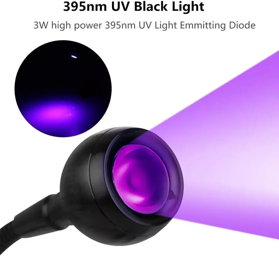 GREAT BLACK LIGHT FOR ARTWORK:This Flexible Little Black Light is pretty handy for working on art with fluroescent and phosphorescent pigments. SMALL BUT POWERFUL UV LED:3W 395NM high power LED UV Blacklight, brings flicker-free UV light, high brightness. It's designed for blacklight parties, black light art, restaurant signage. COMPACT AND FLEXIBLE: 10" Flexible gooseneck arm UV Black Fixture, you can set the light to anywhere you want to get the perfect blacklight lamp lighting, showing your arts or signs more fessional. SIMPLE AND PORTABLE DESIGNED:54" USB power cord with ON/OFF Switch, 120V US Power Adapter Included. You can use this blacklight fixture with a power bank or computer. APPLICATION:The Ultra violet blacklights are widly used for blackight poster, glow party, black paints, fluorescent paints, resin arts, ultraviolet curing, sain detection and apres gel X system
