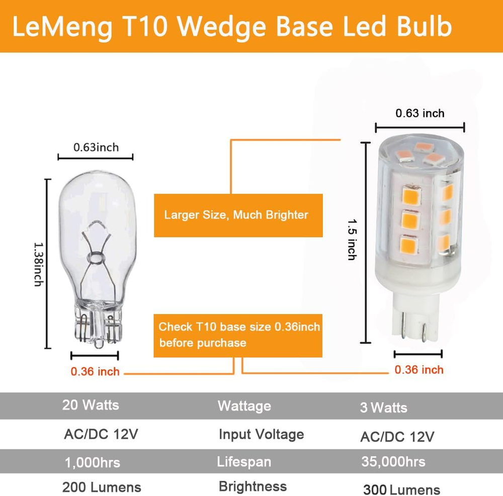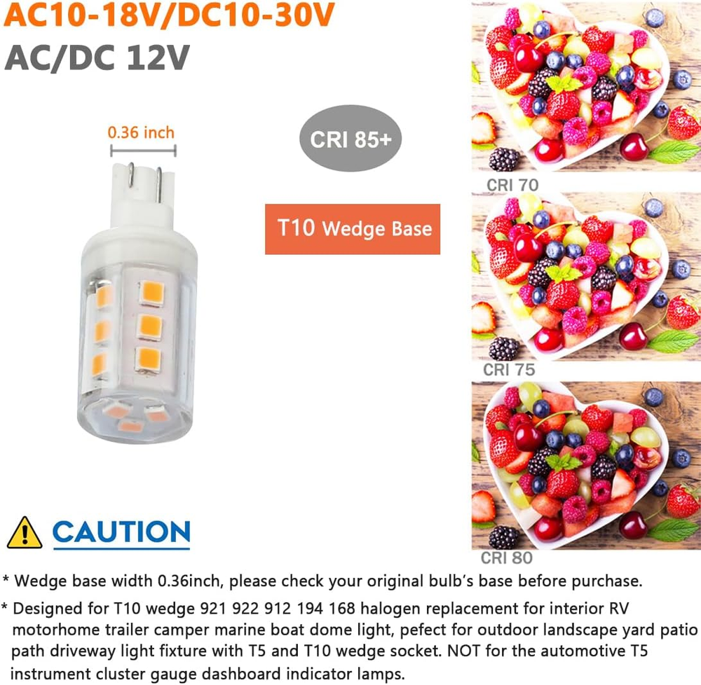 Store New Arrivals Add to Favorite View Feedback Contact 3W T10 Wedge Base 921 LED Light Bulb,2700K Warm White,12Vac/Dc Landscape Description Item model number LM-12VT10W-5W Light Source Type LED Style Modern Number of Items 1 Power Source AC/DC 12V Incandescent Equivalent Wattage 30 Watts Control Method App Light Direction Up/Down Light Bulb Base Wedge Controller Type Push Button Unit Count 6 Count Batteries Required? No Light Type LED Bulb Shape Size T3 Average Life 30000 Hours Brand LEMENG Material Ceramic Clear plastic cover Specific Uses For Product T5 T10 wedge base LED bulb for outdoor landscape garden yard patio path step deck light walkway driveway light, 921 912 922 194 168 W16W T10 Wedge bulbs for automotive interior RV camper trailer motorhome marine boat dome light truck lights Manufacturer LEMENG Item Package Quantity 6 White Brightness 300 Lumens Indoor/Outdoor Usage Outdoor, Indoor Light Source Wattage 3 Watts Brightness 300 Lumen Light Color Warm White Item Weight 2.46 ounces Connectivity Technology Normal bulb Special Features Work for both AC10-18V / DC 10-24V, 2700K warm white, 3W 300lm for 30watt halogen replacement, 2 years warranty, T10 miniature Wedge base Special Feature function(f) {var _np=(window.P._namespace("DetailPageProductOverviewTemplatesJava"));if(_np.guardFatal){_np.guardFatal(f)(_np);}else{f(_np);}}(function(P) { P.when('A').execute(function(A){ A.on('a:truncate:po-attribute-truncate-2:updated', function(data) { var isTruncated = !data.truncateInstance.getIfTextFits(); var seeMoreElement = document.getElementById('po-attribute-see-more-id-2'); if(seeMoreElement) { seeMoreElement.style.display = isTruncated ? '' : 'none'; } }) }); })); Work for both AC10-18V / DC 10-24V, 2700K warm white, 3W 300lm for 30watt halogen replacement, 2 years warranty, T10 miniature Wedge base See more Color Rendering Index 83 Part Number LM-12VT10W-3W Color Temperature 2700 Kelvin Color 3watt T10 Base Wattage 10 watts Beam Angle 360 Degrees Shape T10 Bulb Power Consumption 3 Watts Voltage 12 Volts Shade Material Plastic Product Dimensions 0.63"W x 1.5"H This T10 Wedge base width is 0.36inch, please check your original bulb's base before purchase. 12volt ac/dc T10 3Watts LED Bulb is not waterproof, please use it in dry environment/protect from water (not total enclosed fixture). Designed for T10 wedge 921 922 912 194 168 halogen replacement for interior automotive car RV motorhome trailer camper marine yatch boat lighting. Pefect for outdoor landscape garden yard patio path driveway step deck walkway light fixture with T5 or T10 wedge socket. Easy Installation: T10 miniature wedge base direct plug-and-play 12olt 24volt low voltage, much less heat than halogen bulb, can reduced operating temperatures among all LED lighting inside your travel trailer RV. 3W 300Lm AC10-18V/DC12-24V, high color rendering index 83Ra, more vivid. 2700K warm white color lights are offered with 360 degree beam angle. 2 years warranty: This T5 T10 wedge base led bulb is with good heat sink design and high-quality driver inside to ensure long lifespan, save effort and maintenance costs on changing light frequently. If any question, please click "contact the seller". Warm Tips: * This Wedge base width is 0.36inch, please check your original bulb's base before purchase. *For landscape lighting, the LED bulb is used to replace the T5 T10 miniature wedge bulbs. *For 921 912 922 904 194 168 automotive RV lighting, the LED bulb is used for T10 wedge bulbs replacement and for dome lights only, NOT for the automotive T5 Instrument Cluster Gauge Dashboard Indicator lamps. Dimmable: No Material: Ceramic PC cover Color Temperature: Warm White 2700 Kelvin Voltage: AC10-18Volt and DC10-24 Volts Base Type: T10 miniature Wedge base Wattage: 3 watts Lumen: 300Lm Incandescent Equivalent:30W CRI: >83 Size: Diameter 0.63* Height 1.5inch Application: Creating a cozy and warm white full glow ambient atmosphere, perfect for T10 wedge base 921 922 912 168 interior RV camper trailer motorhome, 5th Wheel boat interior lights, ceiling dome lights, ideal for T5 and T10 outdoor landscape step deck lights, driveway lights, path lights etc. Package Include: 6pcs x 3watts LED T10 LED Bulb non-dimmable warm white 2700K ABOUT US We offer the best prices around on high quality products. Our E-store includes media such as books, movies, music and games while offering electronics, toys, sporting apparel, clothing, tools, general home, garden items and more. SHIPPING We are always working hard to ensure your package arrives as soon as possible. Please understand that some factors like weather, high postal traffic, and the performance of shipping companies are outside of our control. We offer free shipping to the lower 48 states and ship within 2 business days of payment, usually sooner. We do not accept P.O. Boxes. Please provide a physical address. RETURNS We offer a 30-Day Return Policy on items which you are not completely satisfied with. You have the option for a full-refund or an exchange of the item. No returns are available on items shipped outside of the USA. PAYMENT We accept PayPal. CONTACT US This page content is yet to come Please ad us to your favorite seller and visit again later Thank You CUSTOMER SATISFACTION We try our very best to make sure every customer is completely satisfied. If there's a problem, message us! We're happy to help.