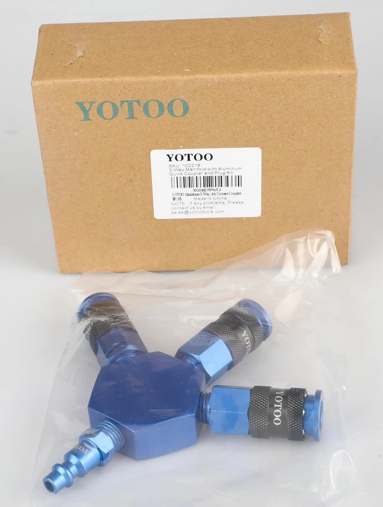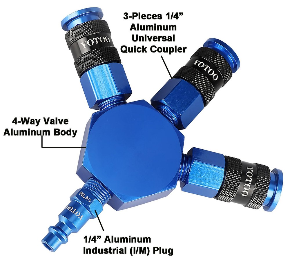 3 WAY AIR MANIFOLD: This air manifold has 3 outlets which allows to operate 3 different air tools at the same time. Meets requirements of only one air line inlet but need multi outlets. LIGHTWEIGHT DESIGN: The Quick Couplers, plug and hex flat manifold body are made of hgih quality aluminum. The lightweight design avoids to damage the air line because of heavy parts. UNIVERSAL QUICK COUPLERS: The universal Coupler connect to 1/4" industrial, automotive, and ARO plugs. Just push plugs to coupler, ONE HAND operation. Six balls design for connecting air fittings securaly and NO LEAKING. EASY TO USE: The quick connect couplers and plugs make it fast and easy to connect and disconnect air compressor or air tool fittings. WARRANTY&SUPPORT: ONE YEAR warranty. Any problem, please feel free to contact us.